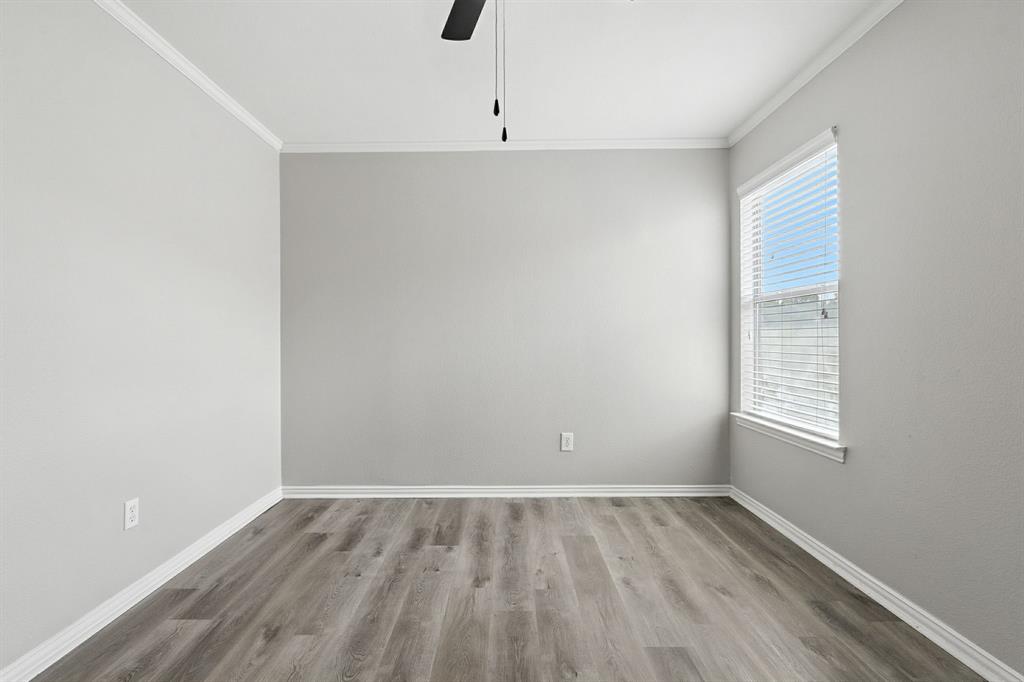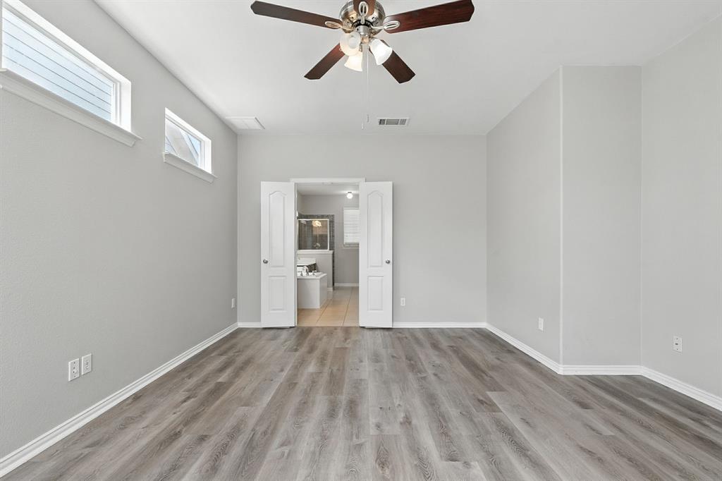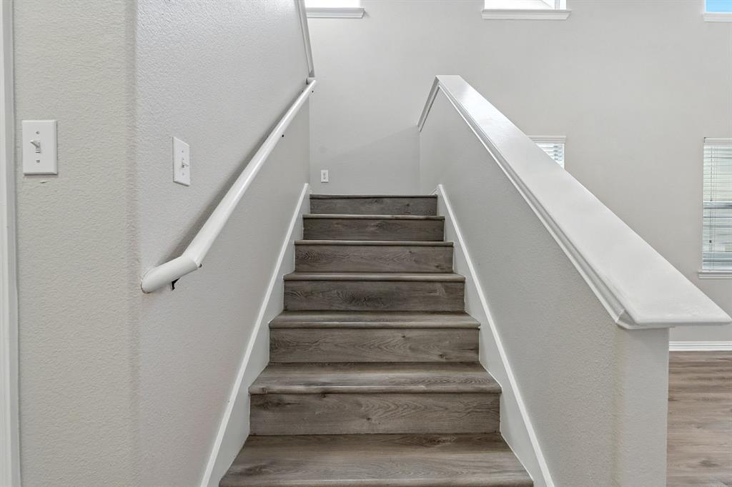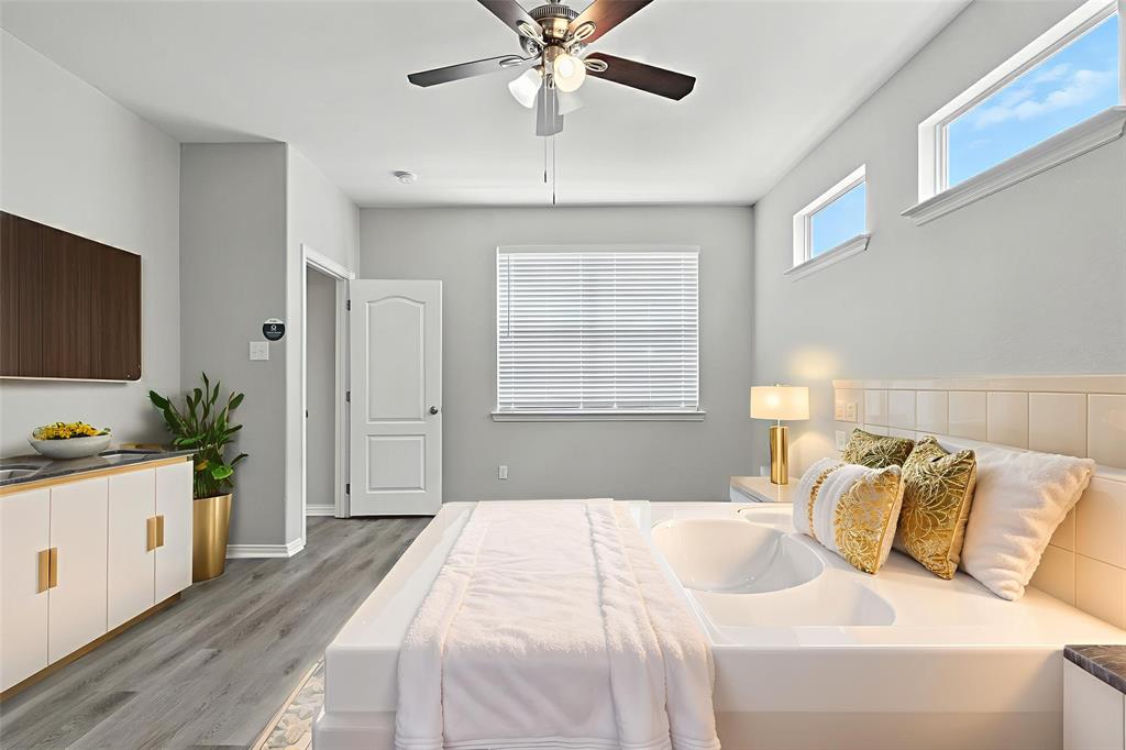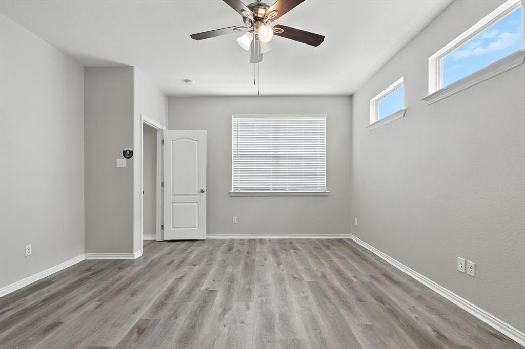 Upstairs, a generously sized primary suite includes a dual-sink vanity, soaking tub, separate shower, and walk-in closet. Additional bedrooms offer flexibility for guests, home office, or hobby space. A second living area upstairs can serve as a game room or cozy retreat. Enjoy morning coffee or weekend grilling on the covered patio, overlooking a backyard with room to run or relax.