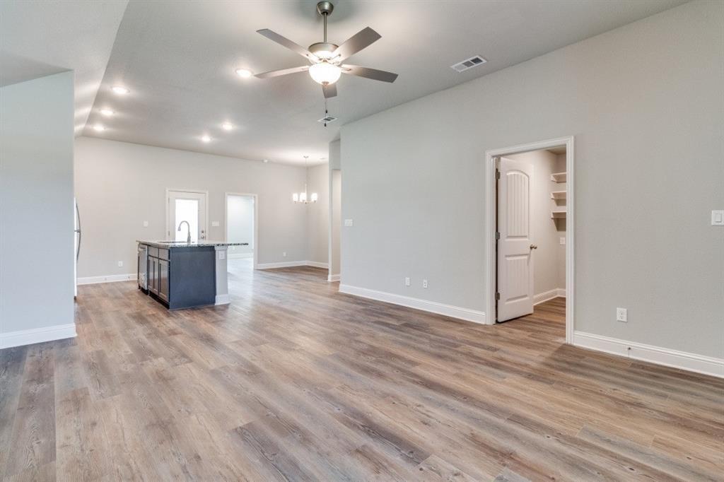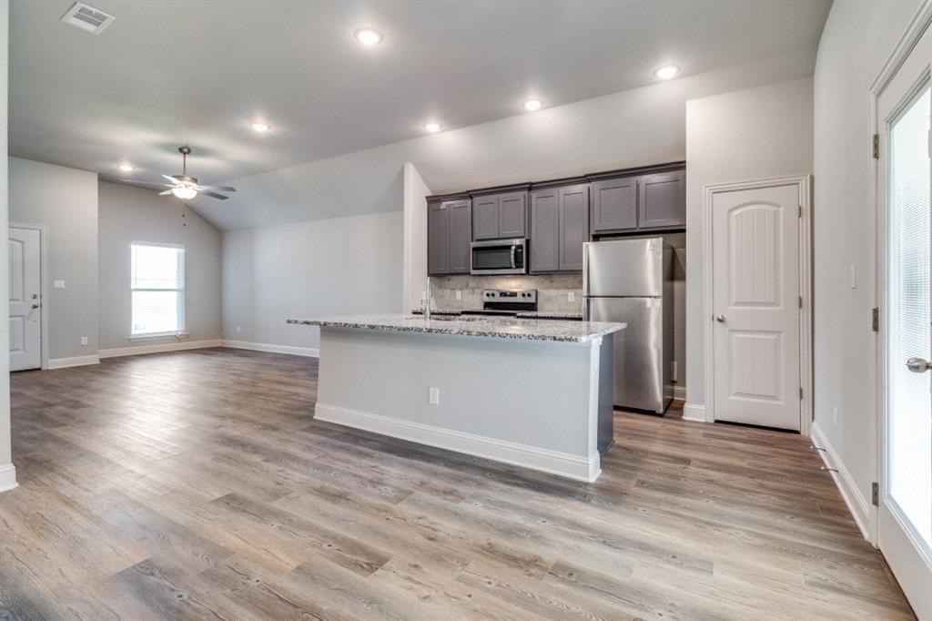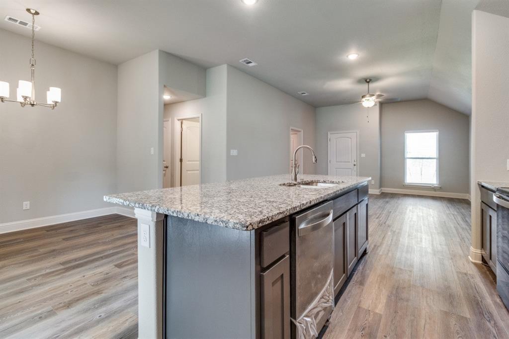 Step inside to discover luxury vinyl plank flooring throughout—no carpet!—as well as recessed lighting and decorative chandeliers that add a touch of elegance. The spacious kitchen is truly the heart of the home, featuring a center island with eat-in option, granite countertops, stainless steel appliances, and a generous pantry for storage. It’s perfect for casual meals or entertaining guests.