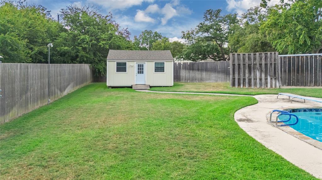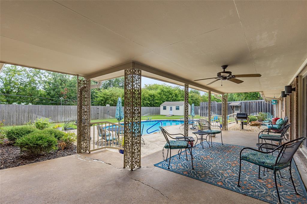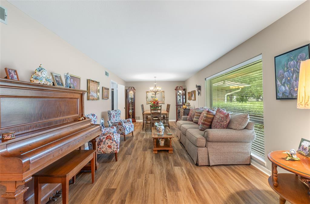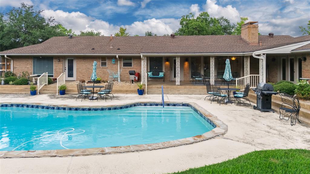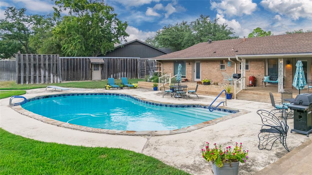 Charming and spacious home situated on over half an acre with mature trees, a sparkling pool, and two versatile outbuildings! This meticulously maintained property offers a peaceful, private retreat with countless upgrades throughout. Enjoy summer days in the resurfaced 42x18 pool (2023), complete with a 10-ft deep end, surrounded by a large concrete pool deck and covered patio — perfect for outdoor entertaining. The established St. Augustine lawn, mature trees, and sprinkler system create a lush, inviting landscape. Inside, the home features luxury vinyl plank and ceramic tile flooring throughout. The oversized primary suite overlooks the pool and boasts separate vanities, dual closets, and serene views. The split-bedroom layout offers privacy and space, complemented by two living areas, two dining areas, and a spacious kitchen with granite countertops and a new dishwasher (2025). Major system updates include: new HVAC (2023), new energy-efficient windows (2024); plus there are two water heaters to service each end of the house. The ADT security system provides added peace of mind. The property features two fully finished outbuildings for ultimate flexibility: a 25x10 workshop with electricity and spray foam insulation, and a 14x20 detached office complete with soundproof insulation, carpeted interior, with heating and cooling — ideal for a quiet home office, studio, or guest space. With abundant storage, thoughtful updates, and a resort-style backyard, this home is truly an oasis. Don’t miss your chance to own this unique and beautifully cared-for property!