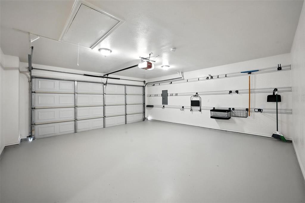 The large utility room provides space for a full-size washer and dryer, folding counter, and plenty of storage cabinetry. It leads directly into a spotless 2-car garage with built-in storage, workbench, and more.