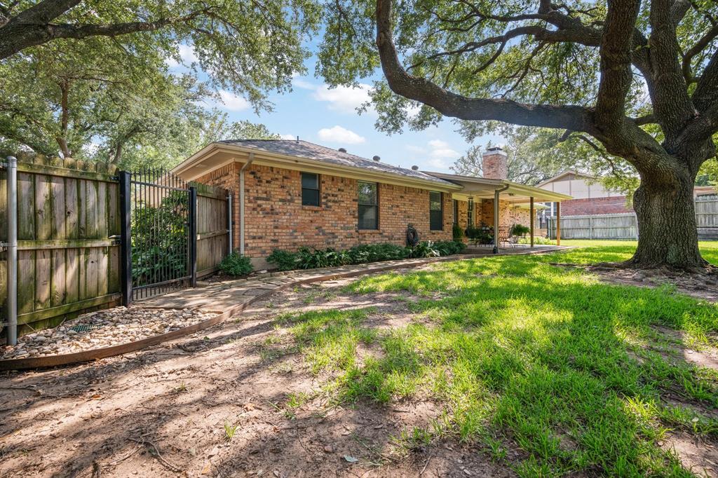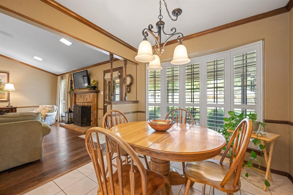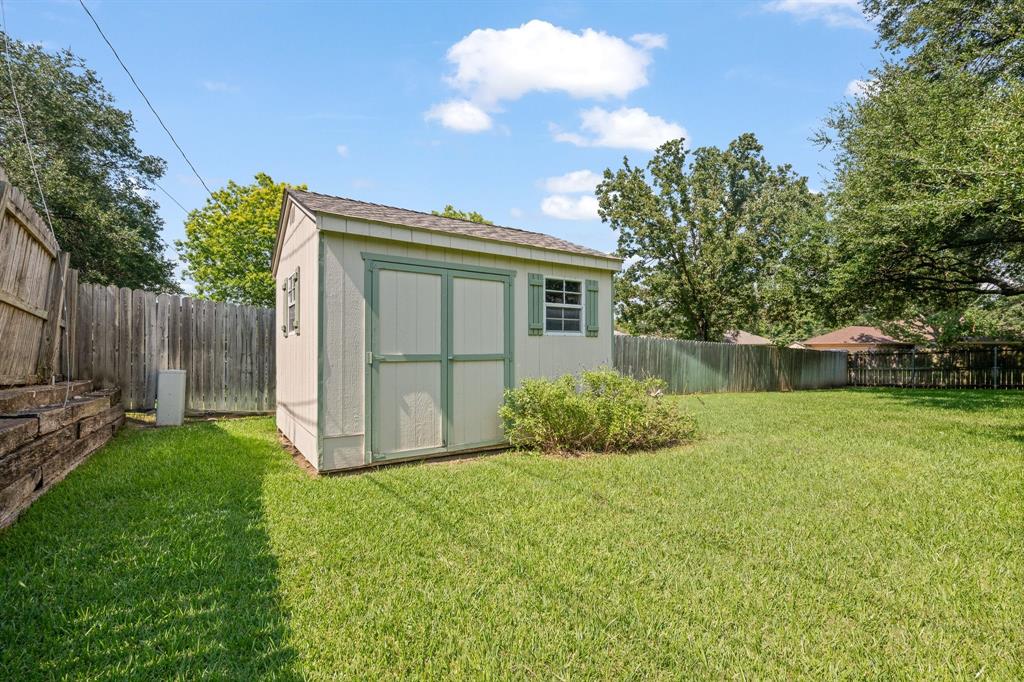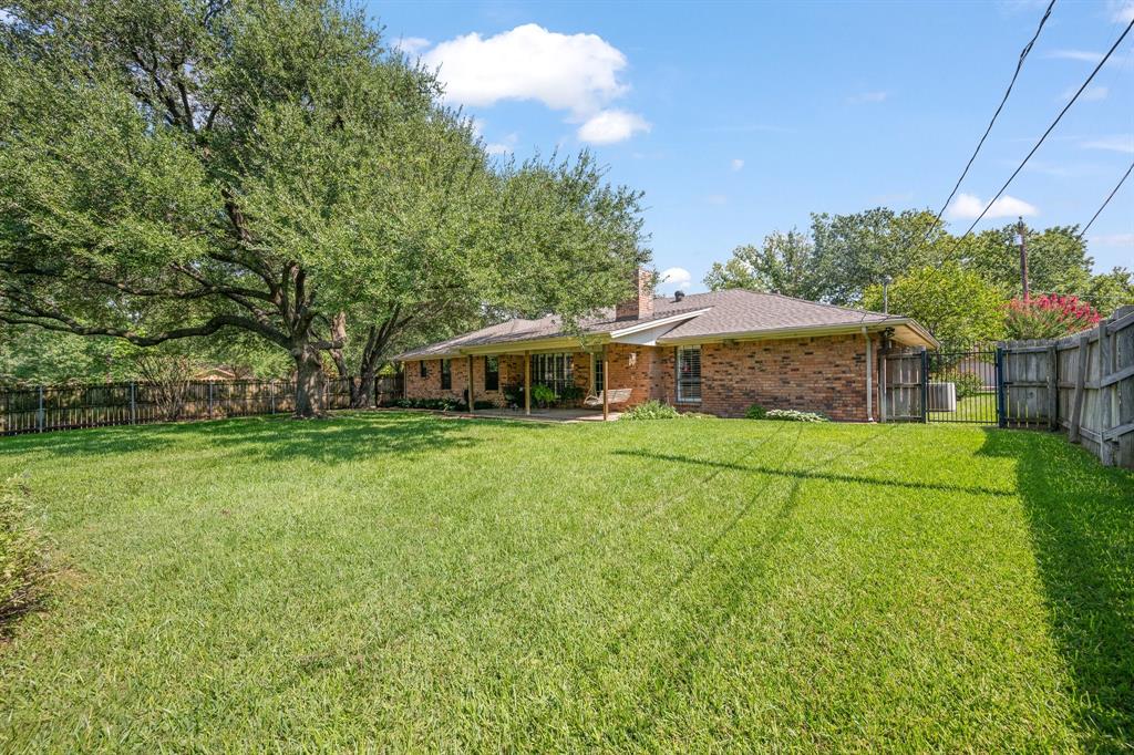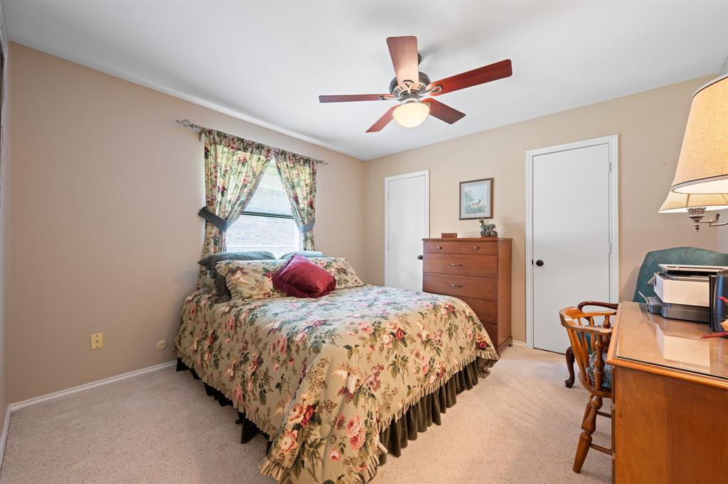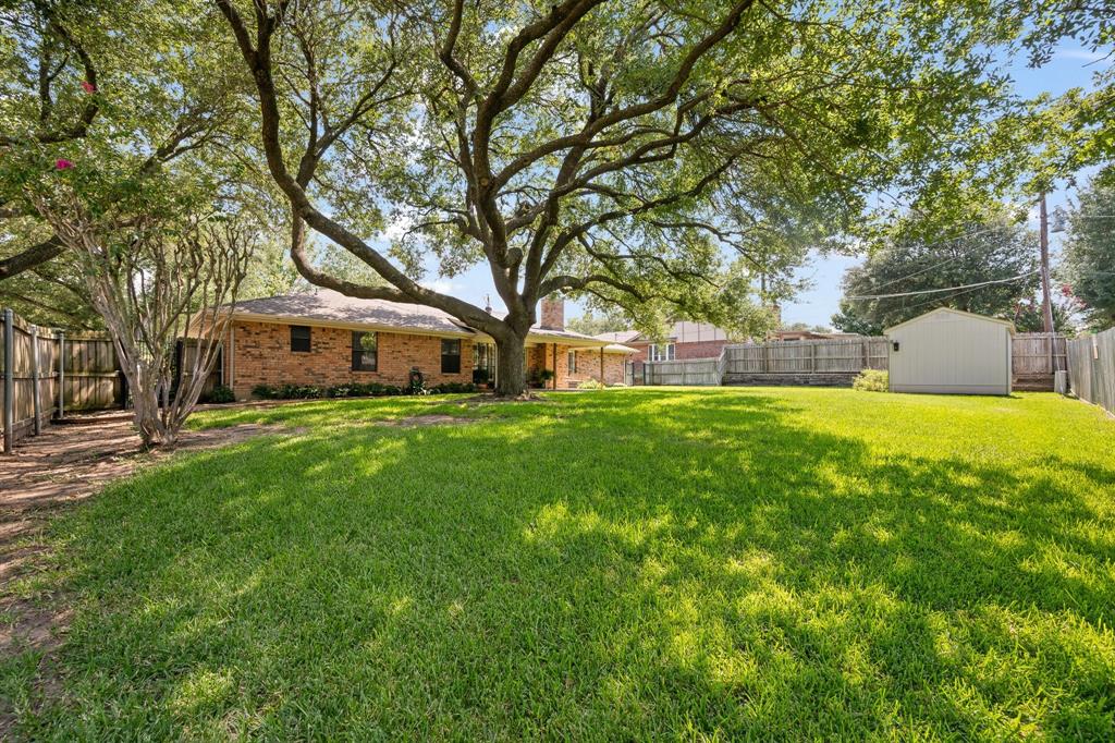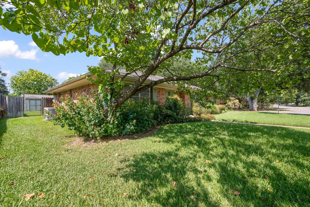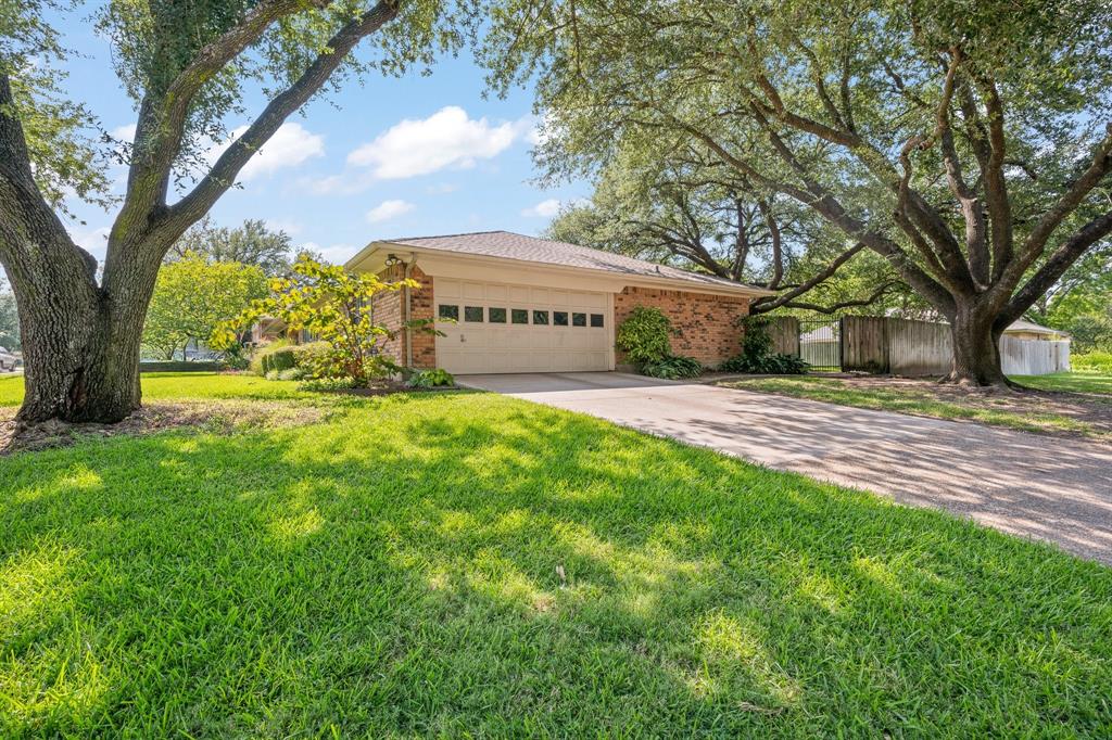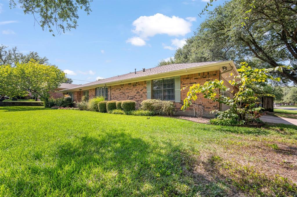 Welcome to this beautiful brick home situated on a desirable corner lot, surrounded by a lush green lawn, established trees, and thoughtfully designed landscaping. The side-entry garage adds curb appeal, while the private backyard offers a peaceful retreat. A brand-new roof was just installed in August 2025, giving you peace of mind for years to come. Step inside to a spacious living area with raised ceilings that create an open, airy feel. The cozy gas log fireplace is the centerpiece, perfect for gatherings, and the convenient wet bar—currently used as extra storage—adds flexibility. Flowing seamlessly into the wide galley kitchen, you’ll appreciate the updated appliances including a smooth-top stove, stainless steel microwave, and oven. A breakfast nook overlooks the backyard, while the formal dining room offers plenty of space for entertaining. Throughout the home, you’ll notice the timeless charm of plantation shutters. The split-bedroom floor plan provides privacy and functionality. The extra-large primary suite easily accommodates a king bed and oversized furniture. Its ensuite bathroom features dual sinks, two walk-in closets, and a tub-shower combination. The secondary bedrooms are equally impressive with generous closet space. Bedroom two includes a built-in desk and walk-in closet, while bedroom three boasts two closets. The guest bathroom is well-appointed with excellent storage. Step outside to enjoy the large, private backyard with a gorgeous shade tree—ideal for play or relaxation. A covered patio offers the perfect spot for outdoor dining, and a storage shed with electricity on the exterior that provides additional utility. This home combines comfort, character, and thoughtful updates, making it a must-see!