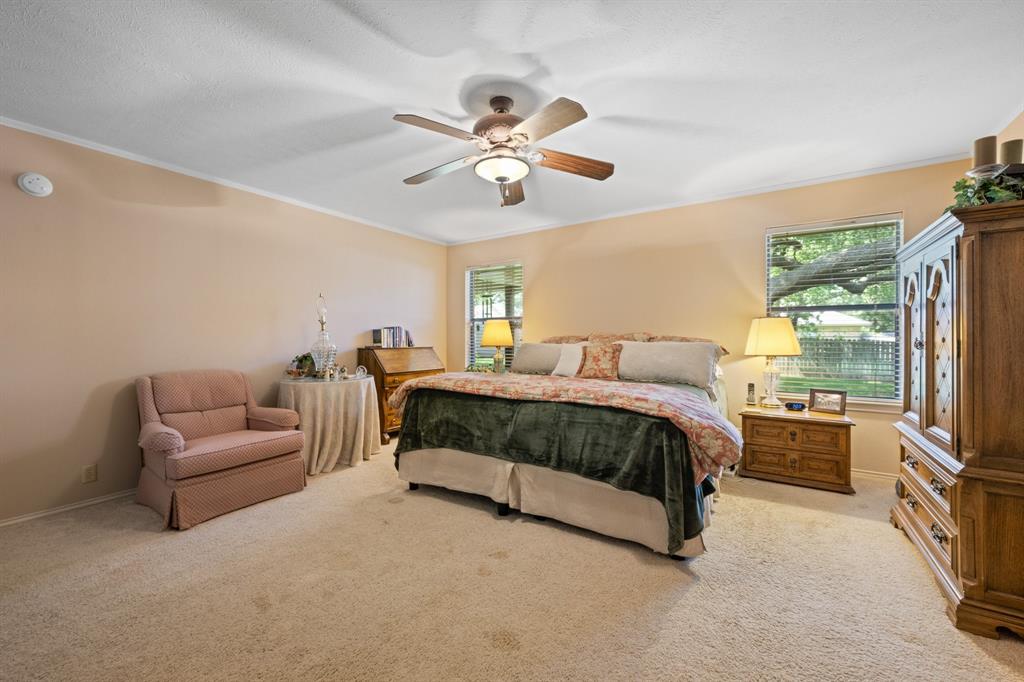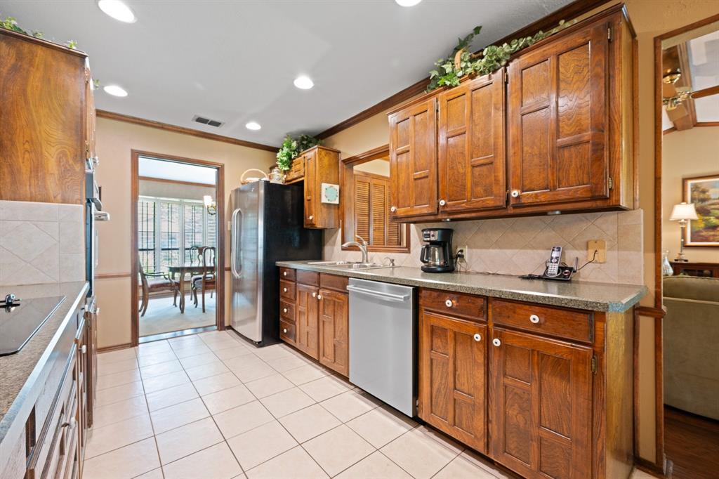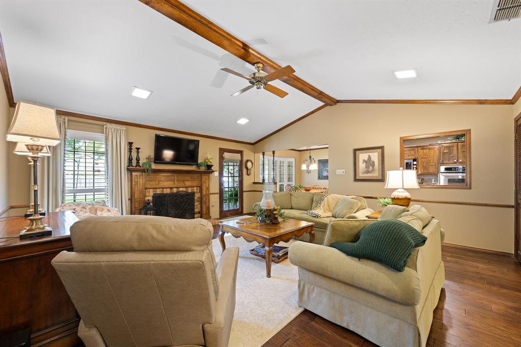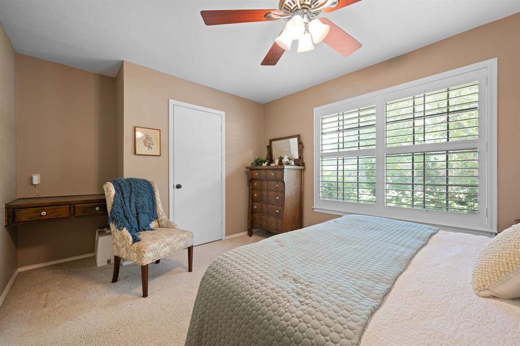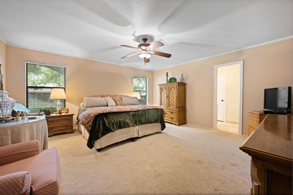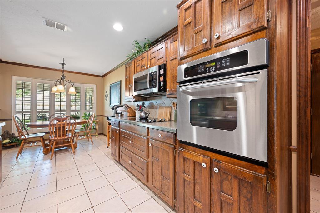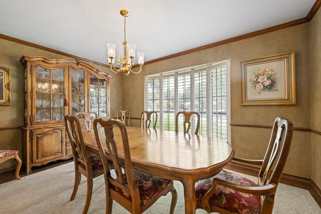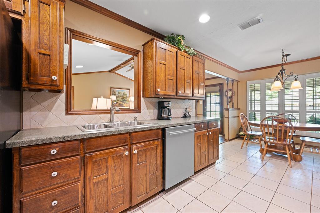 Welcome to this beautiful brick home situated on a desirable corner lot, surrounded by a lush green lawn, established trees, and thoughtfully designed landscaping. The side-entry garage adds curb appeal, while the private backyard offers a peaceful retreat. A brand-new roof was just installed in August 2025, giving you peace of mind for years to come. Step inside to a spacious living area with raised ceilings that create an open, airy feel. The cozy gas log fireplace is the centerpiece, perfect for gatherings, and the convenient wet bar—currently used as extra storage—adds flexibility. Flowing seamlessly into the wide galley kitchen, you’ll appreciate the updated appliances including a smooth-top stove, stainless steel microwave, and oven. A breakfast nook overlooks the backyard, while the formal dining room offers plenty of space for entertaining. Throughout the home, you’ll notice the timeless charm of plantation shutters. The split-bedroom floor plan provides privacy and functionality. The extra-large primary suite easily accommodates a king bed and oversized furniture. Its ensuite bathroom features dual sinks, two walk-in closets, and a tub-shower combination. The secondary bedrooms are equally impressive with generous closet space. Bedroom two includes a built-in desk and walk-in closet, while bedroom three boasts two closets. The guest bathroom is well-appointed with excellent storage. Step outside to enjoy the large, private backyard with a gorgeous shade tree—ideal for play or relaxation. A covered patio offers the perfect spot for outdoor dining, and a storage shed with electricity on the exterior that provides additional utility. This home combines comfort, character, and thoughtful updates, making it a must-see!