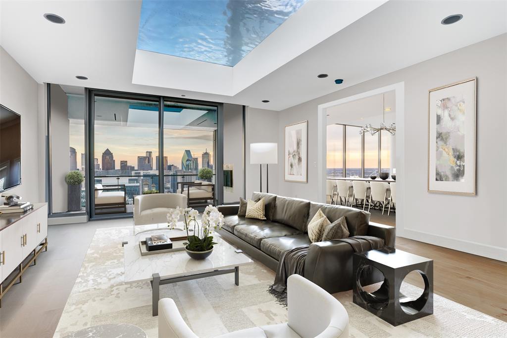 Over 85% sold! Your last opportunity to experience the Harwood lifestyle, featuring parks, restaurants, and direct access to the Katy Trail, among other amenities. Bleu Ciel's premiere penthouse, located on the 32nd and 33rd floors, is truly dazzling. This home boasts two expansive floors with 8,200 SF of interior space, complemented by over 8,000 SF of terrace area. Enjoy an extraordinary cantilever pool that extends beyond the building, offering stunning views of the bustling Uptown Dallas area. This gallery-like, spacious home is perfect for both lively gatherings and quiet reflection. For those seeking the paradise of an estate without the associated worries, welcome to Bleu Ciel.