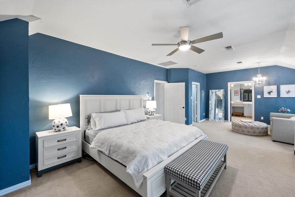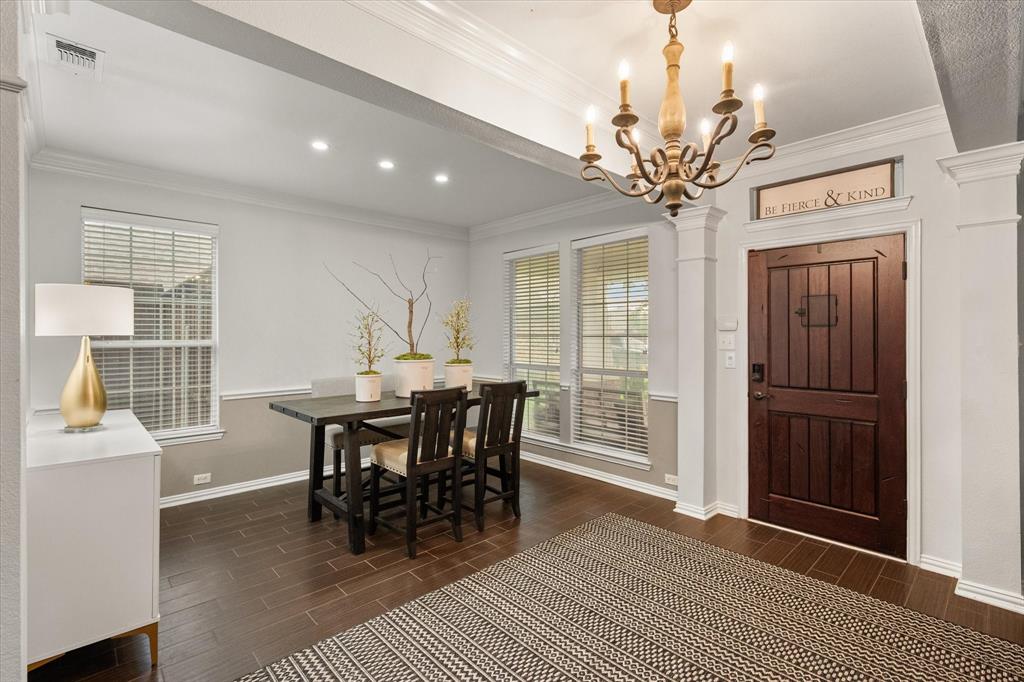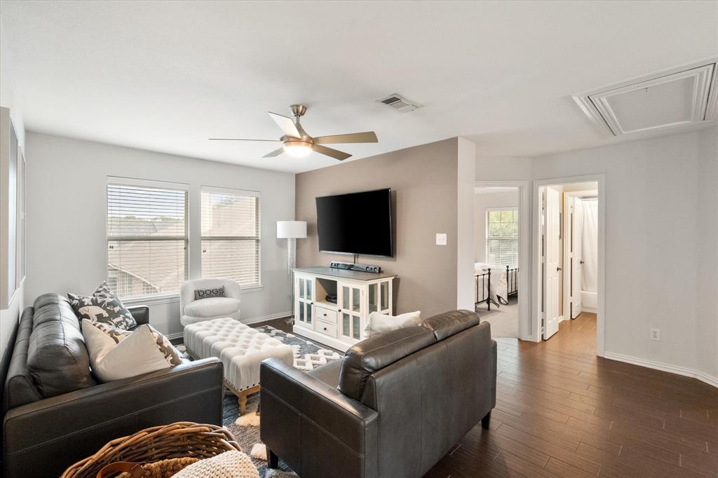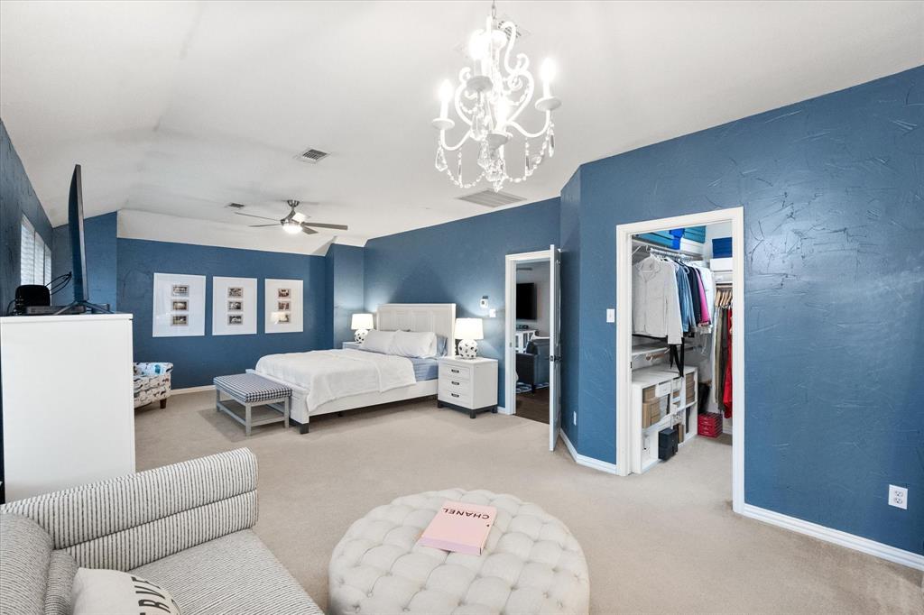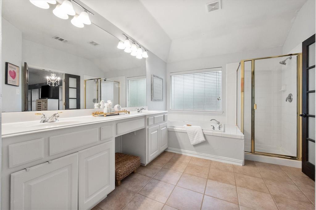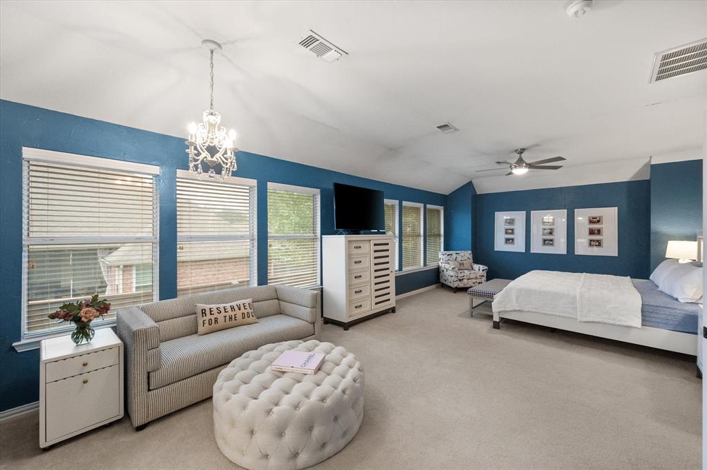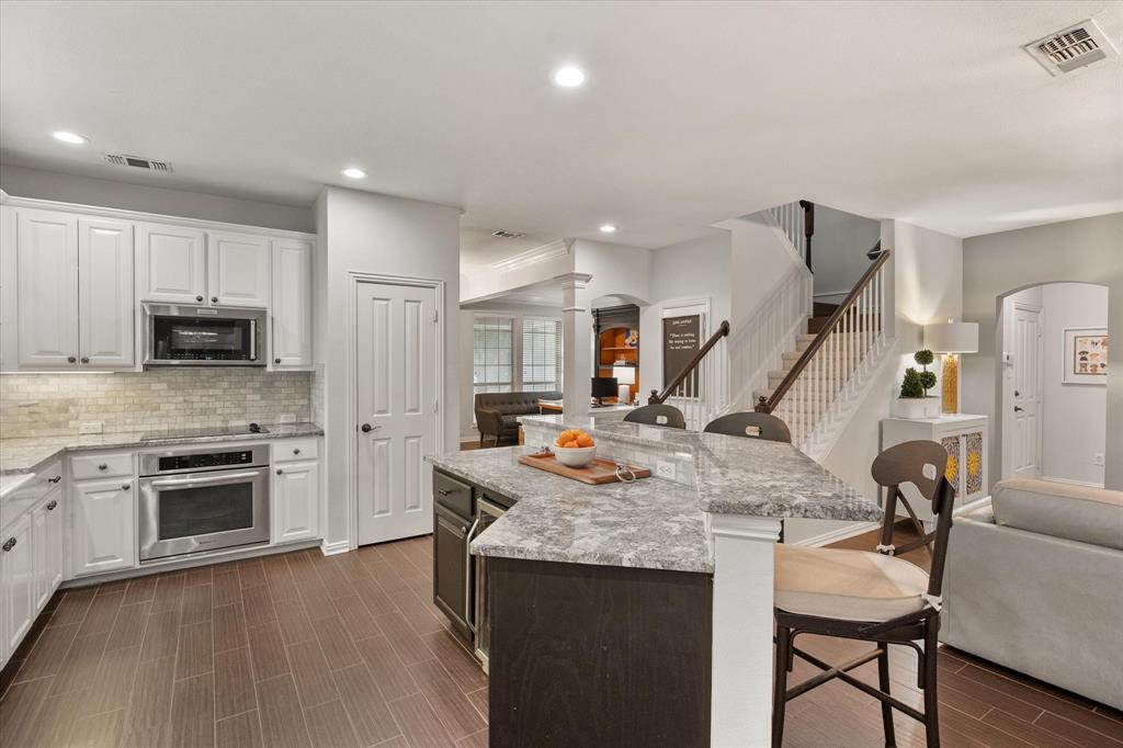 Gorgeously updated and ready to be enjoyed in Castleridge at Westchester! Tucked away in a private cul-de-sac, you’ll love this beautifully maintained home that offers the perfect blend of modern luxury and stylish charm. As you step inside you’ll be greeted by beautiful crown moulding, wood-look porcelain tile floors, decorative lighting, and elegance that creates a warm and inviting atmosphere that carries throughout the home. The spacious open living room boasts a beautiful tile fireplace with built-ins—an ideal space to relax or entertain guests. Love to cook? You’ll fall head over heels for the gorgeous, updated kitchen featuring custom cabinetry with glass-front uppers, beautiful granite counters, upgraded KitchenAid stainless steel appliances, farm sink, built-in wine cooler, generous counter space, and a convenient breakfast bar for casual dining or entertaining. The grand primary suite is a true retreat, featuring a stylish living area to relax after a long day, a wall of windows, and abundant natural light. Double french doors lead to your luxurious ensuite bath with garden tub, separate shower, and dual sinks—your own private spa experience. Upstairs, a second living room serves as a flexible media area or play loft.