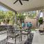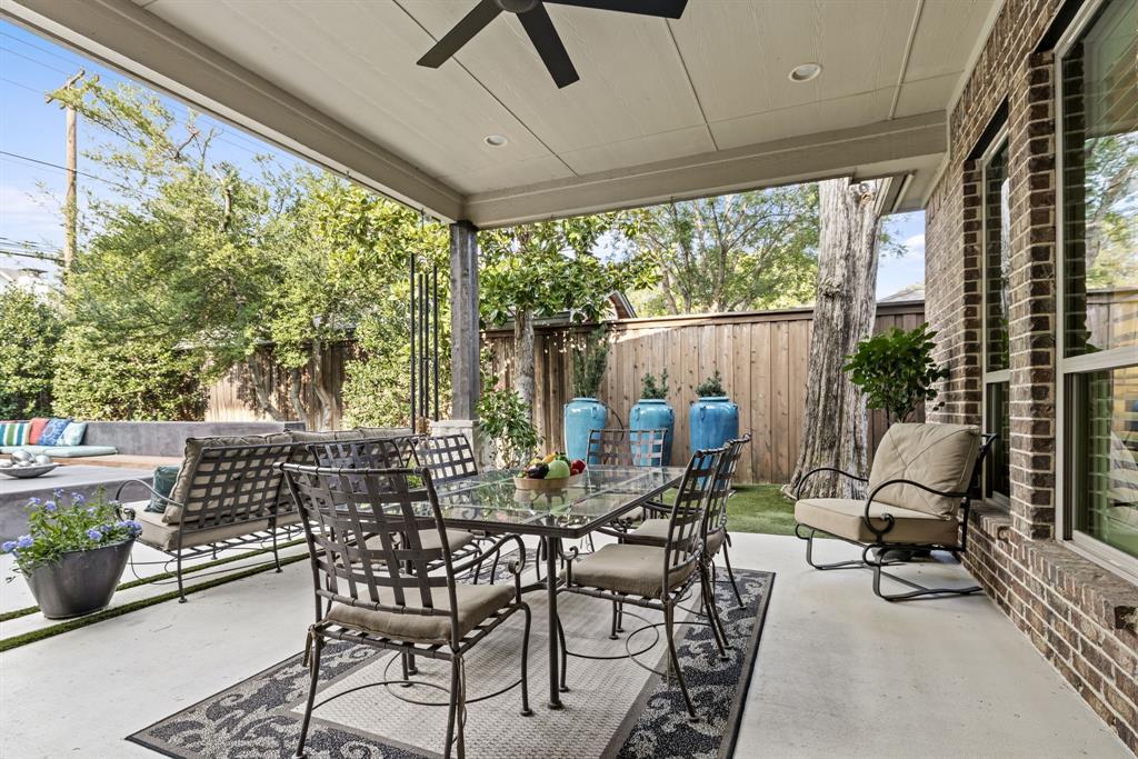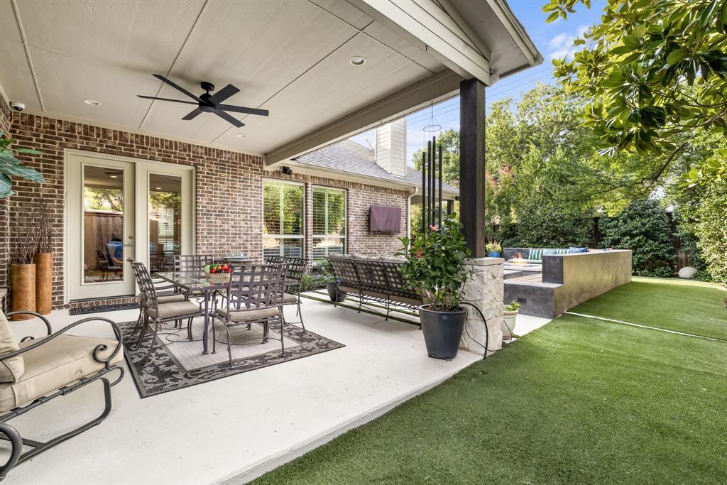 Outdoor Living: Covered patio with grill, built-in seating around fire pit, entertainment system, turf, landscape lighting, and dry sauna