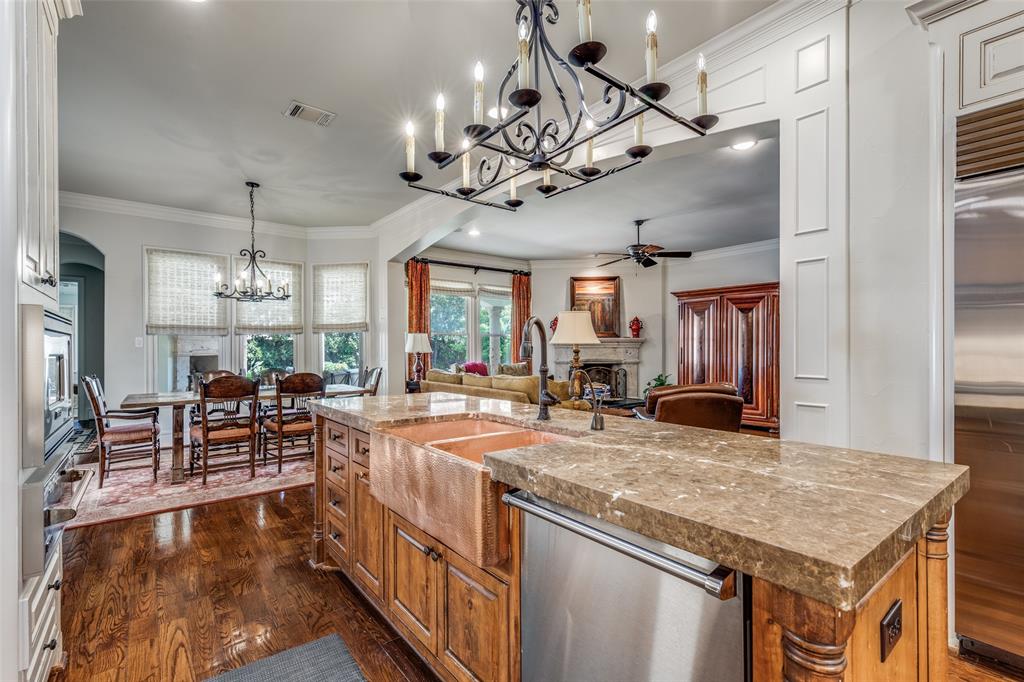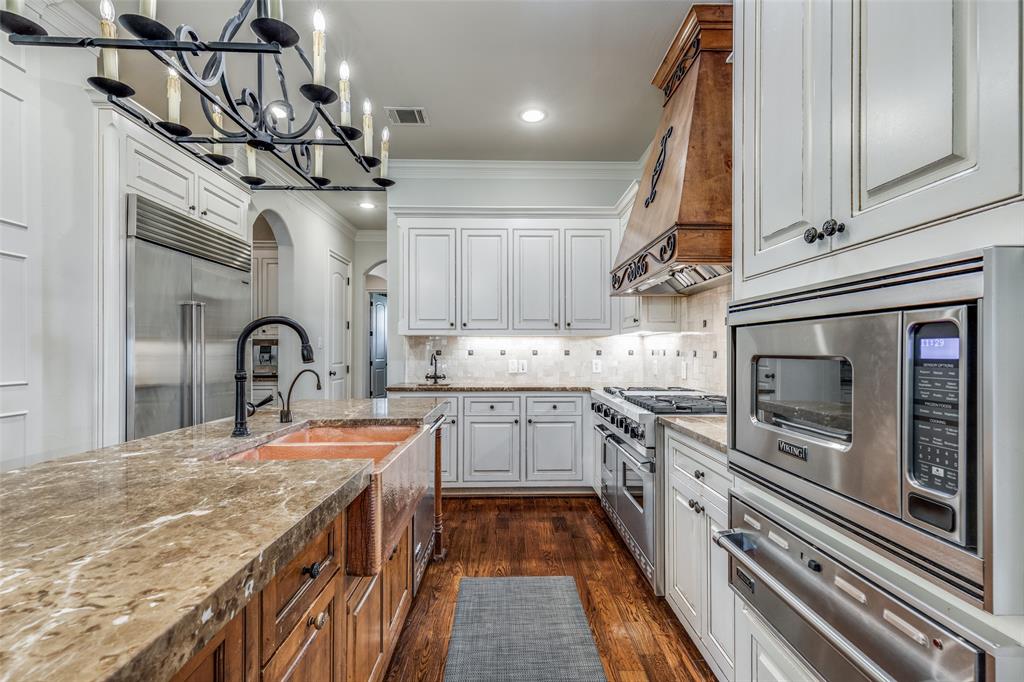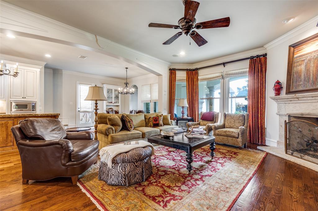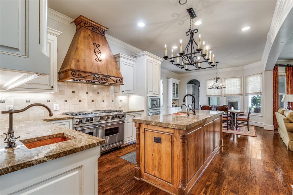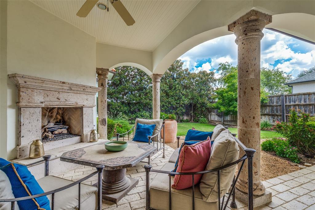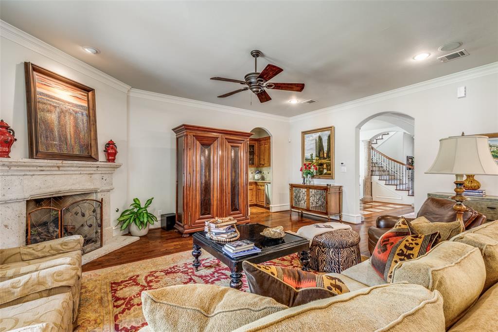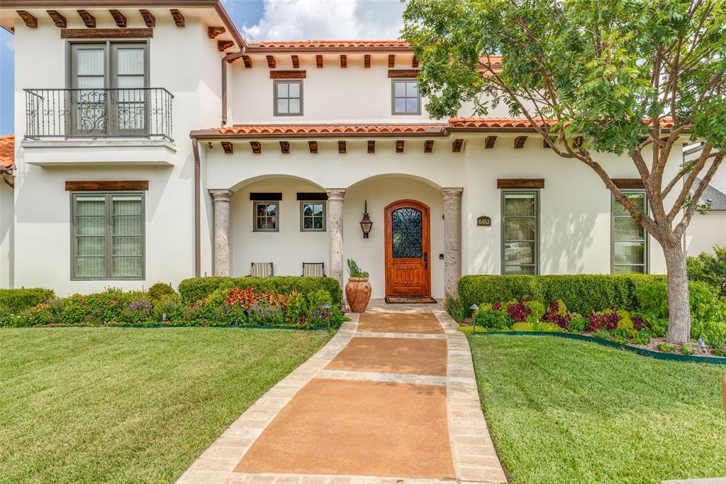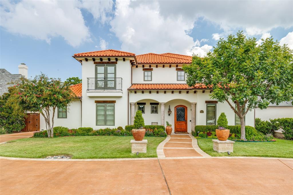 Beautifully maintained classic Mediterranean style home located on great block close to Preston Royal. Beautifully landscaped yard with circular drive in front and covered patio with fireplace in rear. First floor primary bedroom has sitting area, spacious bath with jetted tub, separate shower, double vanities and custom closet with wardrobes. Family room with fireplace views rear yard and patio and is open to kitchen. Kitchen has island with copper sink, marble countertop, builtin Subzero refrigerator, Viking 6 burner range and separate bar sink. Adjacent breakfast area. First floor also has spacious private office, open dining room, and additional bedroom and ensuite bath. Two sets of stairs lead to second level which comprises a large living area with wet bat, great storage and an upstairs balcony, media room, 3 bedrooms with ensuite baths, and a bonus room for crafts or exercise! A 2 car garage and separate 1 car garage create flexible parking options. Great floorplan for family living and entertaining!