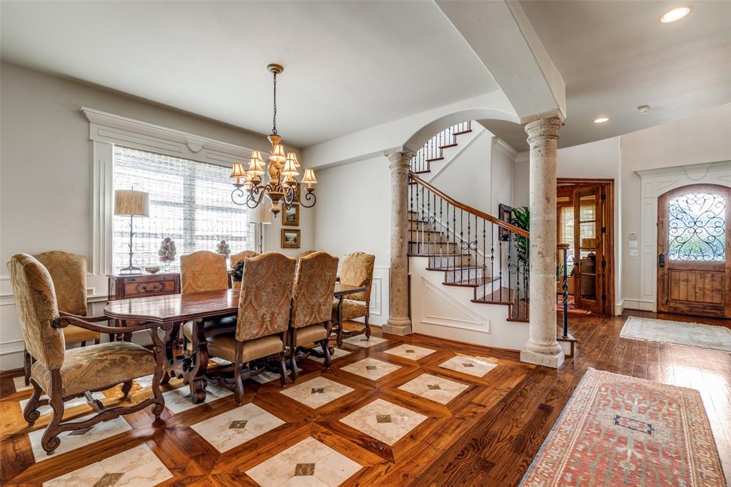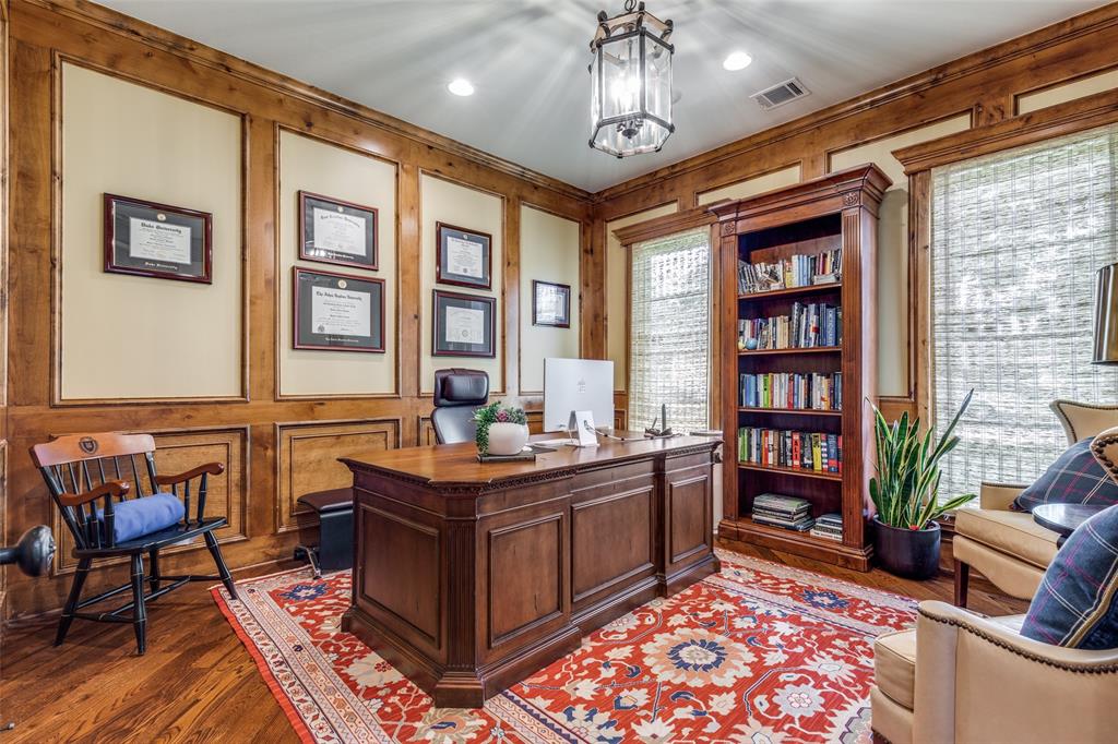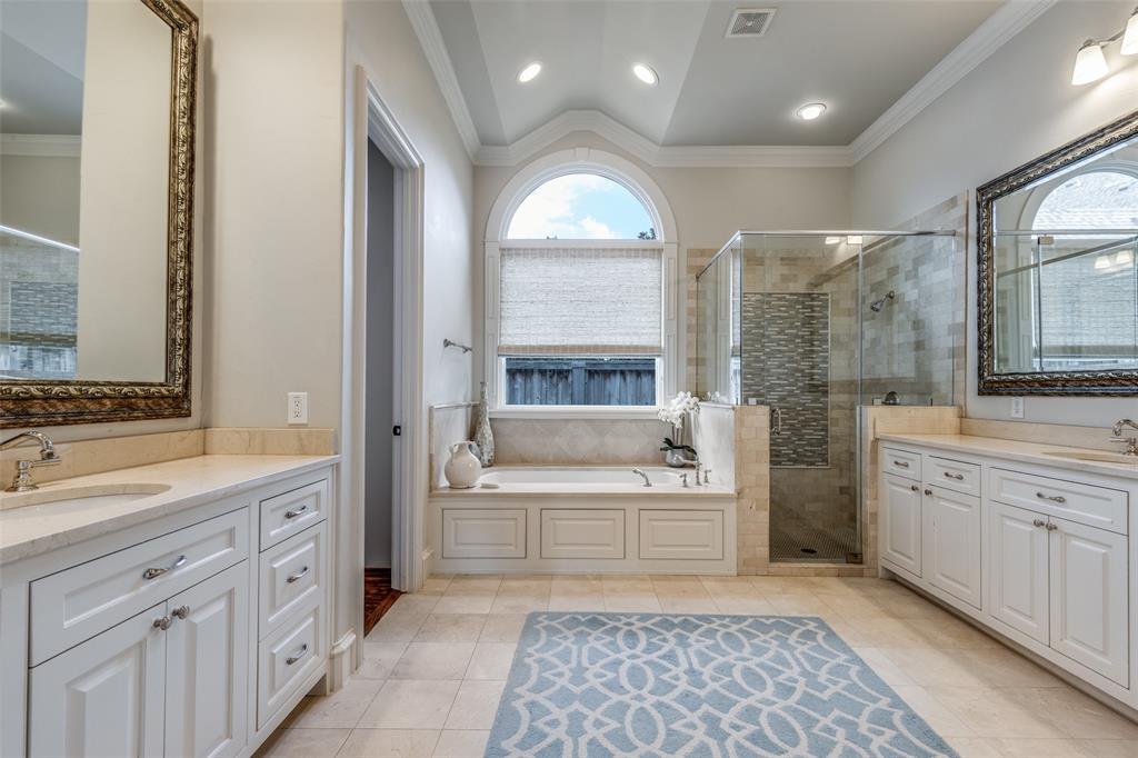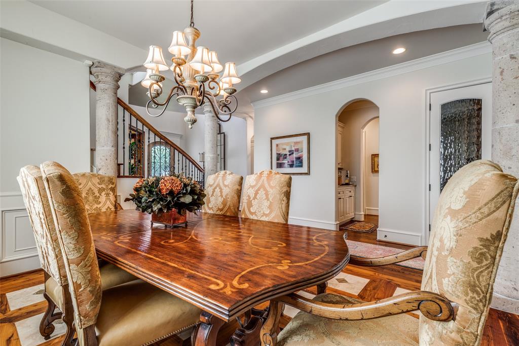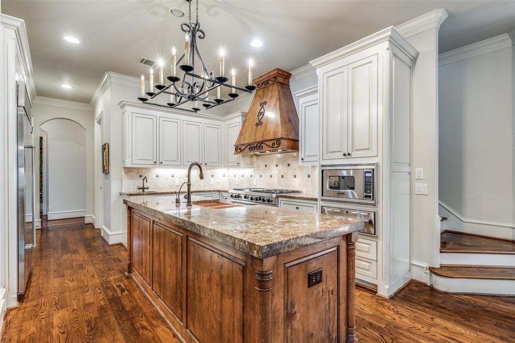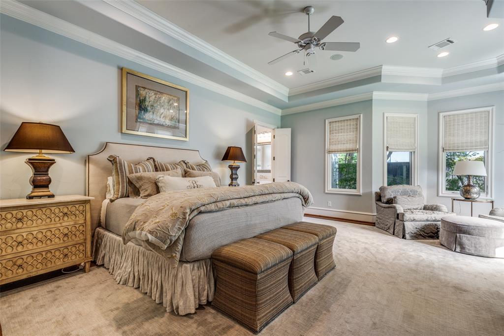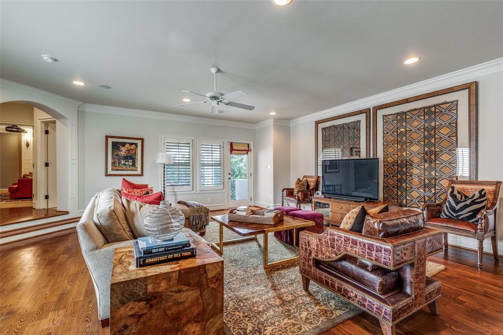 Beautifully maintained classic Mediterranean style home located on great block close to Preston Royal. Beautifully landscaped yard with circular drive in front and covered patio with fireplace in rear. First floor primary bedroom has sitting area, spacious bath with jetted tub, separate shower, double vanities and custom closet with wardrobes. Family room with fireplace views rear yard and patio and is open to kitchen. Kitchen has island with copper sink, marble countertop, builtin Subzero refrigerator, Viking 6 burner range and separate bar sink. Adjacent breakfast area. First floor also has spacious private office, open dining room, and additional bedroom and ensuite bath. Two sets of stairs lead to second level which comprises a large living area with wet bat, great storage and an upstairs balcony, media room, 3 bedrooms with ensuite baths, and a bonus room for crafts or exercise! A 2 car garage and separate 1 car garage create flexible parking options. Great floorplan for family living and entertaining!