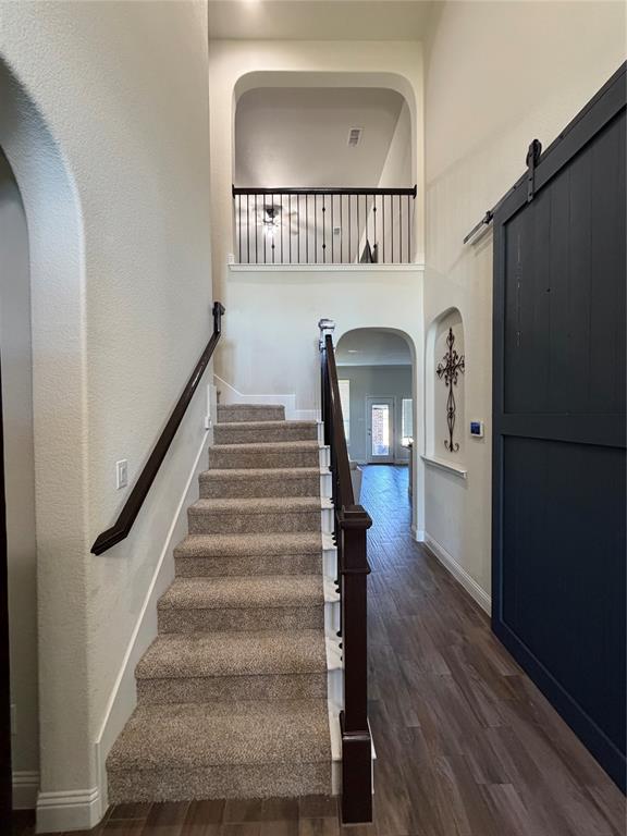 Primary suite includes a custom barn door to en-suite bath. Office-flex space features handmade 10’ barn doors. Upstairs carpet, stairs, and hallway recently replaced. Garage includes dual EV charging station.