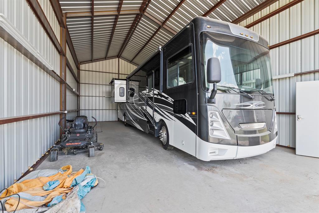 Beyond the main building, the property offers a 24 × 50 RV garage with 50 amp breaker, floor drain tied to septic, and future sewer stub for conversion potential, plus a portable storage building. Outdoor features include a covered patio and fenced yard.