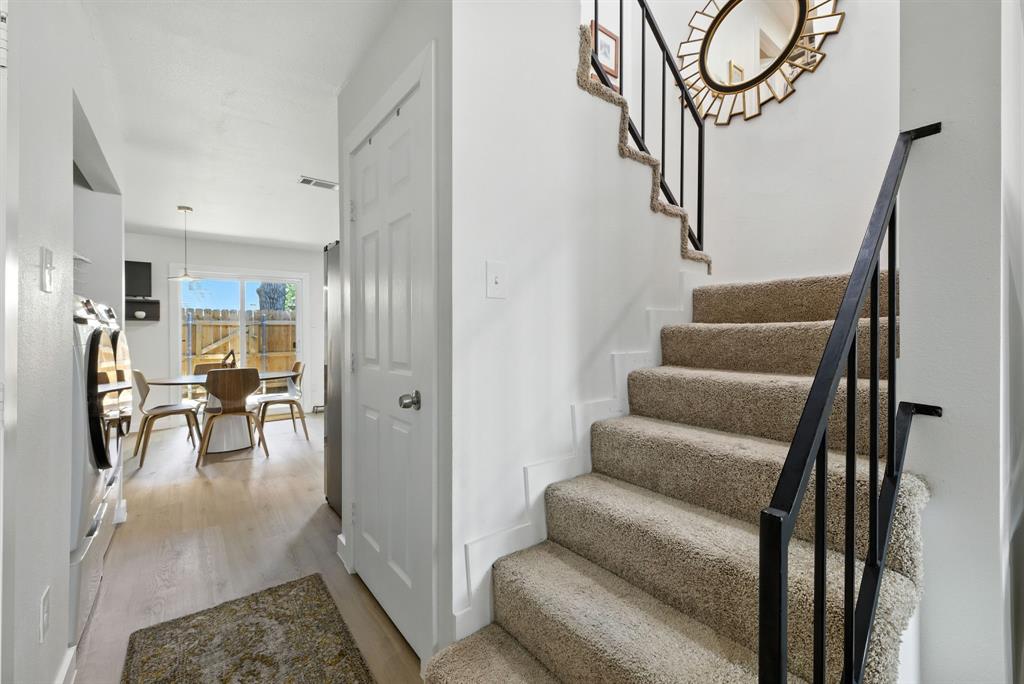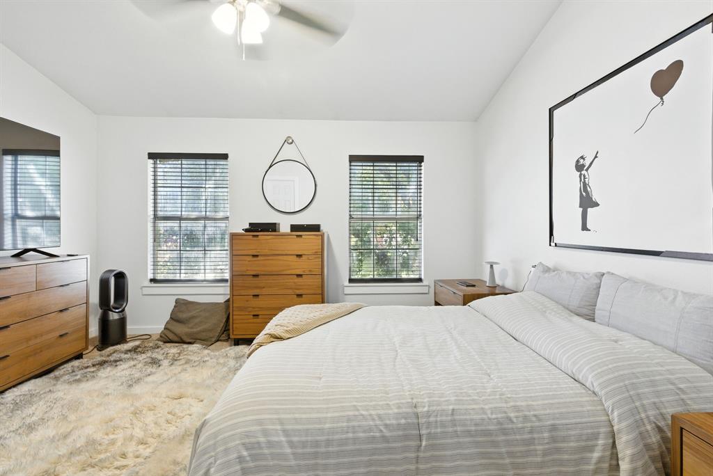 Upstairs, the primary suite offers a private retreat with a remodeled bath, while the secondary bedroom is ideal for guests or a home office. All three bathrooms have been fully updated with granite counters and modern details. Other upgrades include a new roof, all-new electrical with updated circuit box, new insulation, drywall, paint, vinyl plank flooring downstairs, carpet upstairs, custom blinds, ceiling fans, and new windows. Two brand-new HVAC units with a transferable 10-year warranty provide lasting peace of mind.