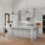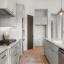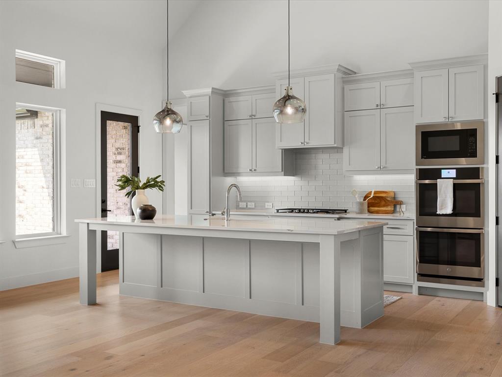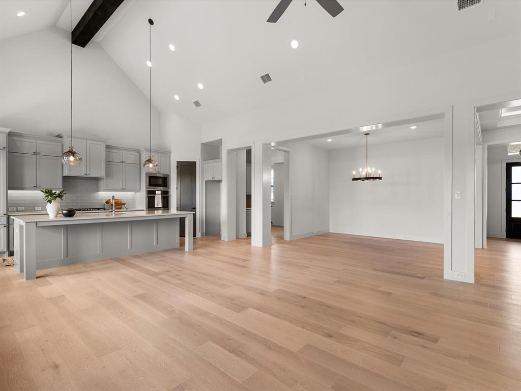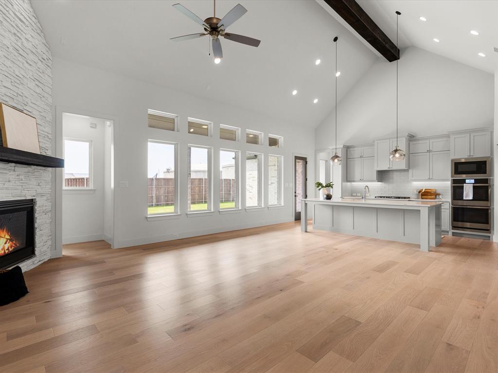 The gourmet kitchen is the centerpiece of the home, featuring a spacious quartz island, custom cabinetry, double ovens, designer tile backsplash, and seamless flow into the dining and living areas. A striking stone fireplace and vaulted ceiling beams anchor the family room, creating the perfect space for both cozy nights and entertaining.