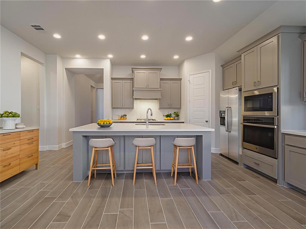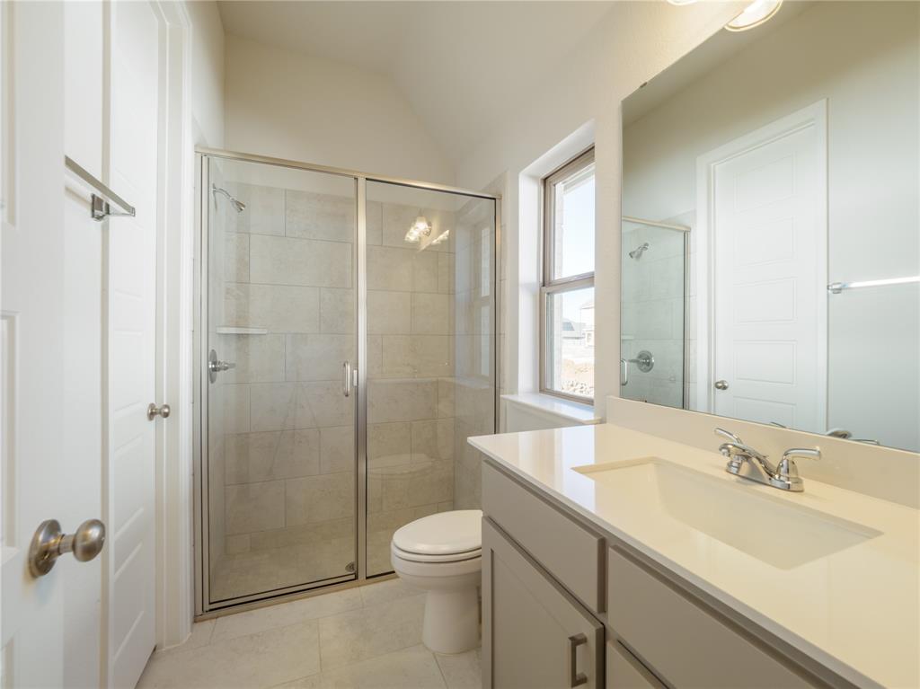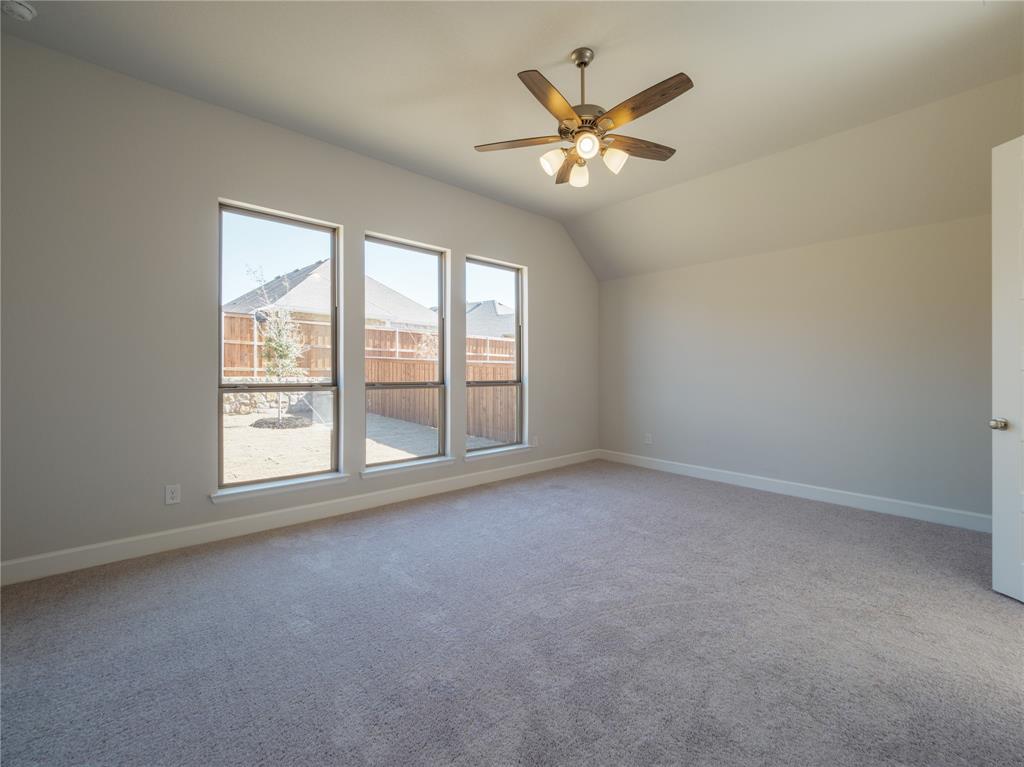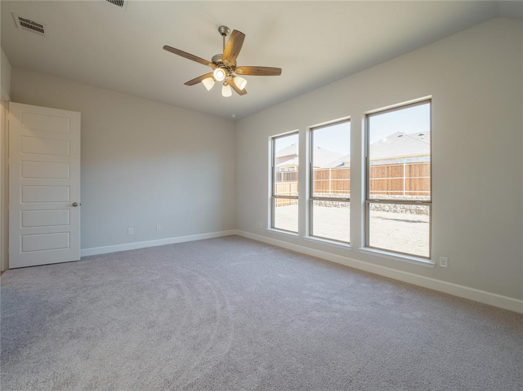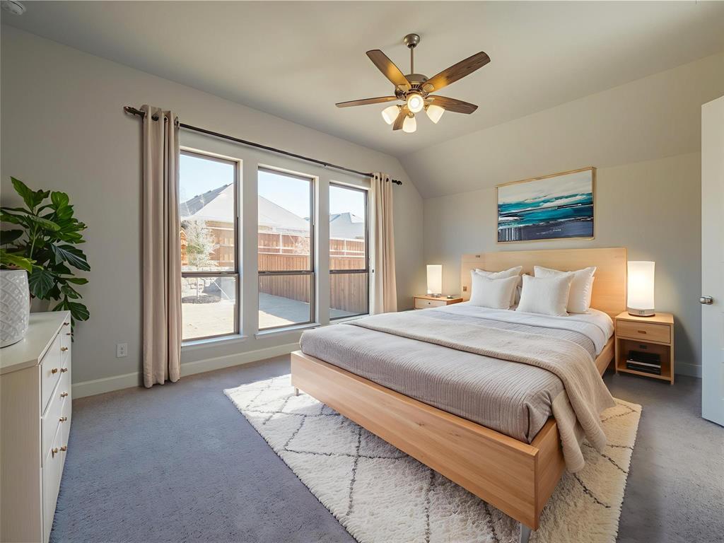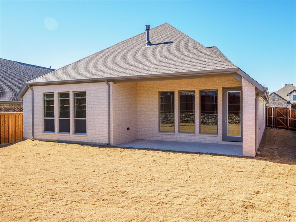 Step inside this stunning Perry Home, where an extended entry with a 12-foot coffered ceiling sets the stage for elegance and comfort. This 2,357-square-foot, single-story home features four spacious bedrooms, including a private guest suite with its own full bath, and three full baths. The living room, with a beautiful wall of windows and a cozy fireplace, flows seamlessly into the open kitchen and dining area. The kitchen is a chef's dream with built-in seating, a walk-in pantry, and plenty of counter space for all your culinary adventures. The primary suite is a true retreat, boasting a spa-like bath with dual vanities, a separate garden tub and glass-enclosed shower, and two walk-in closets. All bedrooms in this home are thoughtfully designed with walk-in closets, providing ample storage for everyone. Enjoy the Texas evenings on your private, covered backyard patio. The home also includes a two-car garage with a mudroom entry, and is pre-wired with a smart home system for modern convenience. Located in the Prairie Oaks Ph 1b subdivision, this home is zoned for Denton ISD schools.