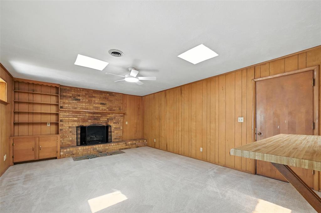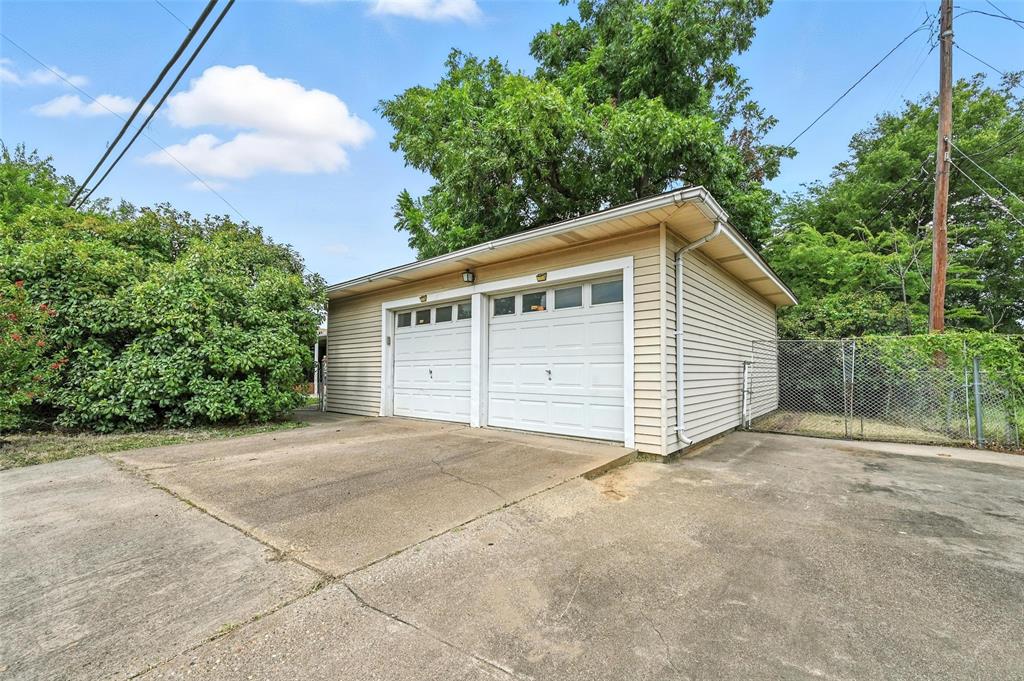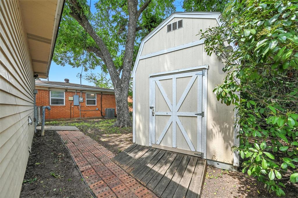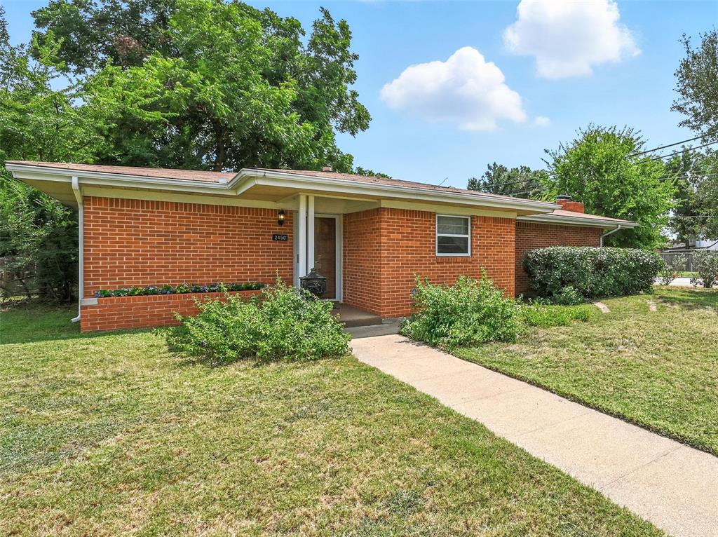 Welcome to 2450 Cambridge Drive, a charming 3-bedroom home on a beautifully landscaped corner lot in the heart of Irving. The spacious living room features a cozy fireplace with gas logs, custom built-ins, and skylights that fill the space with warm natural light. The separate dining area leads to a well-designed kitchen with custom cabinetry, a pantry, and a breakfast bar perfect for dining or your delightful morning coffee. Step outside to a covered patio ideal for relaxing or entertaining. The backyard offers the shade of a mature pecan tree along with a large storage building, storm cellar, and an oversized detached two-car garage equipped with cabinets, a workbench, a large cedar closet, and space for RV and boat parking. All of this is just minutes from downtown and the airport.