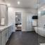 The jewel of a plan that fuses function with beauty is the first-floor primary suite: vaulted ceiling, gas fireplace, built-ins, views of the backyard and a spa-inspired bath boasting dual vanities, freestanding tub and frameless glass shower.