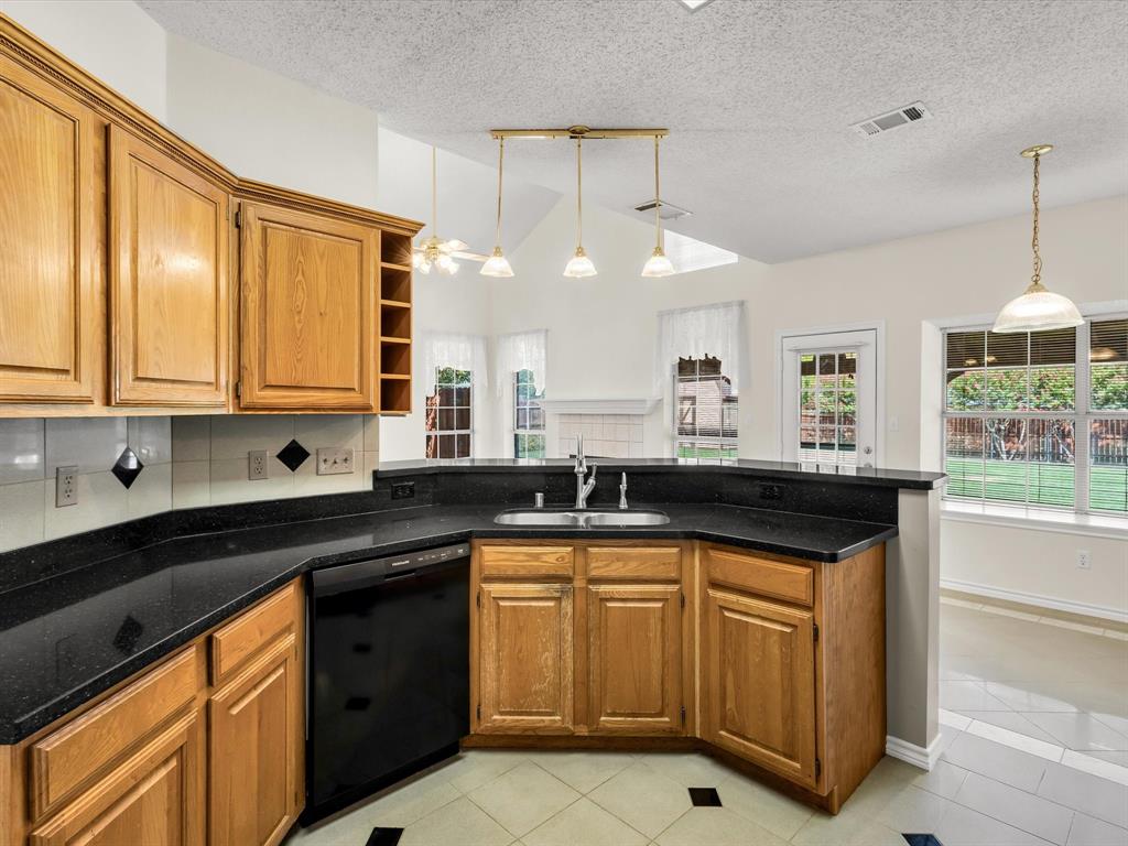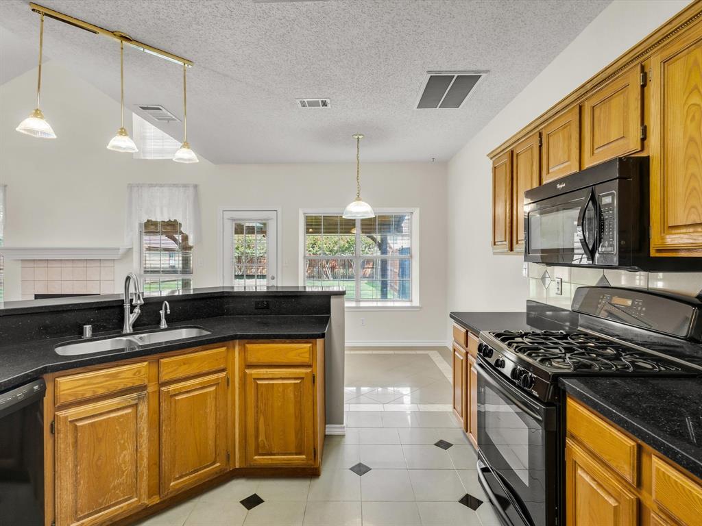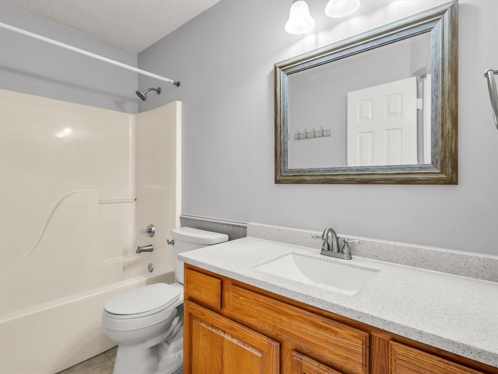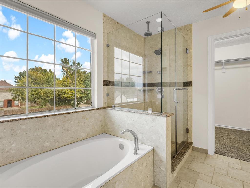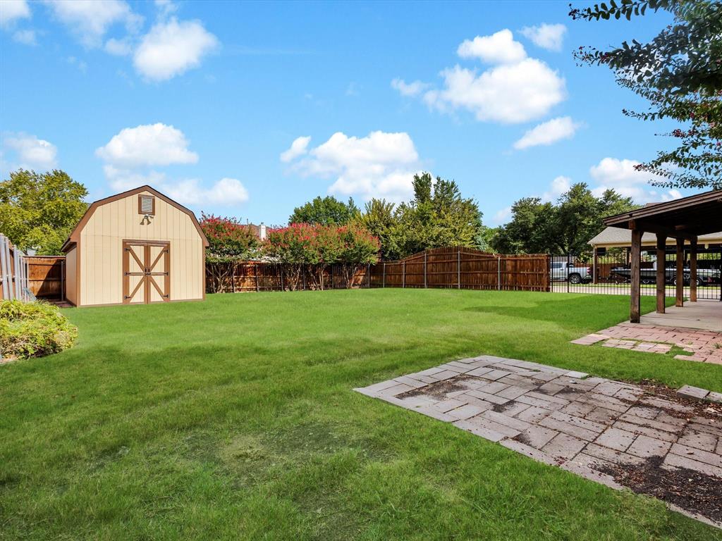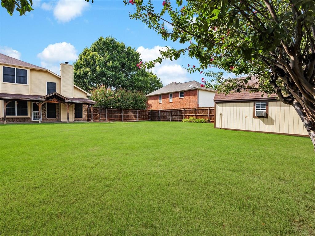Sitting on a generous .29-acre lot, this beautifully maintained home offers 4 bedrooms and 3 full baths. Designed with high ceilings, abundant natural light, and an open-concept layout, this home provides both comfort and functionality. Recent updates include fresh paint throughout, new carpet in the upstairs bedrooms, and new laminate wood flooring in the living and dining room, downstairs guest room, and a remodeled master bath. The main level features a large living area with a gas starter fireplace overlooking the backyard, a formal dining room, and a cozy breakfast nook. The kitchen is equipped with quartz countertops, a breakfast bar, gas range, and ample storage. An adjoining nook opens directly to the covered patio, creating a seamless flow for indoor-outdoor dining and entertaining. That downstairs guest suite can flex as an office space as well. Upstairs, the primary suite impresses with an updated en suite bath featuring a frameless glass walk-in shower with rainhead system, a garden tub, dual vanities, and a spacious walk-in closet. Two additional bedrooms with walk in closets complete the second level. The backyard is ready for your vision with plenty of grassy space, a covered patio that is plumbed for a gas grill - lots of room to spread out. There's also a large workshop-storage shed on slab with window A-C and electricity - ideal for hobbies, storage, or a workspace. The extended 3-car-wide driveway offers ample parking and is extra long. Conveniently located near Firewheel shopping, Lake Ray Hubbard, and Lake Lavon, with quick access to Hwy 78, PGB, and I-30. Move-in ready and waiting for you! Please see Transaction Desk for a full list of features!