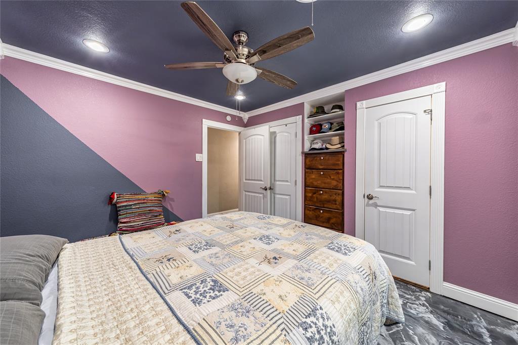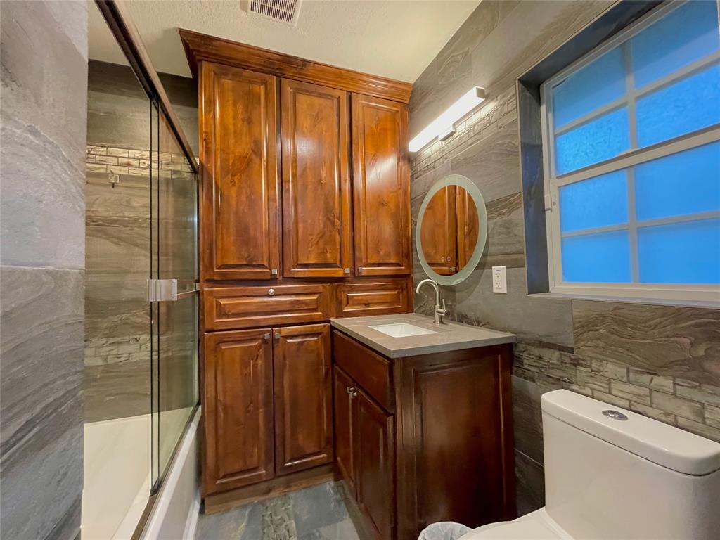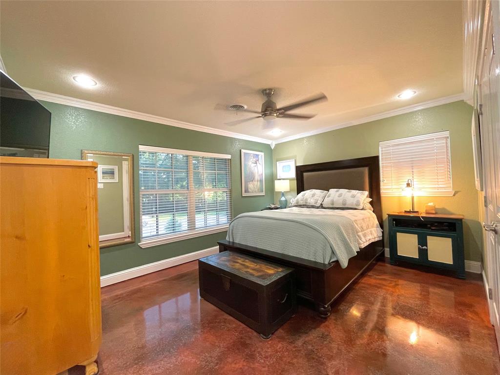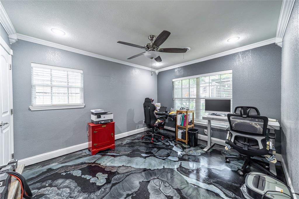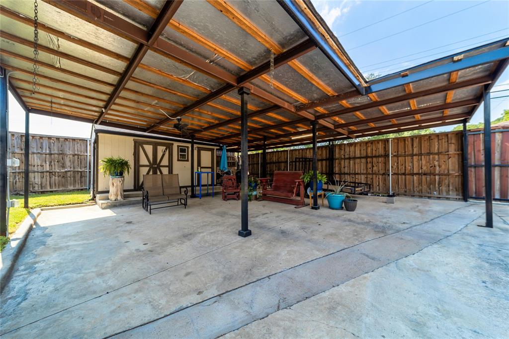 Step inside to find two spacious living areas that offer versatility and comfort. The home features a classic galley-style kitchen with an abundance of beautiful wood cabinetry and sleek granite countertops. With 4 bedrooms and 2.5 bathrooms, the layout includes an en-suite bath in one of the secondary bedrooms and a large walk-in shower in the primary bathroom. Each bedroom is finished with durable epoxy flooring, adding a modern, polished touch throughout. Step outside into a serene backyard that feels like a private oasis in the heart of the city. A clean, spacious patio sets the stage for outdoor relaxation or entertaining, while surrounding lush greenery and assorted plants offer a sense of calm and seclusion.