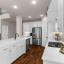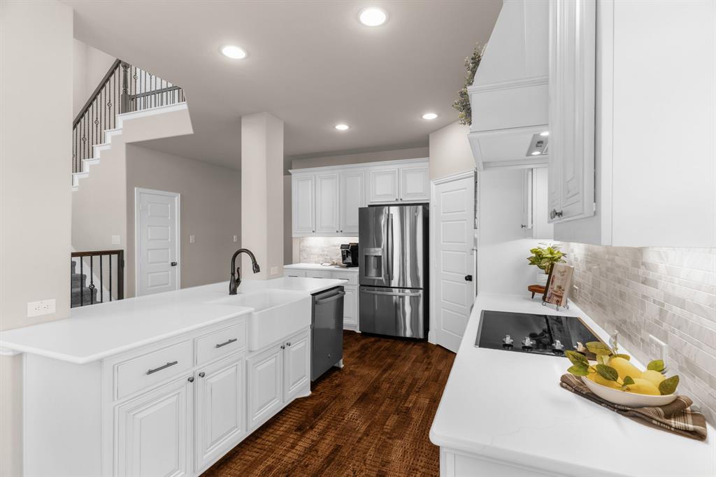 The gourmet kitchen features a double oven, farmhouse-style sink, quartz countertops, solid maple cabinets, and a beautiful backsplash, all complemented by oiled bronze fixtures. Interior finishes throughout the home include real hand-scraped hardwood floors and 5.25-inch baseboards for a polished, elegant touch.