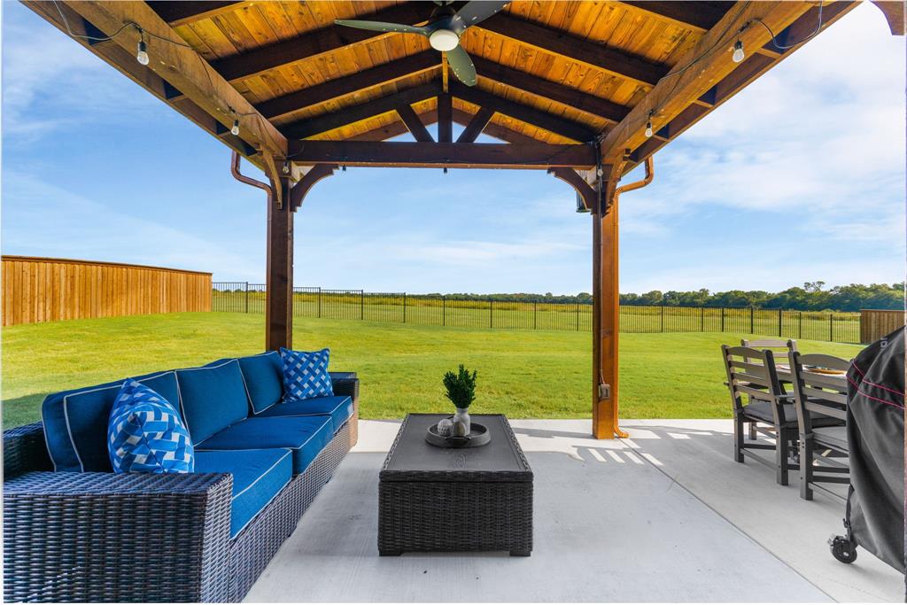 Outdoor living is made easy with the oversized extended covered patio and a partially fenced yard with private wood and iron fencing.