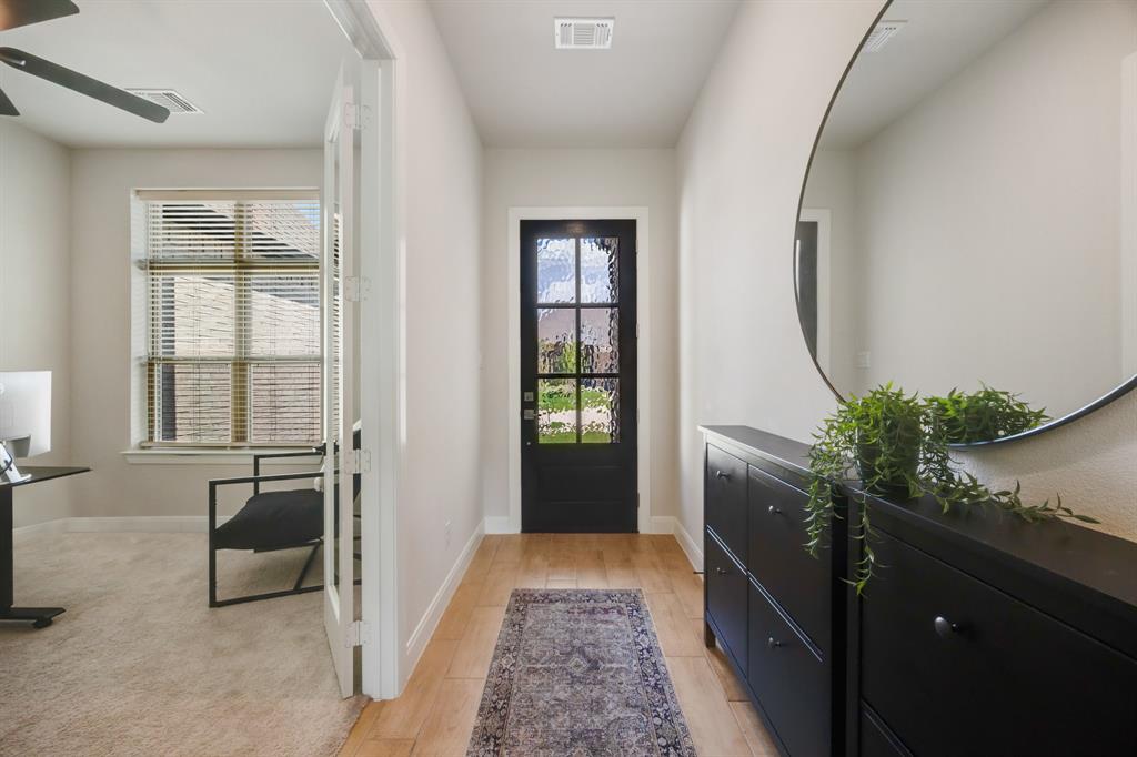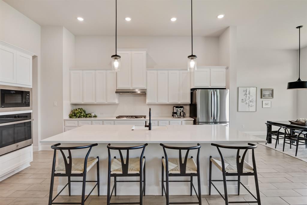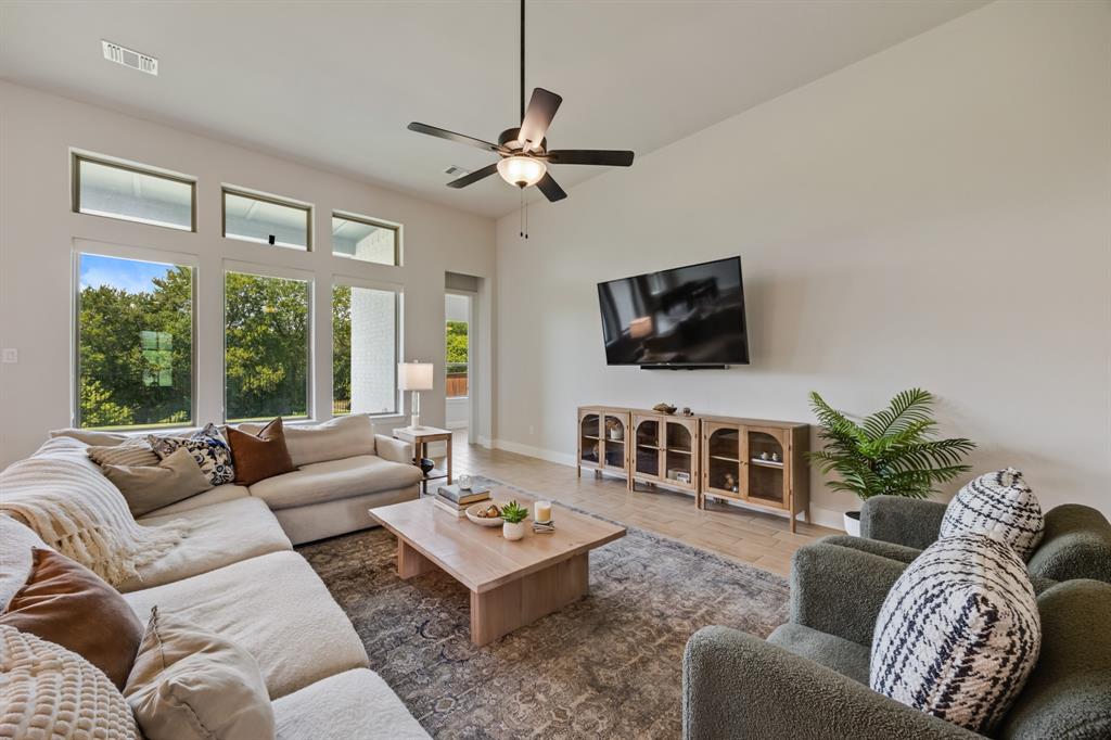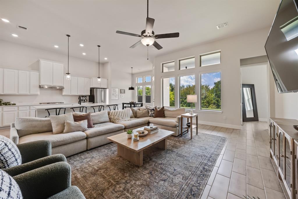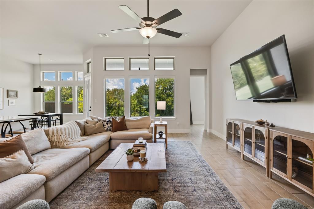 Welcome to this beautifully designed single-story home backing to a lush greenbelt and community walking trail. Thoughtfully crafted with modern style and functional living, this home offers 4 spacious bedrooms, 3 full baths, and a dedicated office with french doors for added office privacy. The open-concept kitchen, living, and dining areas showcase peaceful views of the backyard, with walls of windows dressed in custom shades for both light and privacy. The kitchen features a prep center island, gas cooktop, a huge walk-in pantry and abundant cabinetry, opening into the family room for effortless entertaining. The split-bedroom layout ensures privacy, while the luxurious primary suite includes a spa-like bath with dual vanities, soaking tub, lovely shower, separate linen and walk-in closet. Additional highlights include tile wood look flooring throughout the main living spaces, decorative lighting, a spacious laundry room with folding table, a foot locker, and a 3 car garage. Step outside to a private backyard with covered patio and endless greenbelt views. Residents enjoy access to a resort-style pool with cabanas, playground, sports courts, and scenic walking trails.