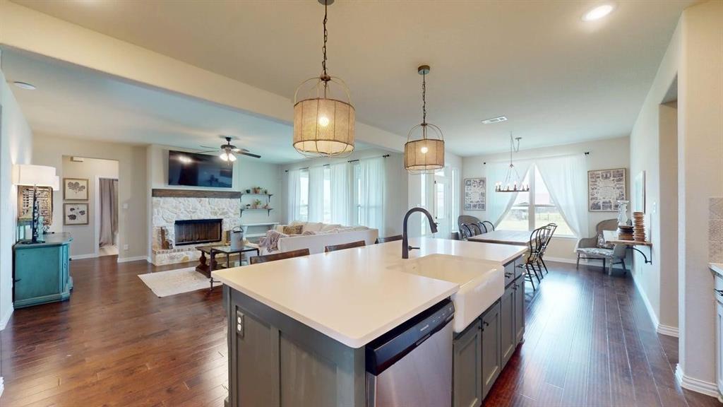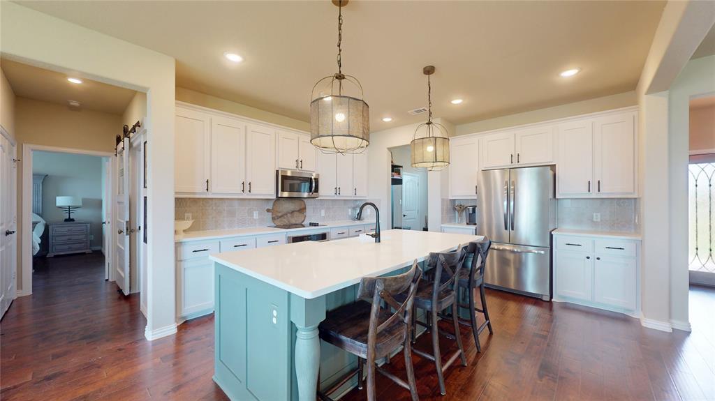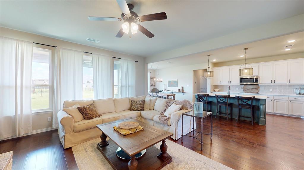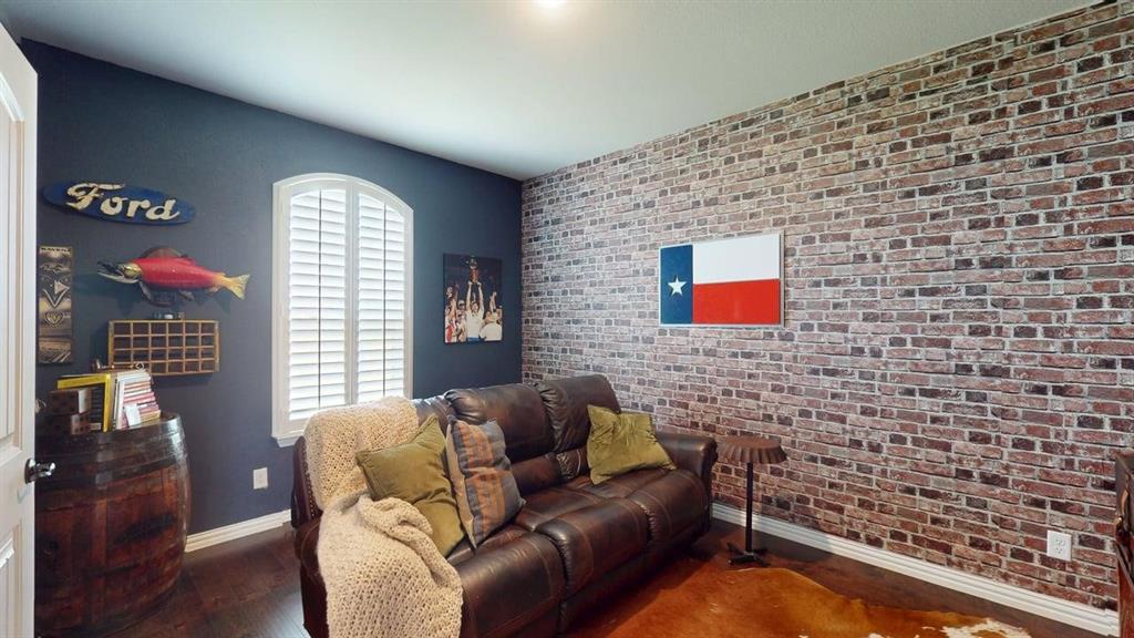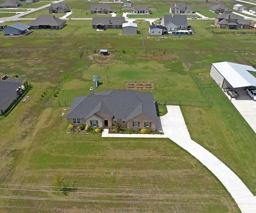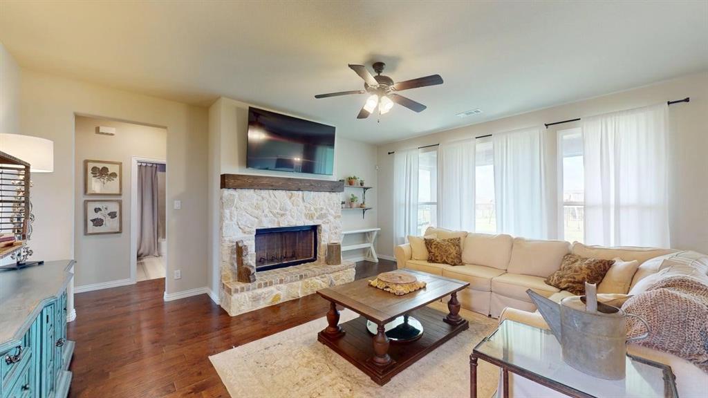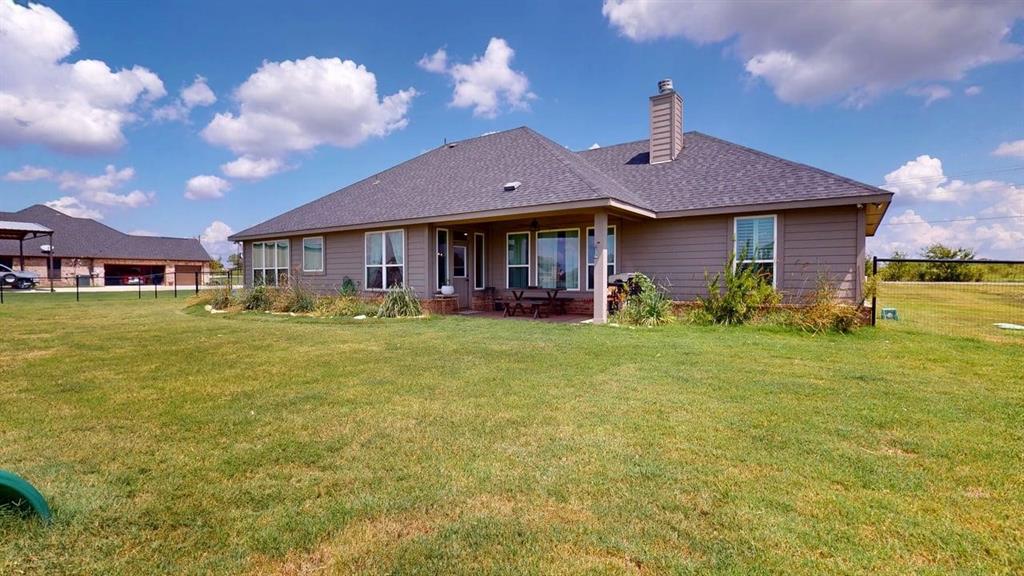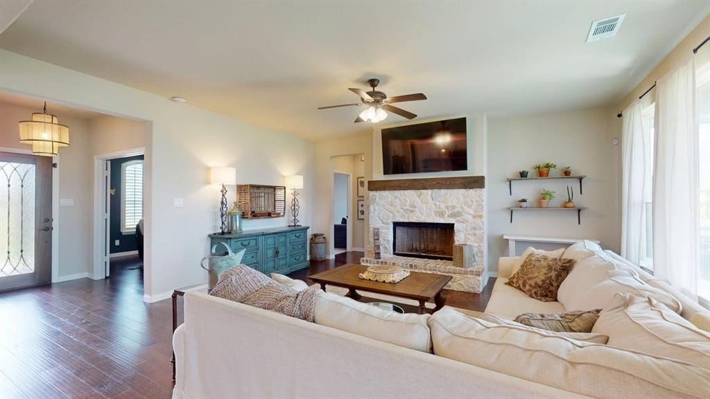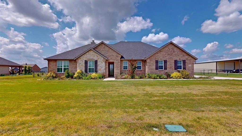 Gorgeous custom-built single-story on 1 acre with a beautiful brick and stone elevation! Inside you will find 3 bedrooms, 2 full baths, flex space that makes a perfect home office or game room, and 2-car garage! Upgrades and amenities include rich hardwood flooring throughout main living areas, open layout great for entertaining, plantation shutters, generous natural lighting throughout, designer paint tones, upgraded lighting fixtures, split bedrooms for added privacy, cozy stone family room fireplace, and MORE! Gourmet kitchen boasts quartz countertops with a decorative ceramic backsplash, large island with breakfast bar and pendant lighting, stainless appliances with electric cooktop, and spacious eat-in area. Primary bedroom secluded at the rear of the home offers a luxurious ensuite with dual sink vanity, garden tub with separate shower, and a large walk-in closet. Expansive backyard is complete with a large covered patio area!