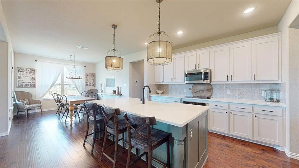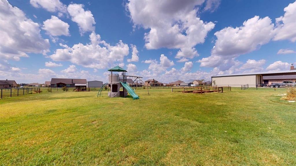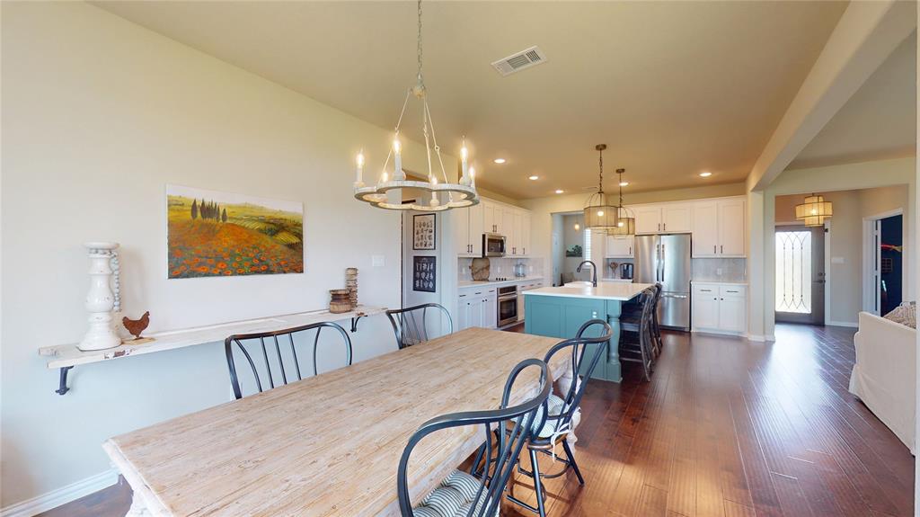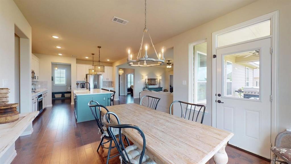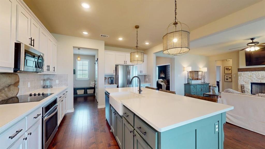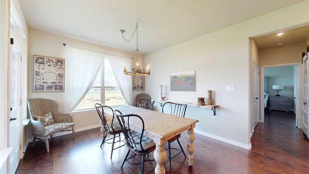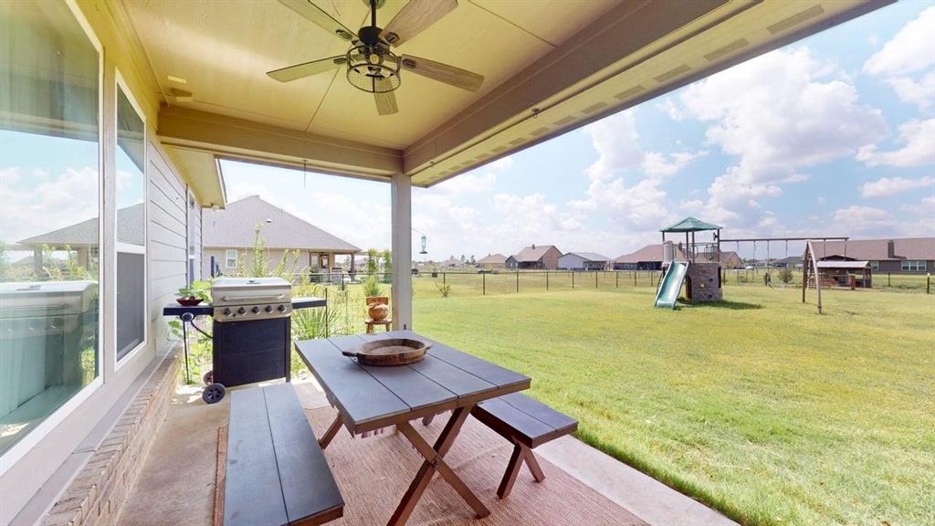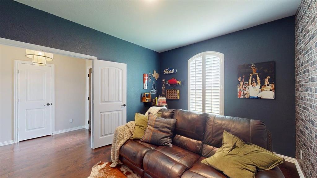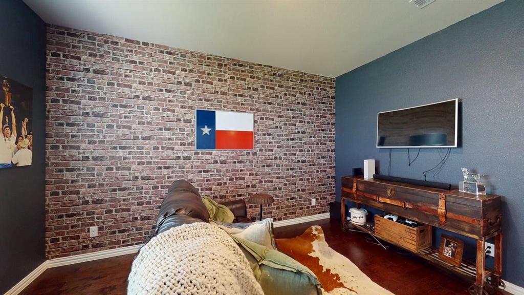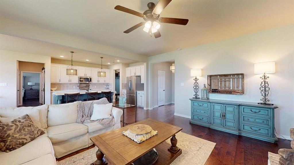 Gorgeous custom-built single-story on 1 acre with a beautiful brick and stone elevation! Inside you will find 3 bedrooms, 2 full baths, flex space that makes a perfect home office or game room, and 2-car garage! Upgrades and amenities include rich hardwood flooring throughout main living areas, open layout great for entertaining, plantation shutters, generous natural lighting throughout, designer paint tones, upgraded lighting fixtures, split bedrooms for added privacy, cozy stone family room fireplace, and MORE! Gourmet kitchen boasts quartz countertops with a decorative ceramic backsplash, large island with breakfast bar and pendant lighting, stainless appliances with electric cooktop, and spacious eat-in area. Primary bedroom secluded at the rear of the home offers a luxurious ensuite with dual sink vanity, garden tub with separate shower, and a large walk-in closet. Expansive backyard is complete with a large covered patio area!