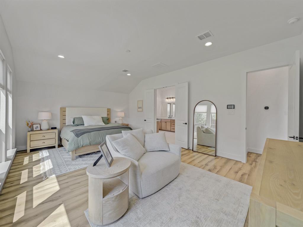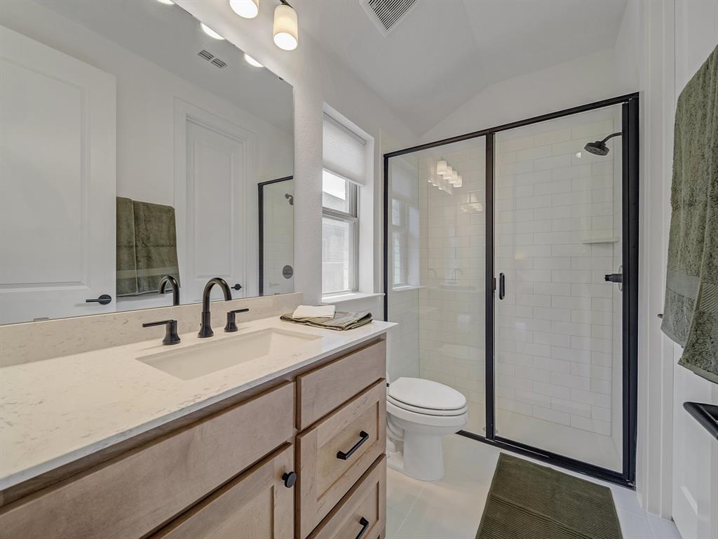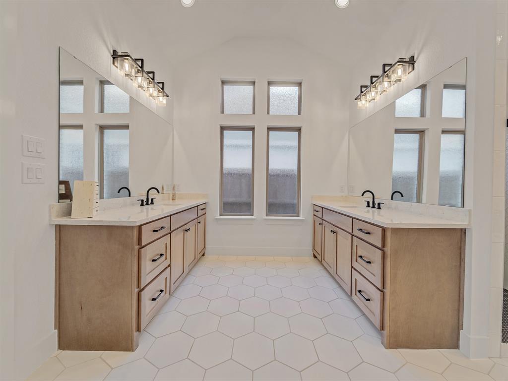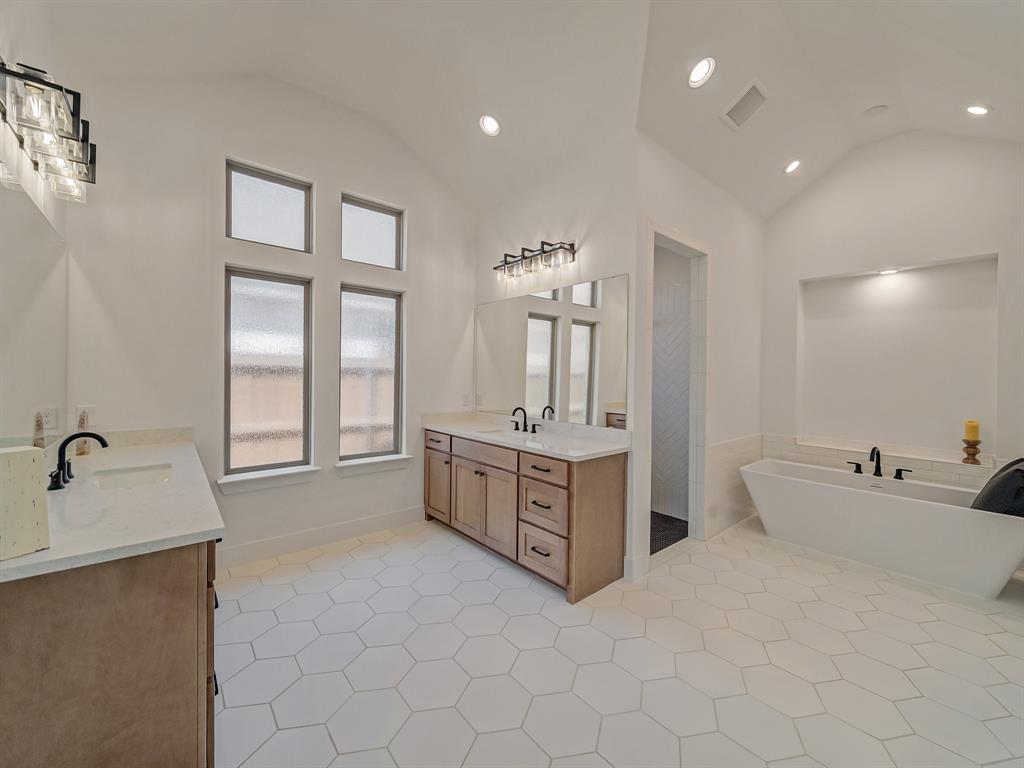 The luxurious primary suite boasts a wall of windows, a free-standing soaking tub, frameless glass shower, dual vanities, solid core doors for added privacy, and two walk-in closets with a private entry to the utility room. Secondary bedrooms offer upgraded carpet and padding with walk-in closets, while a guest suite includes its own upgraded walk-in shower. A thoughtfully added powder room enhances convenience for guests.