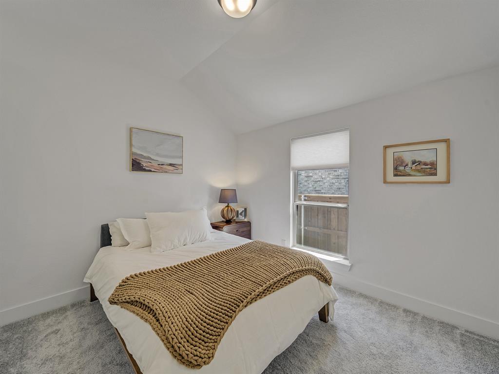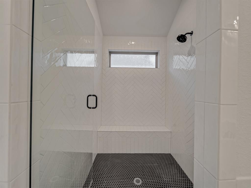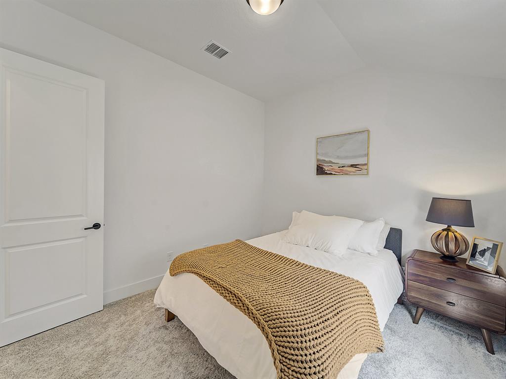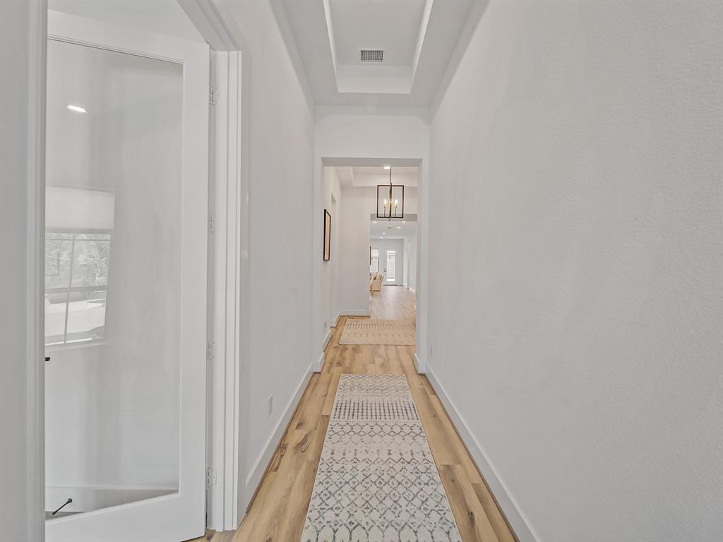 The luxurious primary suite boasts a wall of windows, a free-standing soaking tub, frameless glass shower, dual vanities, solid core doors for added privacy, and two walk-in closets with a private entry to the utility room. Secondary bedrooms offer upgraded carpet and padding with walk-in closets, while a guest suite includes its own upgraded walk-in shower. A thoughtfully added powder room enhances convenience for guests.