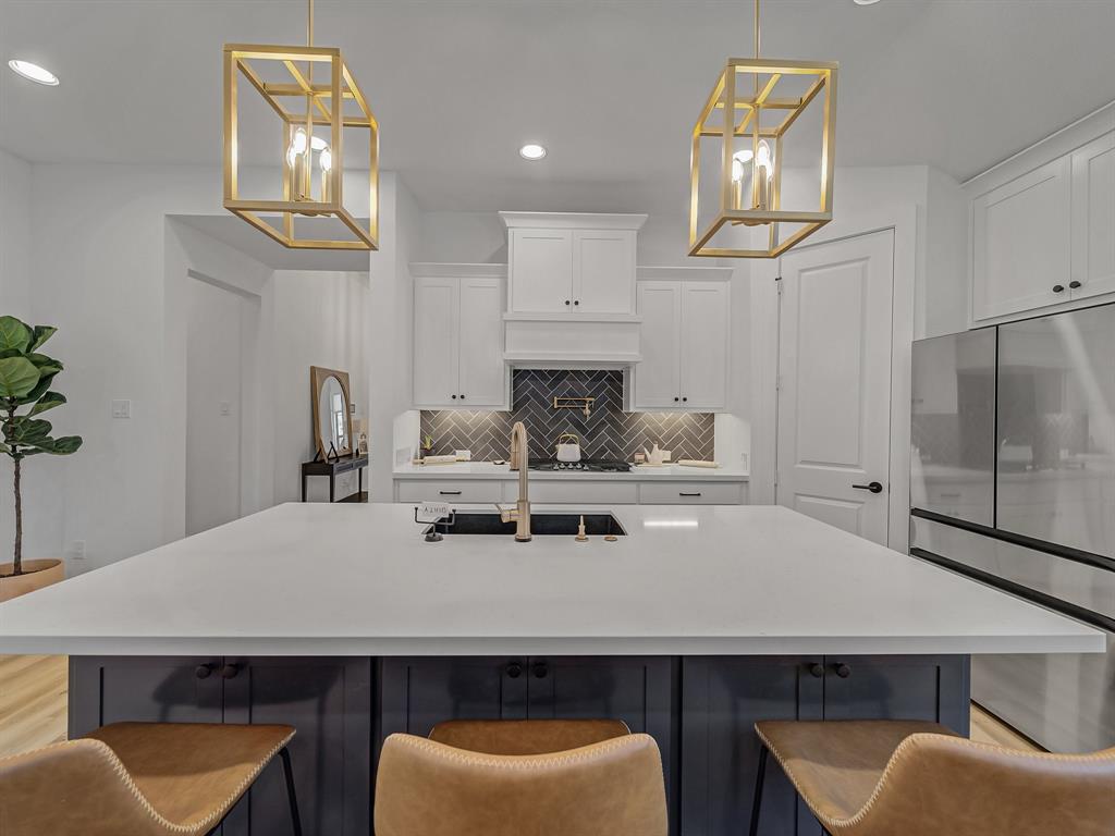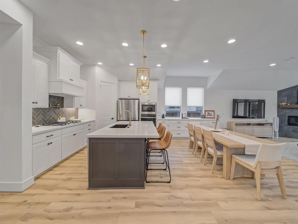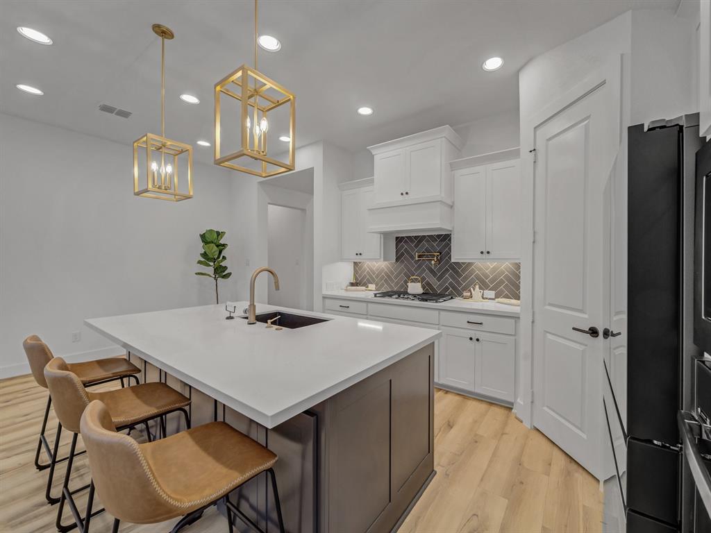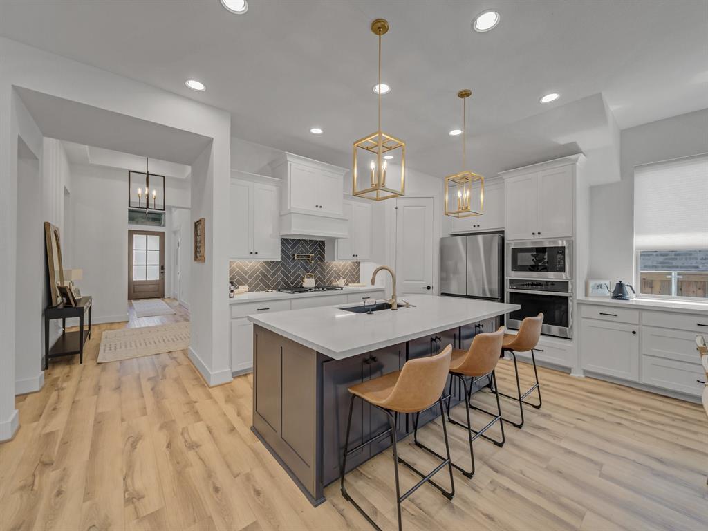 Welcome home to this beautifully upgraded Perry Home on a quiet, family-friendly street with little through traffic and direct trail access. The welcoming entry is framed by a private home office with French doors, opening into a generous family room that flows seamlessly into the dining area and chef-inspired kitchen. The island kitchen features quartz countertops throughout, an upgraded cooktop with pot filler, soft-close drawers, a tap faucet, upgraded under-mount black sink, hidden-control dishwasher, and a spacious corner walk-in pantry.