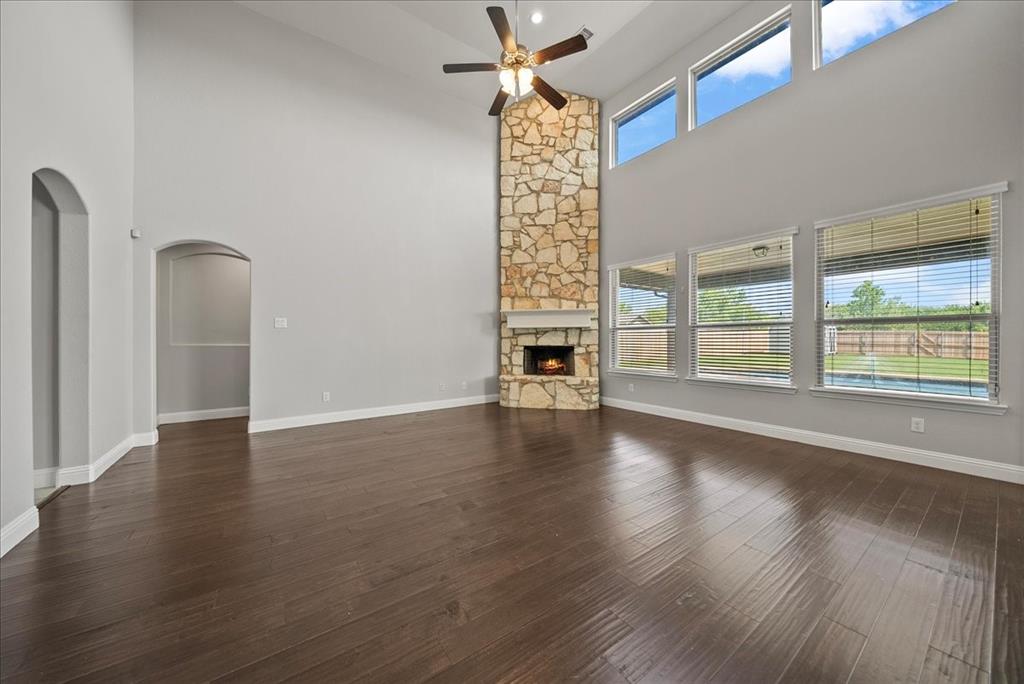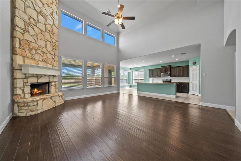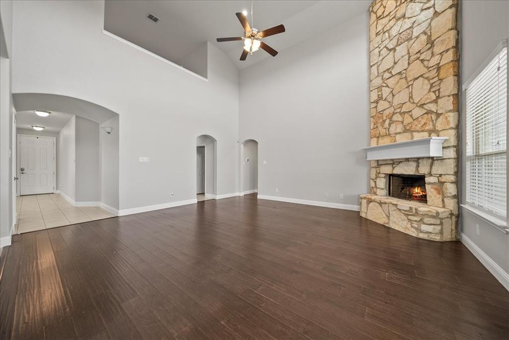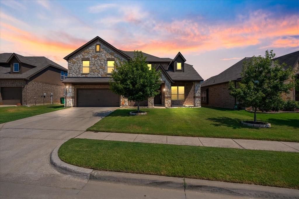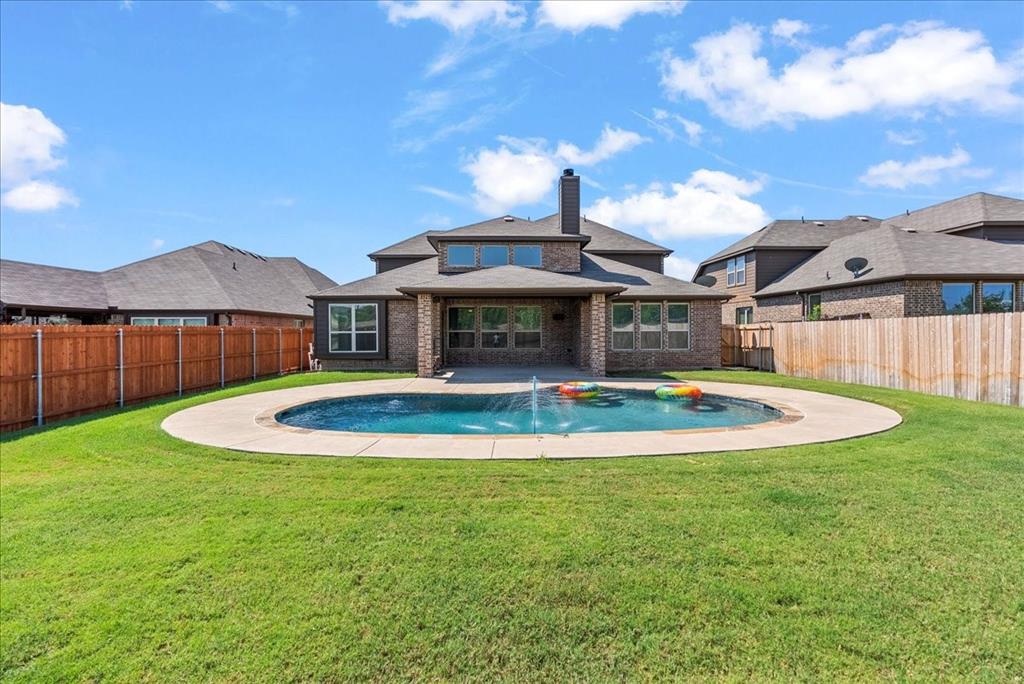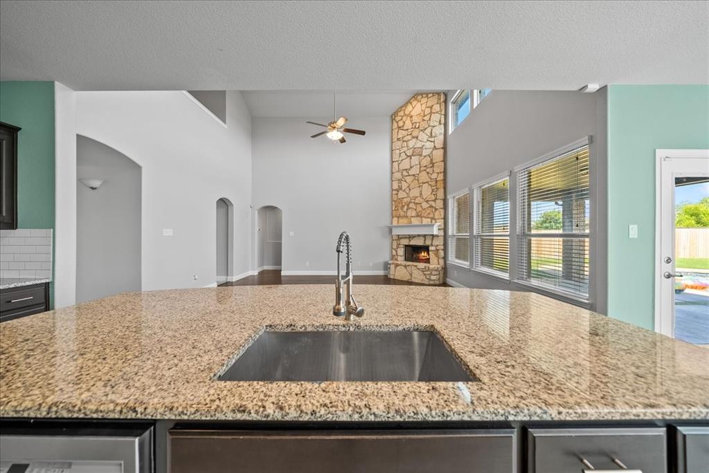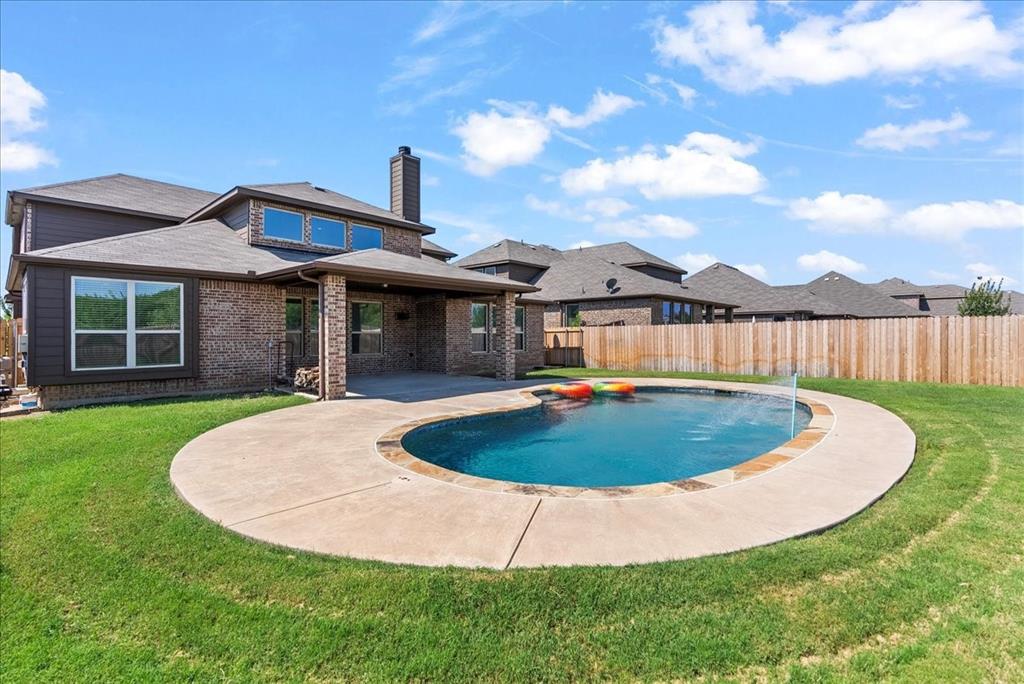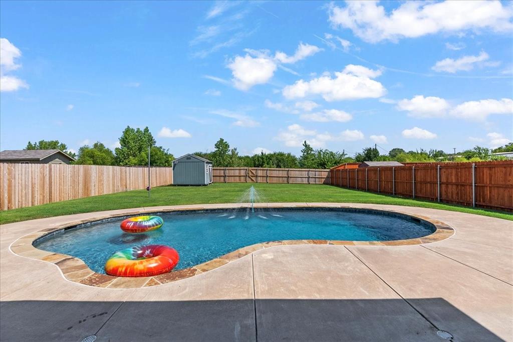 Stunning 5-bedroom, 3-bathroom home offering over 3,000 sq ft of beautifully designed living space on a quarter-acre lot with a sparkling inground Gunite pool and water feature. The striking Austin stone and brick elevation makes a memorable first impression, while the inviting interior features a ceramic tiled entry, elegant staircase with wrought iron balusters, and soaring 20+ ft ceilings in the living room. A wall of windows fills the open-concept living area with natural light, anchored by a dramatic floor-to-ceiling Austin stone fireplace. The spacious kitchen is a chef’s delight with updated granite counters, a large island, ample cabinetry, stainless appliances, and a breakfast nook overlooking the backyard oasis. The primary suite is conveniently located downstairs with a spa-like bath featuring dual vanities, soaking tub, separate shower, and generous walk-in closet, while an additional guest bedroom and full bath are also on the first floor. Upstairs, three large bedrooms share a full bath and surround a massive game room perfect for movie nights or play. Step outside to a generously sized covered patio and expansive backyard designed for entertaining, complete with a large storage shed and no rear neighbors, as the home backs to an open lot. With its functional floor plan, elegant details, and resort-style outdoor living, this property offers the perfect balance of comfort, style, and space in a desirable location.