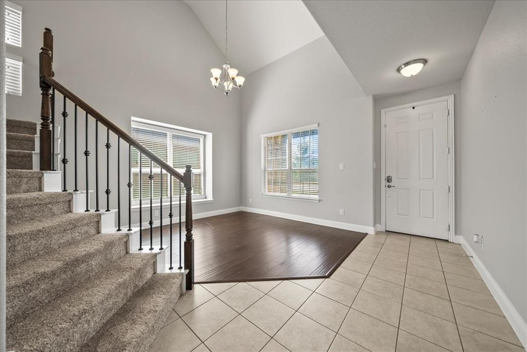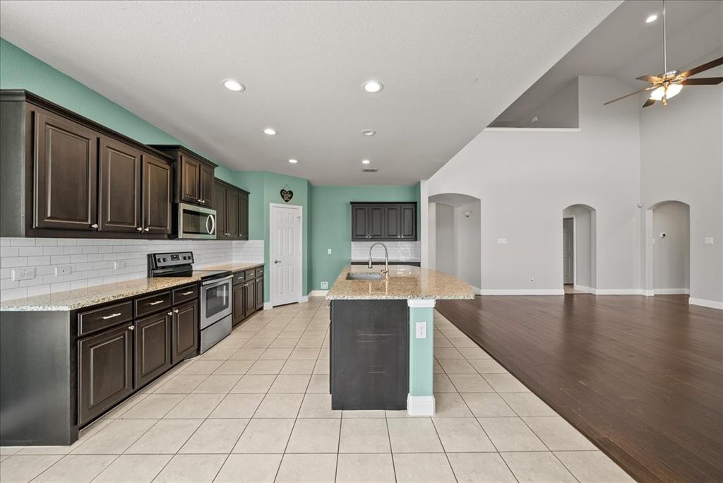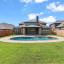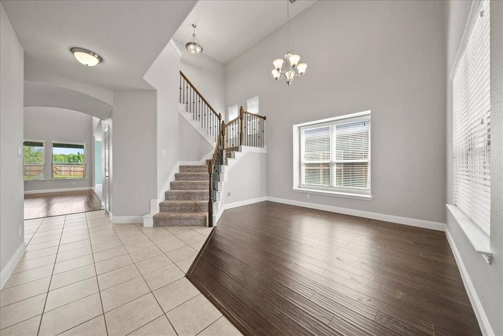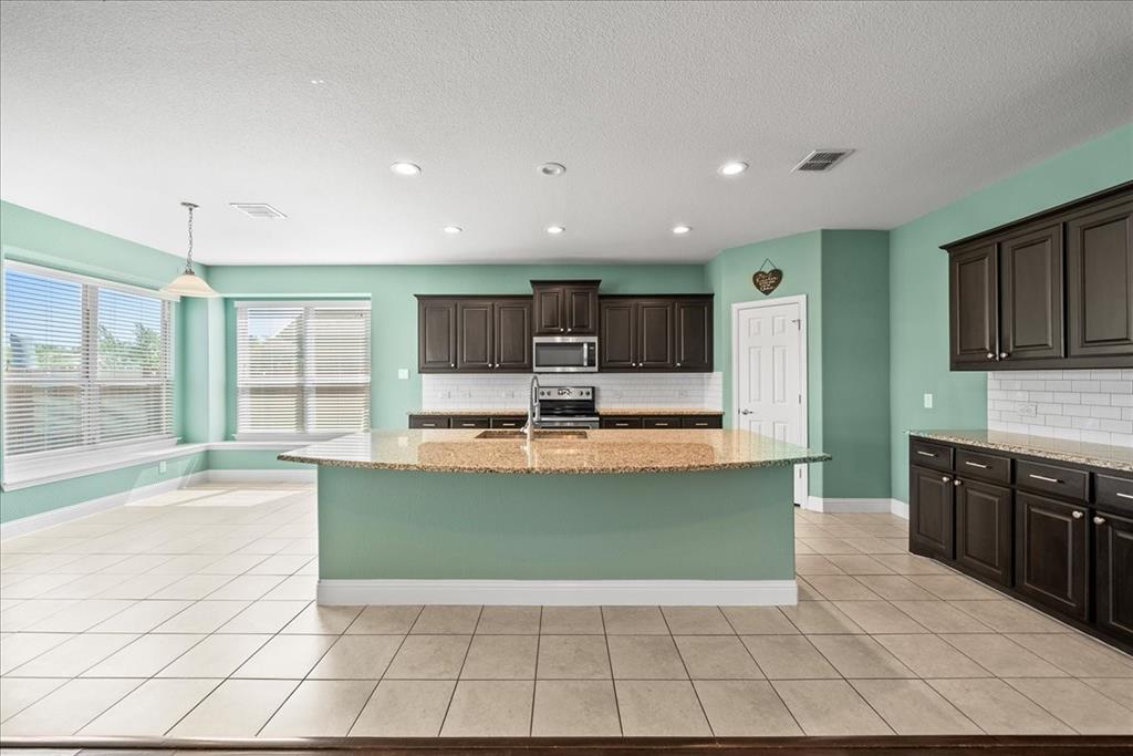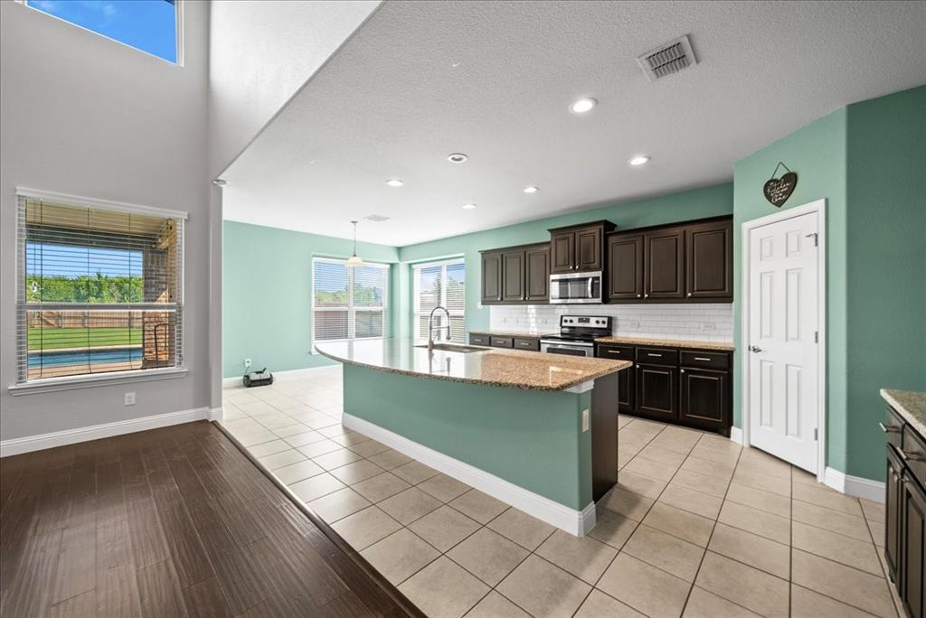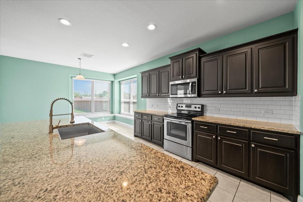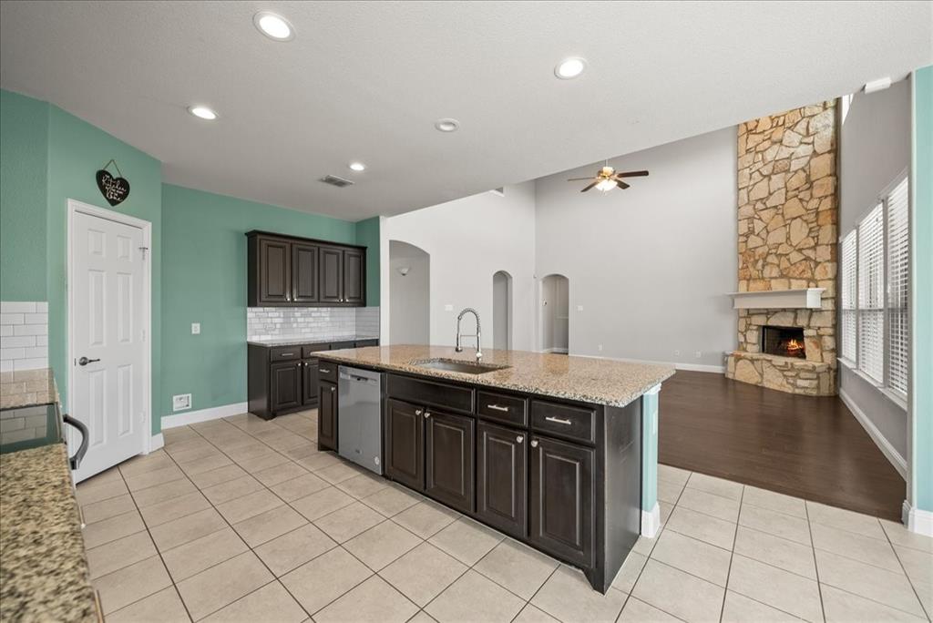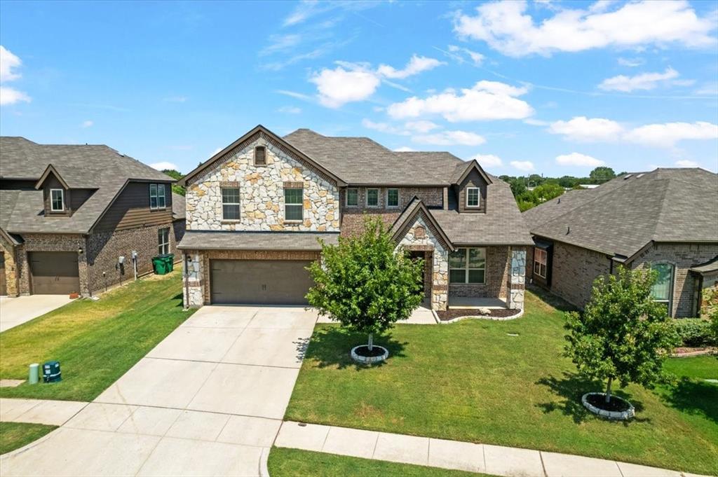 Stunning 5-bedroom, 3-bathroom home offering over 3,000 sq ft of beautifully designed living space on a quarter-acre lot with a sparkling inground Gunite pool and water feature. The striking Austin stone and brick elevation makes a memorable first impression, while the inviting interior features a ceramic tiled entry, elegant staircase with wrought iron balusters, and soaring 20+ ft ceilings in the living room. A wall of windows fills the open-concept living area with natural light, anchored by a dramatic floor-to-ceiling Austin stone fireplace. The spacious kitchen is a chef’s delight with updated granite counters, a large island, ample cabinetry, stainless appliances, and a breakfast nook overlooking the backyard oasis. The primary suite is conveniently located downstairs with a spa-like bath featuring dual vanities, soaking tub, separate shower, and generous walk-in closet, while an additional guest bedroom and full bath are also on the first floor. Upstairs, three large bedrooms share a full bath and surround a massive game room perfect for movie nights or play. Step outside to a generously sized covered patio and expansive backyard designed for entertaining, complete with a large storage shed and no rear neighbors, as the home backs to an open lot. With its functional floor plan, elegant details, and resort-style outdoor living, this property offers the perfect balance of comfort, style, and space in a desirable location.