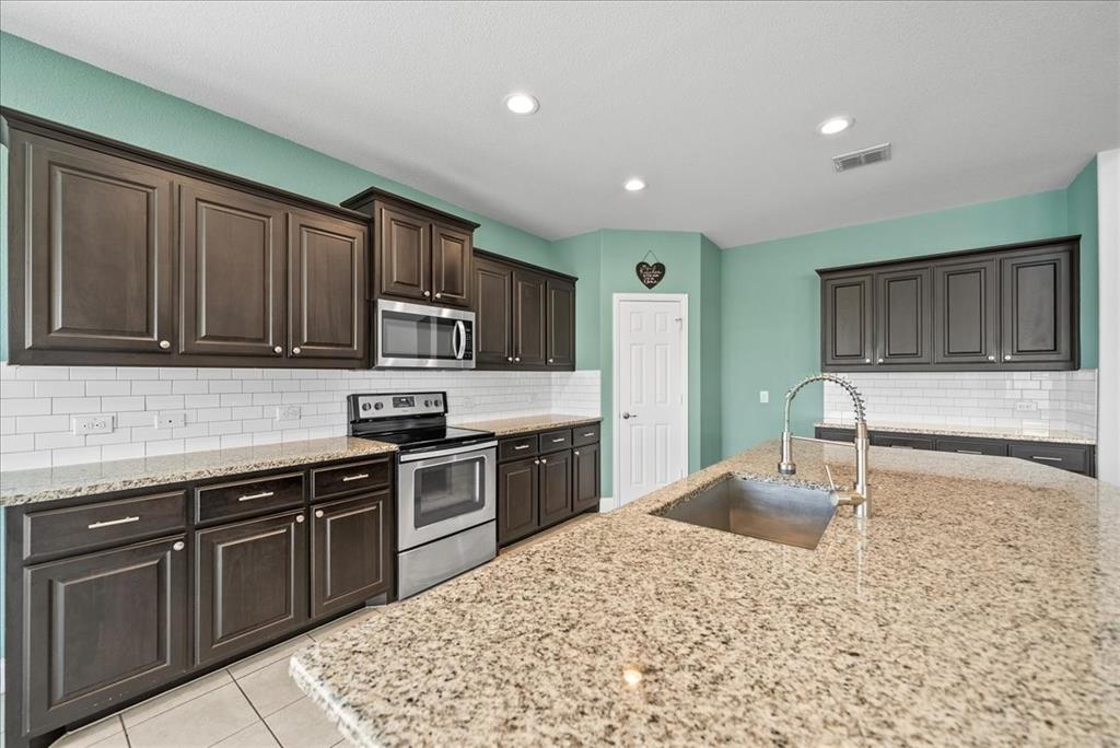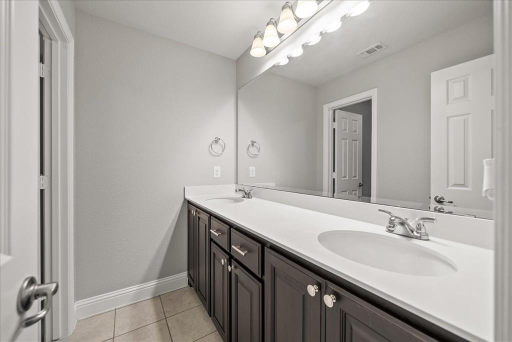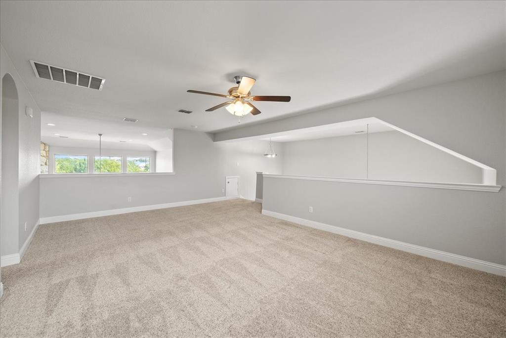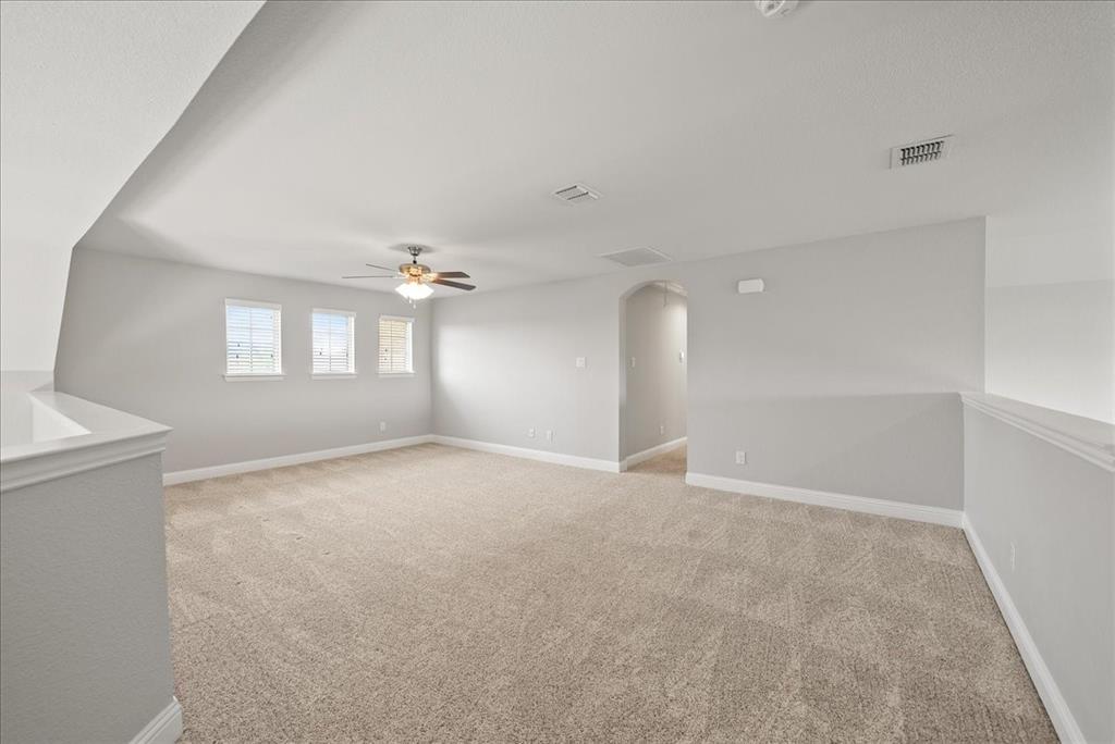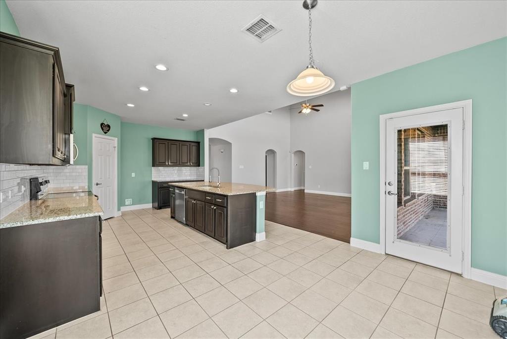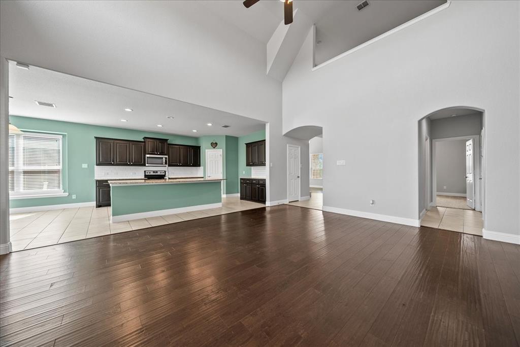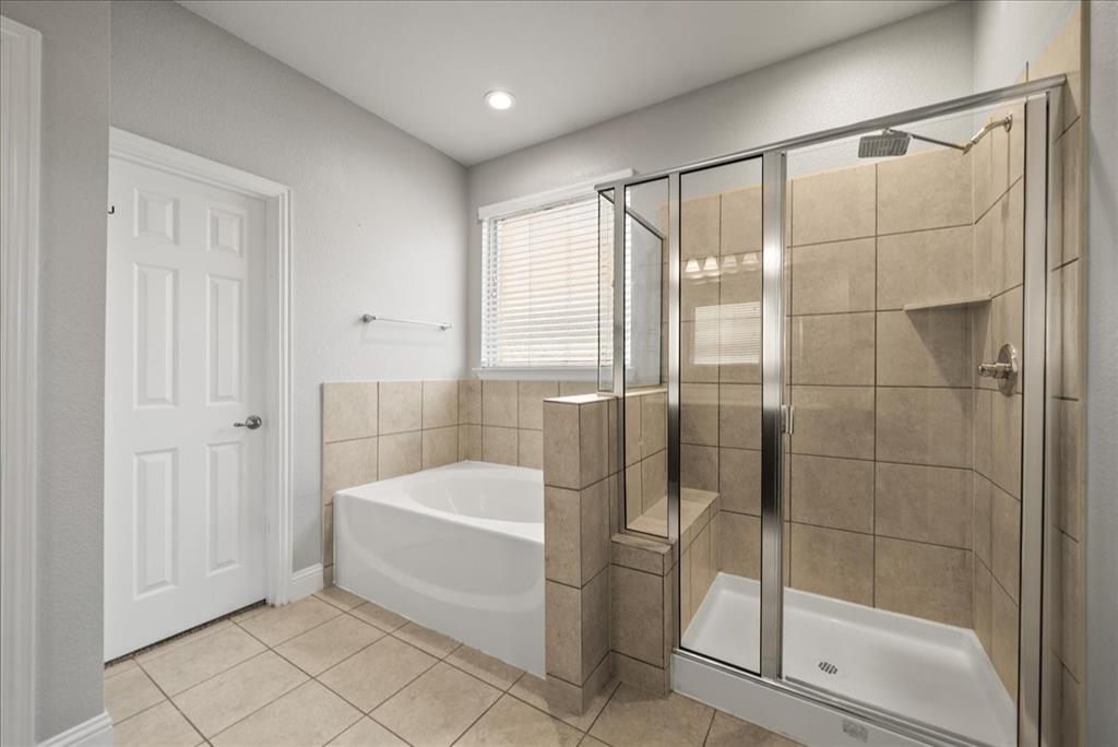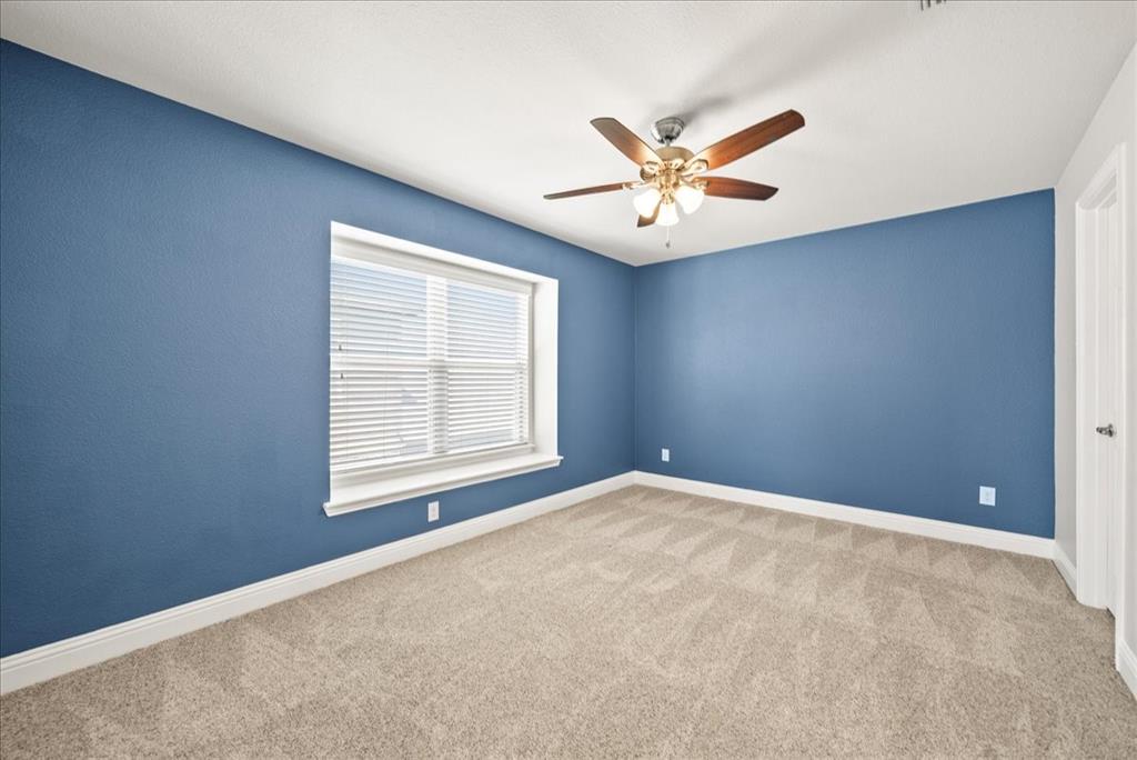 Stunning 5-bedroom, 3-bathroom home offering over 3,000 sq ft of beautifully designed living space on a quarter-acre lot with a sparkling inground Gunite pool and water feature. The striking Austin stone and brick elevation makes a memorable first impression, while the inviting interior features a ceramic tiled entry, elegant staircase with wrought iron balusters, and soaring 20+ ft ceilings in the living room. A wall of windows fills the open-concept living area with natural light, anchored by a dramatic floor-to-ceiling Austin stone fireplace. The spacious kitchen is a chef’s delight with updated granite counters, a large island, ample cabinetry, stainless appliances, and a breakfast nook overlooking the backyard oasis. The primary suite is conveniently located downstairs with a spa-like bath featuring dual vanities, soaking tub, separate shower, and generous walk-in closet, while an additional guest bedroom and full bath are also on the first floor. Upstairs, three large bedrooms share a full bath and surround a massive game room perfect for movie nights or play. Step outside to a generously sized covered patio and expansive backyard designed for entertaining, complete with a large storage shed and no rear neighbors, as the home backs to an open lot. With its functional floor plan, elegant details, and resort-style outdoor living, this property offers the perfect balance of comfort, style, and space in a desirable location.