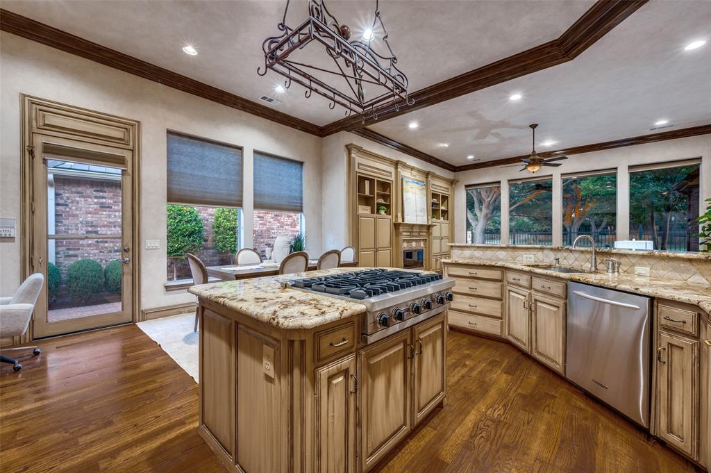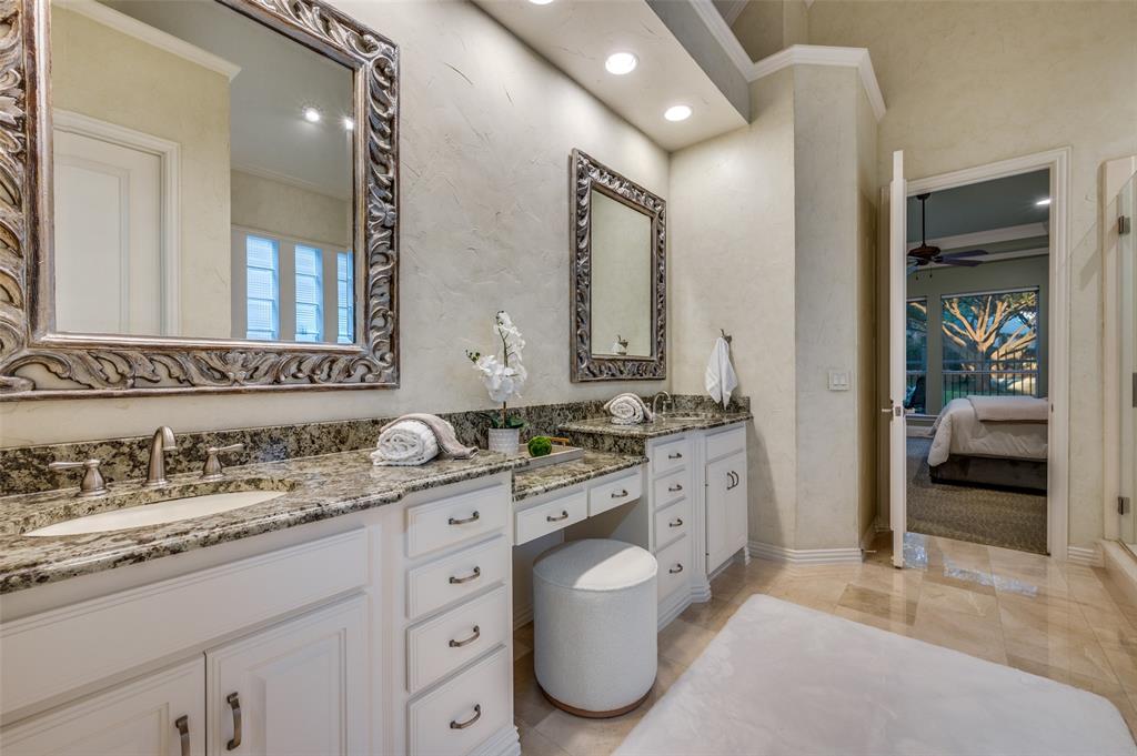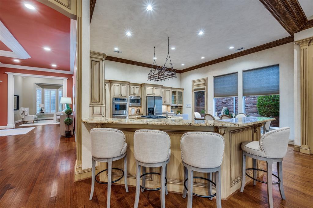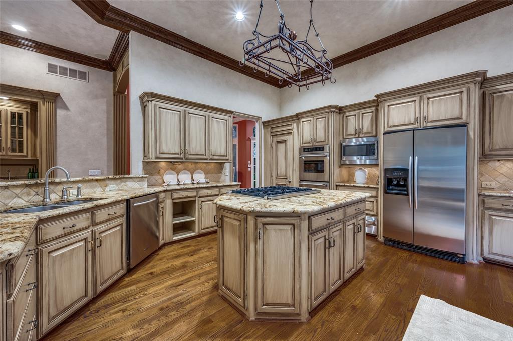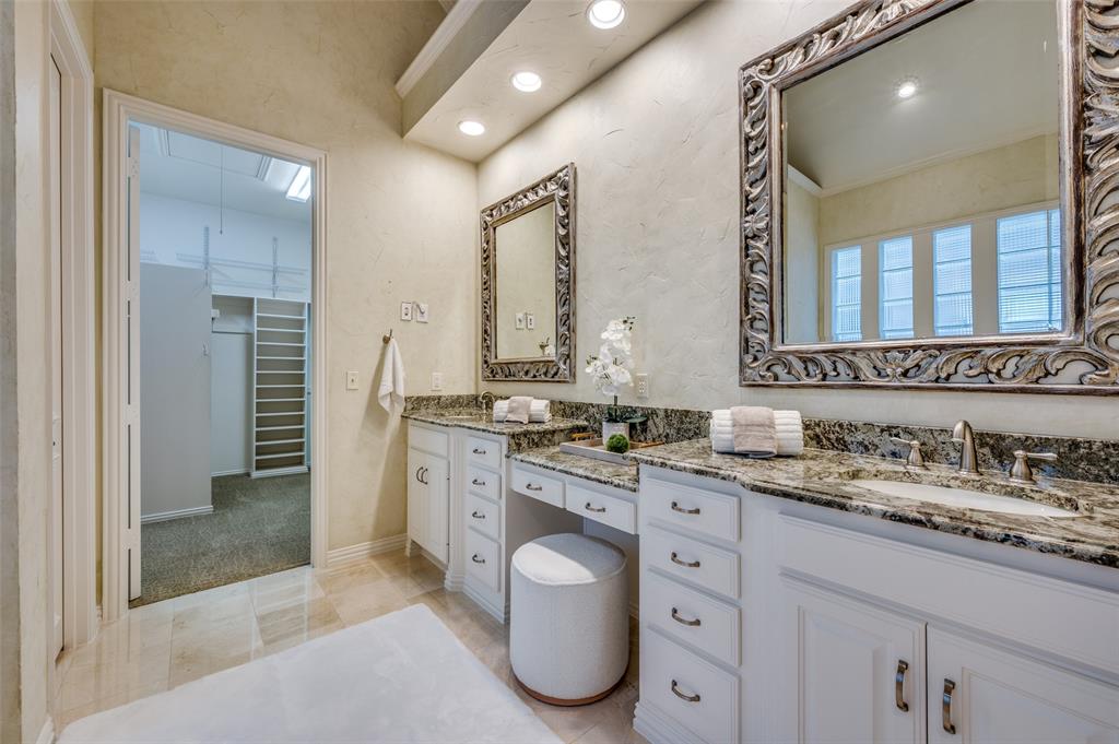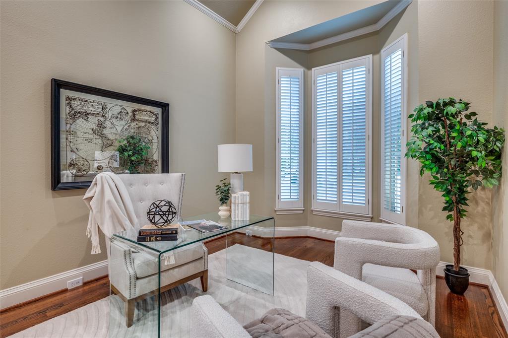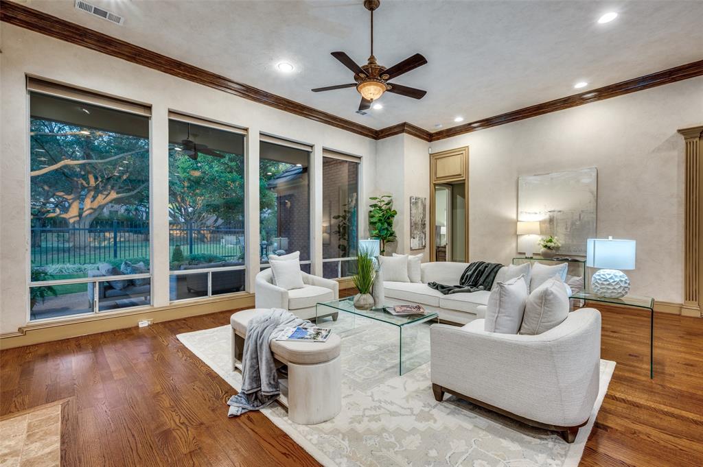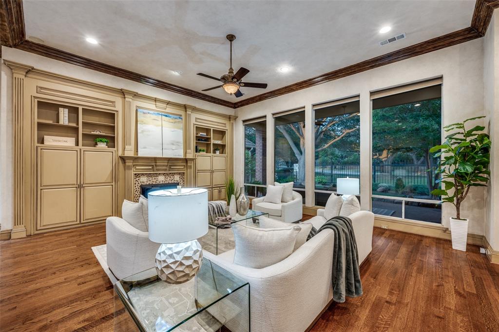 OPEN HOUSE SUN (9-14) 2-4PM. This exquisite, updated, single-story Steve Roberts custom home is nestled in the prestigious Fairways section of Stonebriar Village, a guard-gated, resort-style golf course community. Backing to a peaceful greenbelt and neighborhood pond, the home boasts outstanding curb appeal and an east-facing backyard. Meticulously maintained, the residence showcases a versatile open-concept design with soaring ceilings, rich hardwood floors, elegant crown molding, and walls of windows that fill the interiors with natural light. A gracious entryway opens to a sophisticated dining room and a formal living area that can also serve as a private study. The heart of the home centers around a spacious, well-appointed kitchen with a sunlit breakfast nook, flowing seamlessly into an inviting family room with a cozy fireplace, custom built-ins, and expansive views of the serene greenbelt. The private primary suite is a true retreat, featuring a sitting area wrapped in windows, dual vanities, a soaking tub, an oversized separate shower, and a custom-designed closet. Two additional generously sized bedrooms are located at the front of the home and share a Jack-and-Jill bath. Outdoors, mature trees and impeccable landscaping create a picturesque setting. The low-maintenance backyard is enhanced with premium artificial turf, offering year-round beauty and functionality. With exceptional craftsmanship throughout and a coveted location just minutes from The Star, Legacy West, the new PGA Headquarters, Toyota, world-class dining, shopping, entertainment, sporting events, and major tollways, this home perfectly blends timeless elegance with unmatched convenience.
