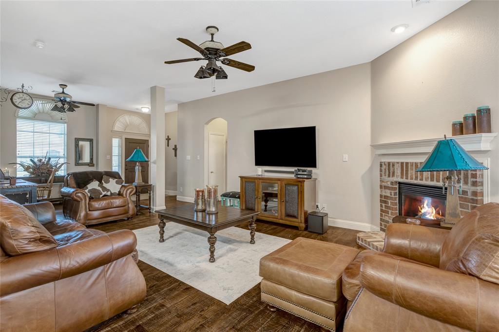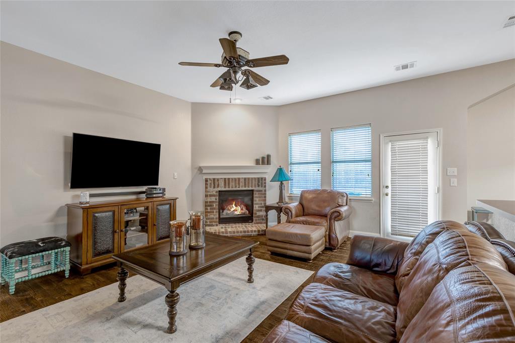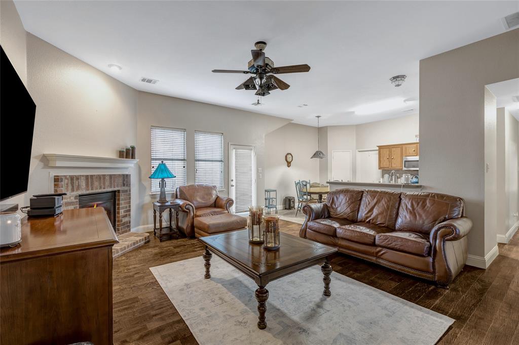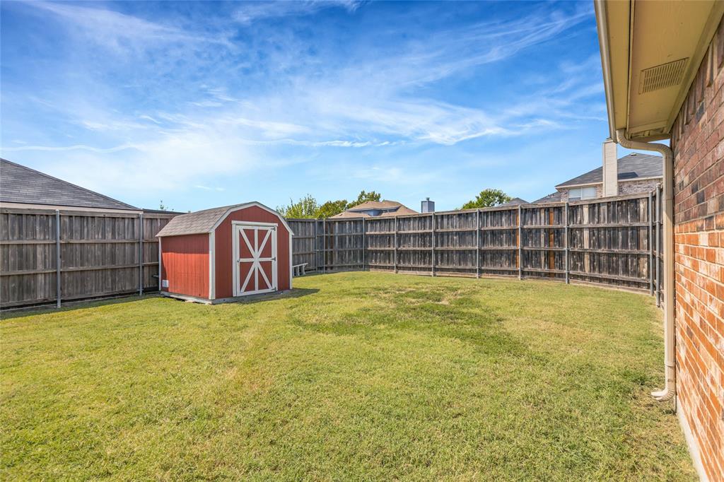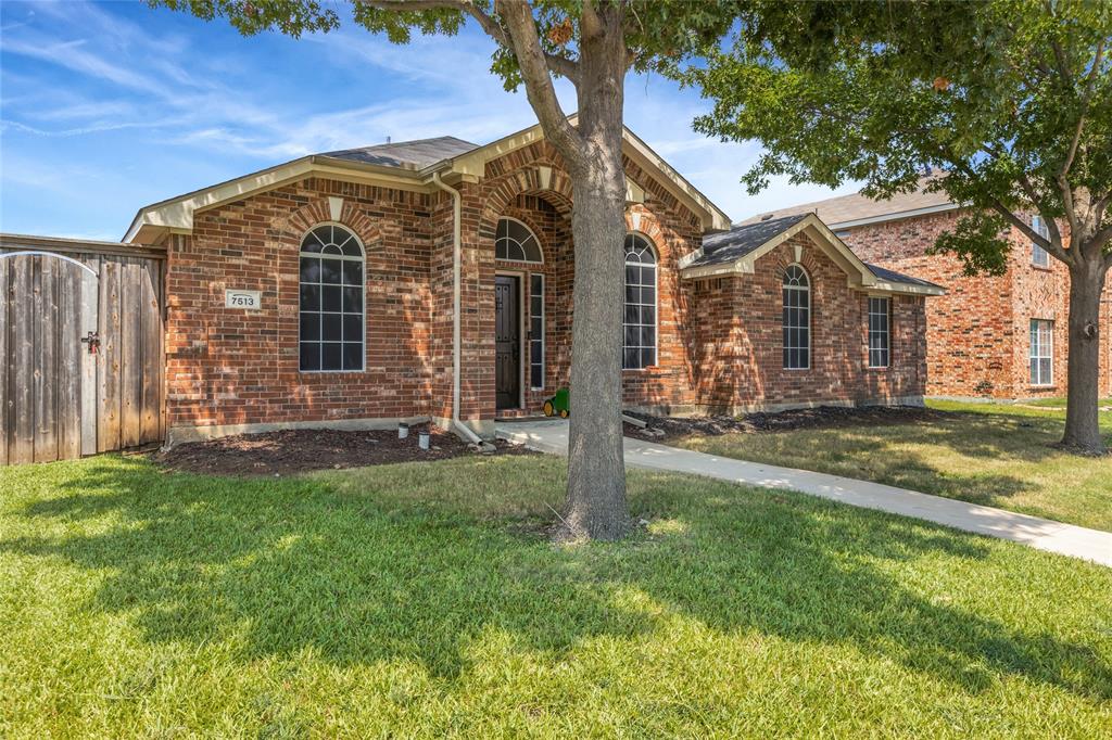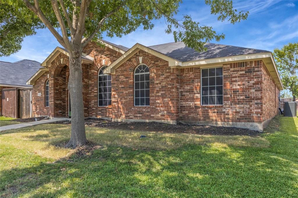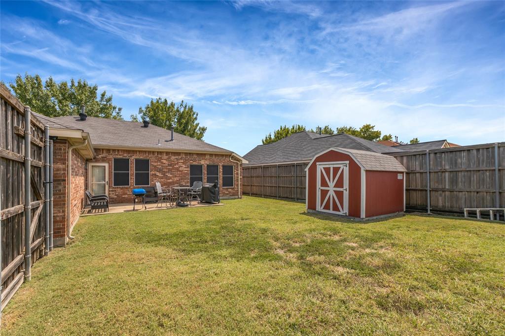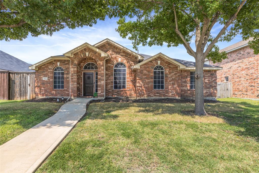 PRIME LOCATION! this Brick home is tucked in a desirable neighborhood with easy access to the President George Bush Turnpike—perfect for commuters. Step inside to an OPEN FLOOR PLAN concept with TALL CEILINGS offering WIDE-PLANK HANDSCRAPED WOOD FLOORING that adds warmth and character throughout the main living spaces! Spacious living room features Brick fireplace with Gas Logs with easy access to eat-in kitchen. The primary suite features a jetted tub, and separate shower, offering a private and relaxing retreat. Outside, enjoy the 8 Ft. Privacy wood-fenced backyard with Tuff Shed (stays with & patio)—ENJOY morning coffee, weekend barbecues, or unwinding at the end of the day. With its thoughtful layout and desirable features, this home blends comfort, space, and convenience! Carpet replaced April 2025 plus HVAC replaced 2023!