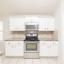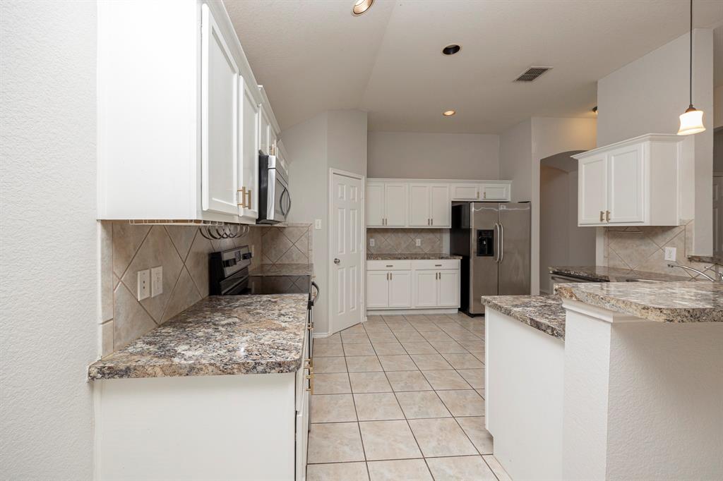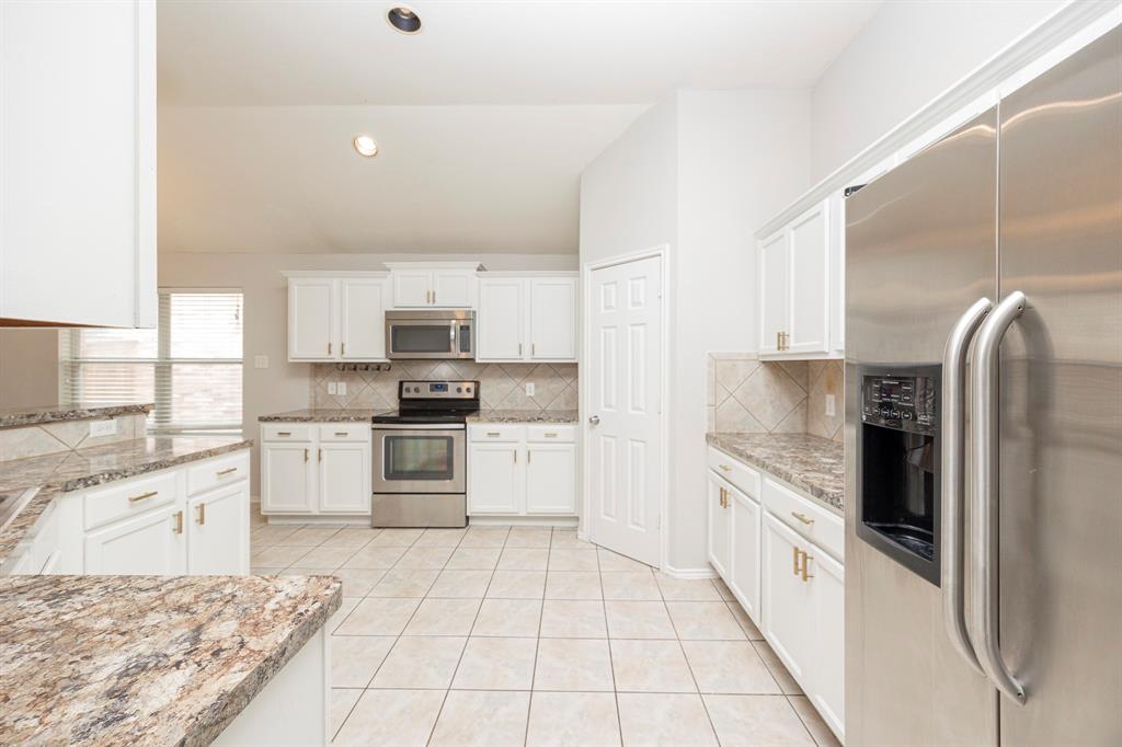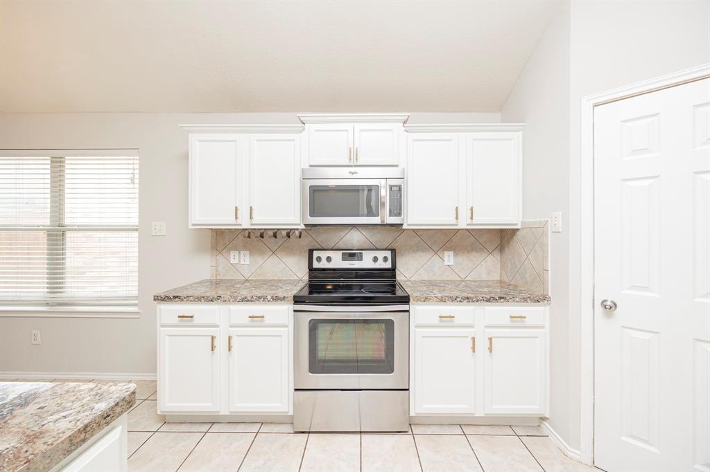 The kitchen is equipped with white cabinetry, brushed gold hardware, granite countertops, and stainless steel appliances, including a French-door refrigerator, built-in microwave, and gas-electric range. A diamond-patterned backsplash, central island, and recessed lighting add style and function.