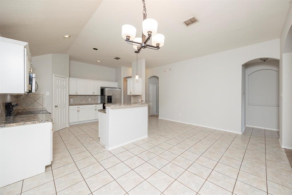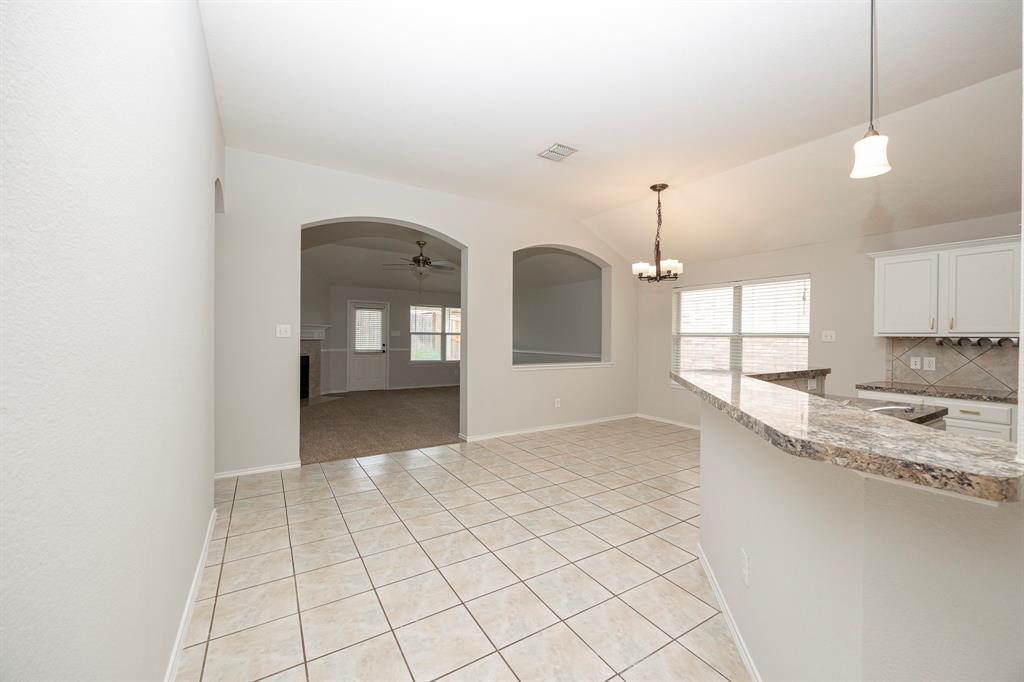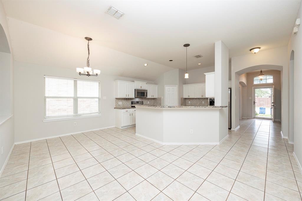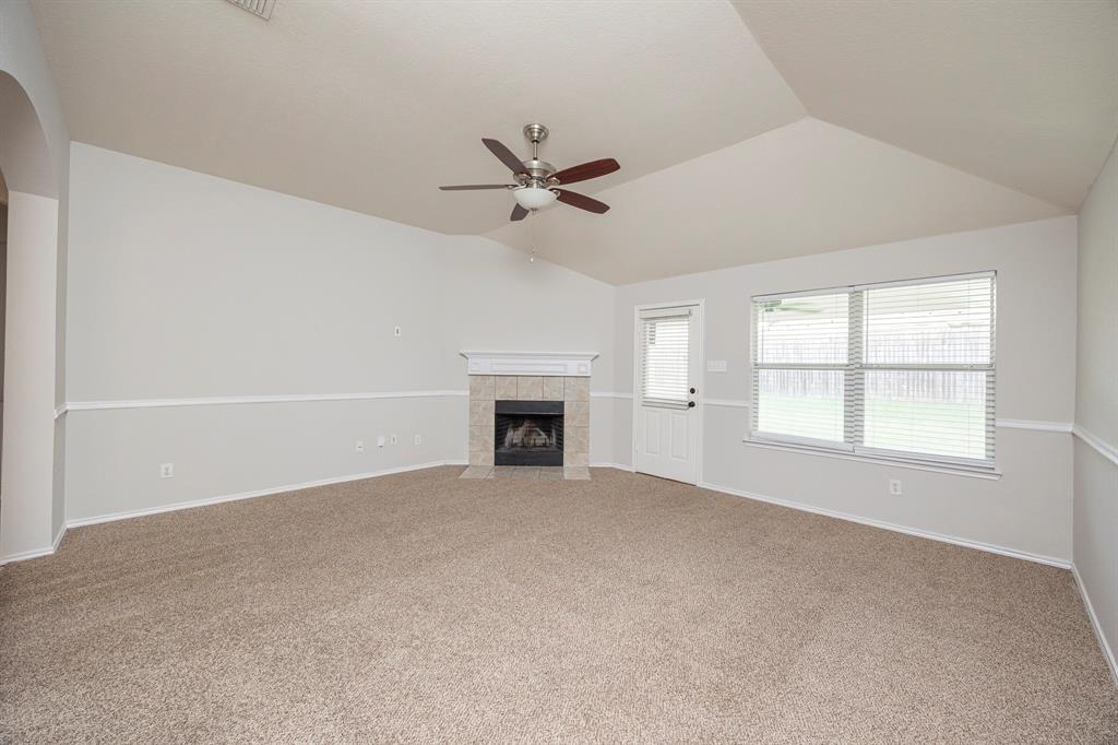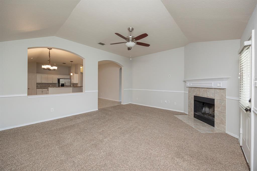 Step inside to a sunlit open-concept layout with vaulted ceilings, plush carpeting, and rich tile floors. The living room boasts a white-mantel fireplace, arched kitchen views, and soft neutral tones ideal for cozy evenings or entertaining guests. A modern chandelier graces the dining area, surrounded by large windows and seamless flow into the chef’s kitchen.