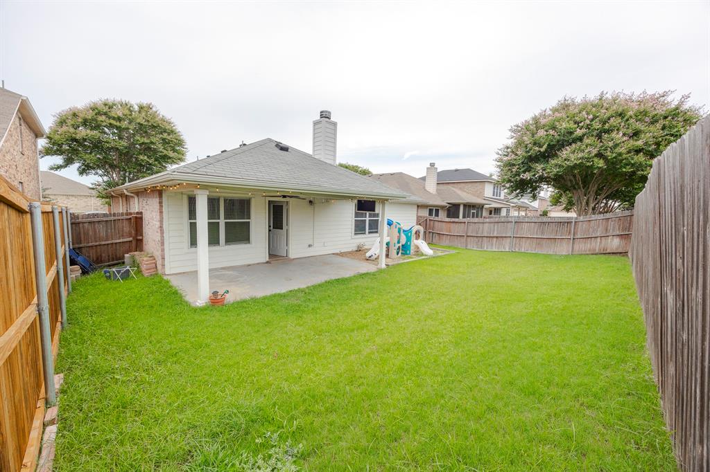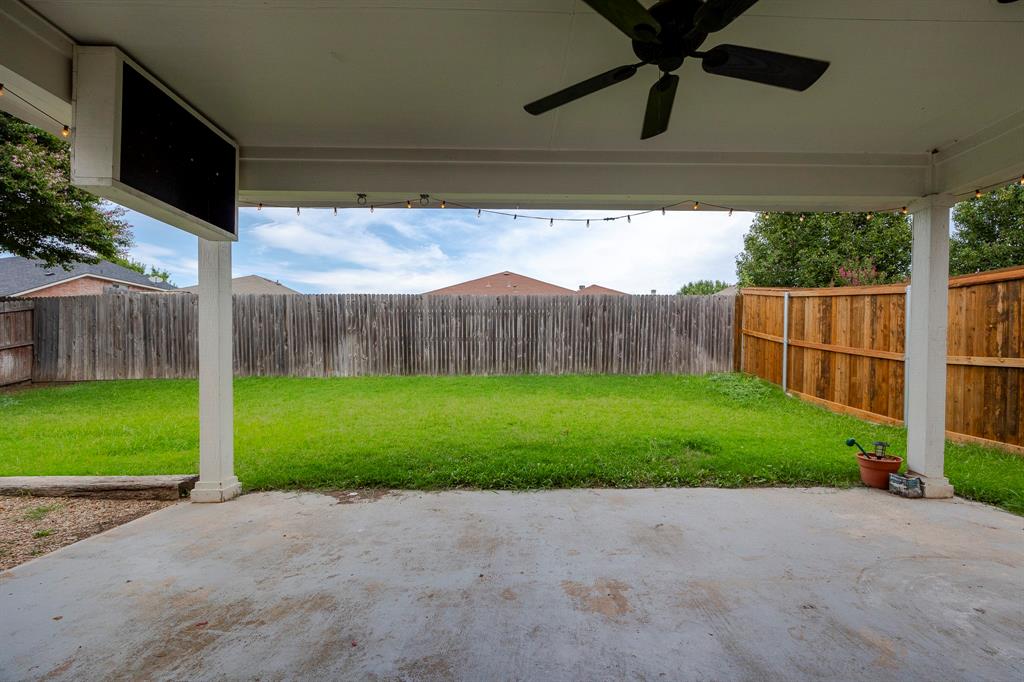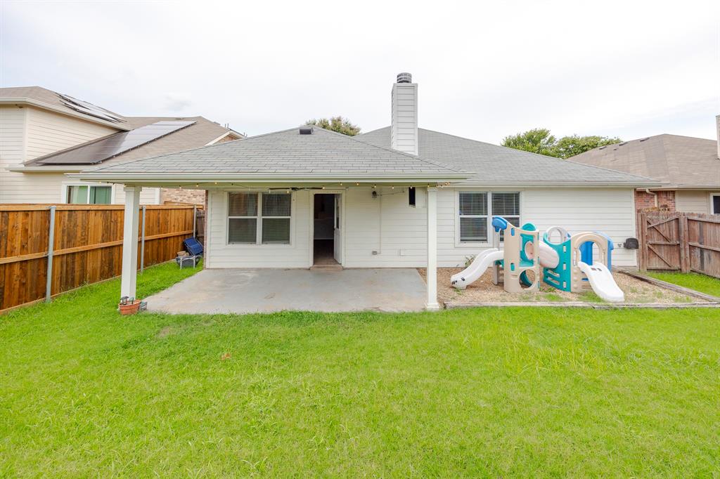 The fully fenced backyard includes a concrete-covered patio with ceiling fan, string lights, and white columns—ideal for relaxing or dining al fresco. A cheerful playset invites family fun, while mature fencing and neighboring greenery create a private, peaceful environment.