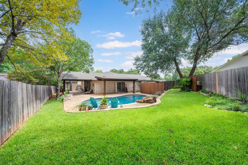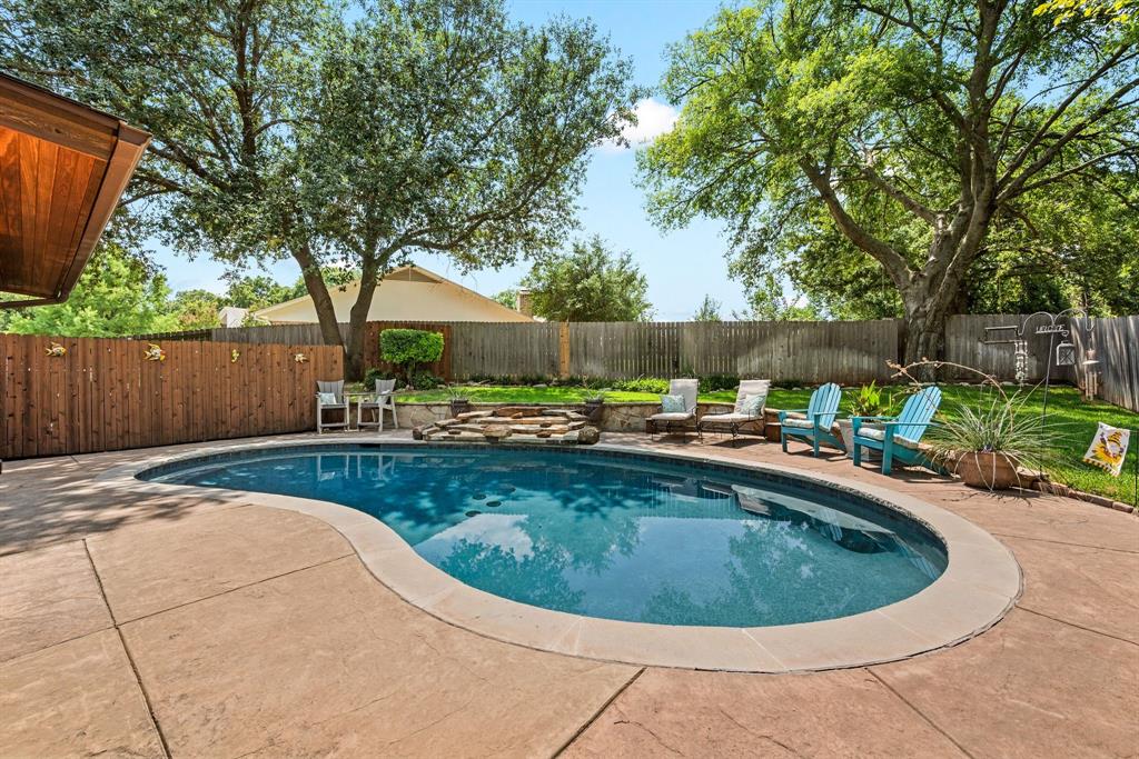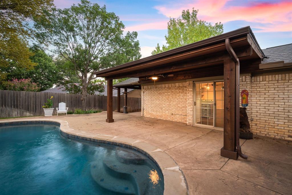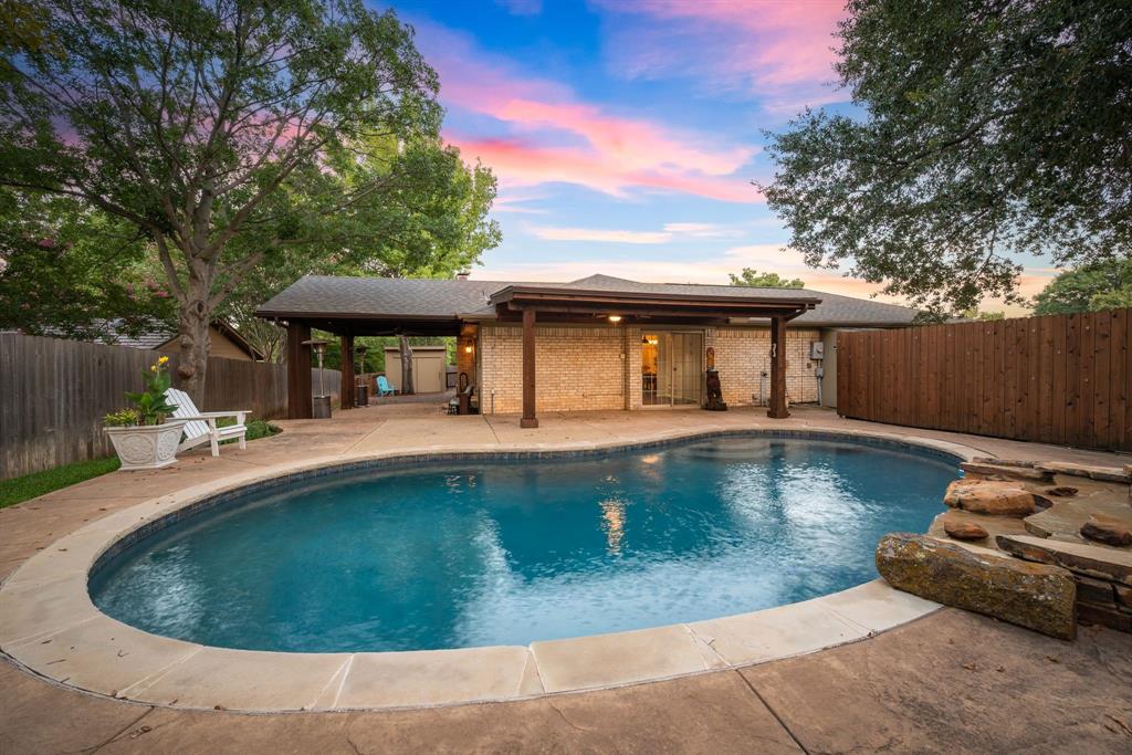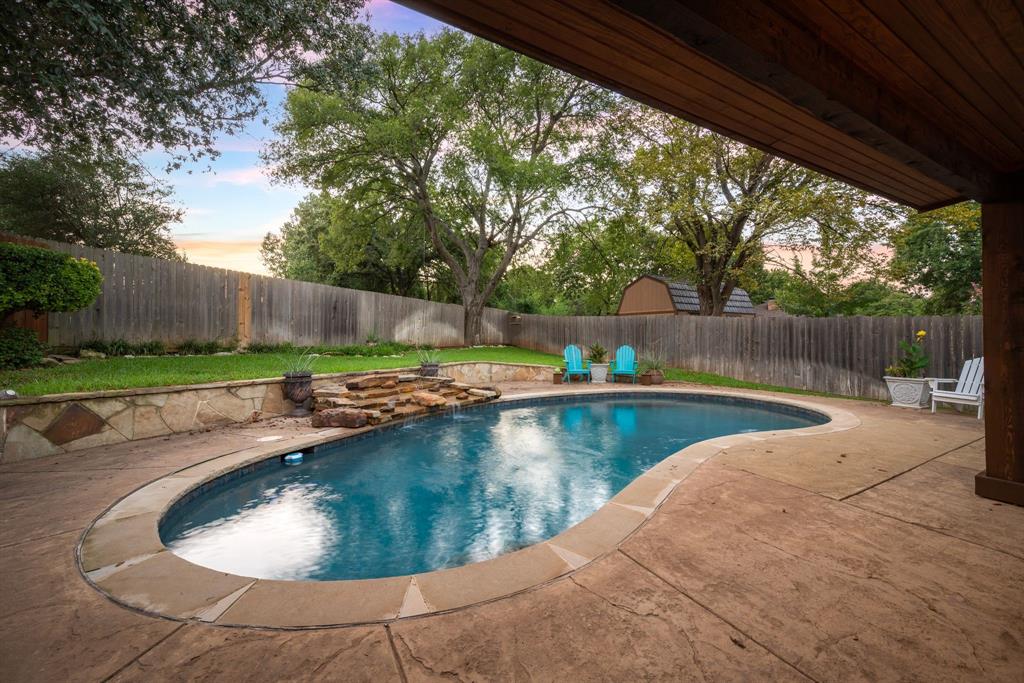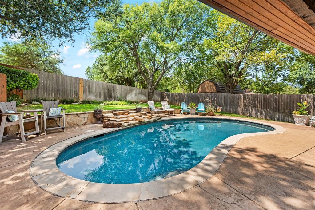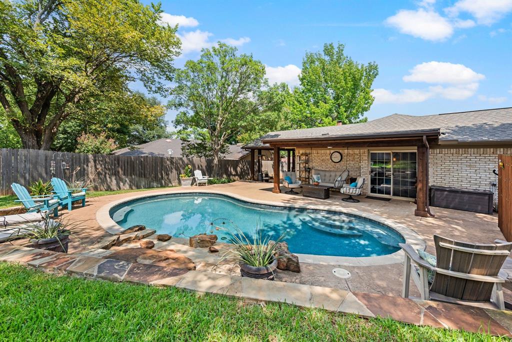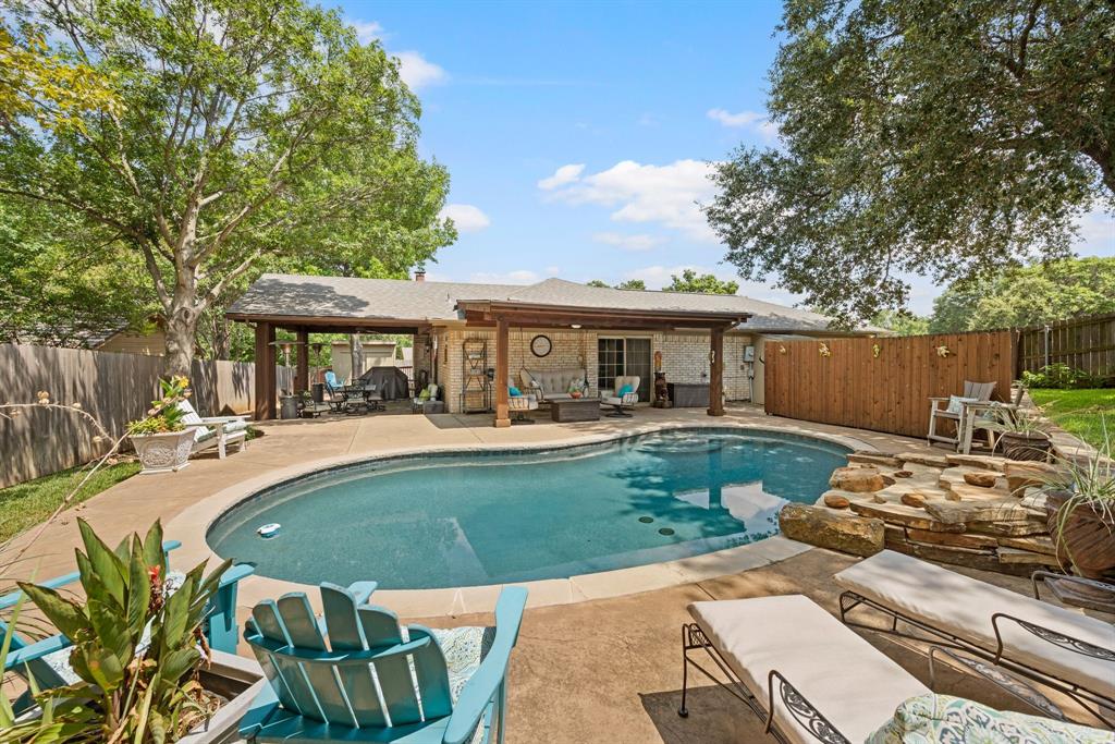 Welcome to this beautifully maintained, one story, turnkey 4-bedroom, 2-bath home on a cul-de-sac in the desirable Timber Ridge Addition. Recent updates include a new roof, PVC plumbing throughout, and new windows that bring in an abundance of natural light. Step inside to an inviting open-concept layout that seamlessly connects the living, dining, and kitchen areas lined with wood floors throughout, perfect for everyday living or entertaining guests. The kitchen offers generous cabinet space and a cozy breakfast area with views of the backyard retreat. Outdoors, enjoy the covered patios and a pergola overlooking a sparkling pool with a soothing water feature. A shed with electricity makes the ideal workshop, hobby space, or extra storage. Behind the fence, there’s ample room for boat or bike parking adding optimal convenience. Nestled in an established neighborhood surrounded by mature trees, this home offers the perfect combination of comfort, functionality, and outdoor enjoyment, making it truly a place to call home.