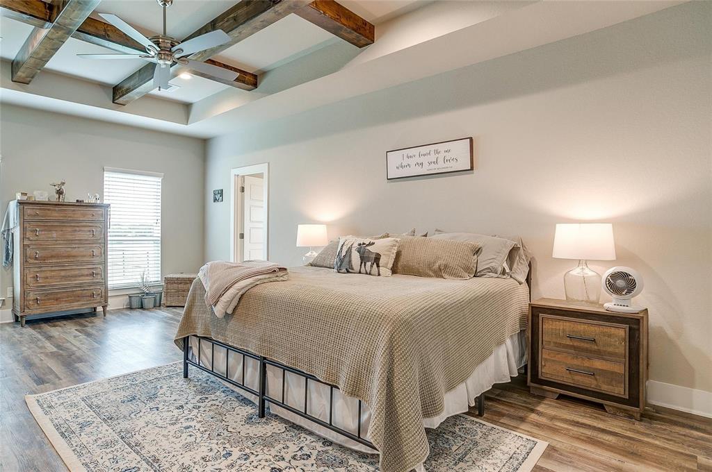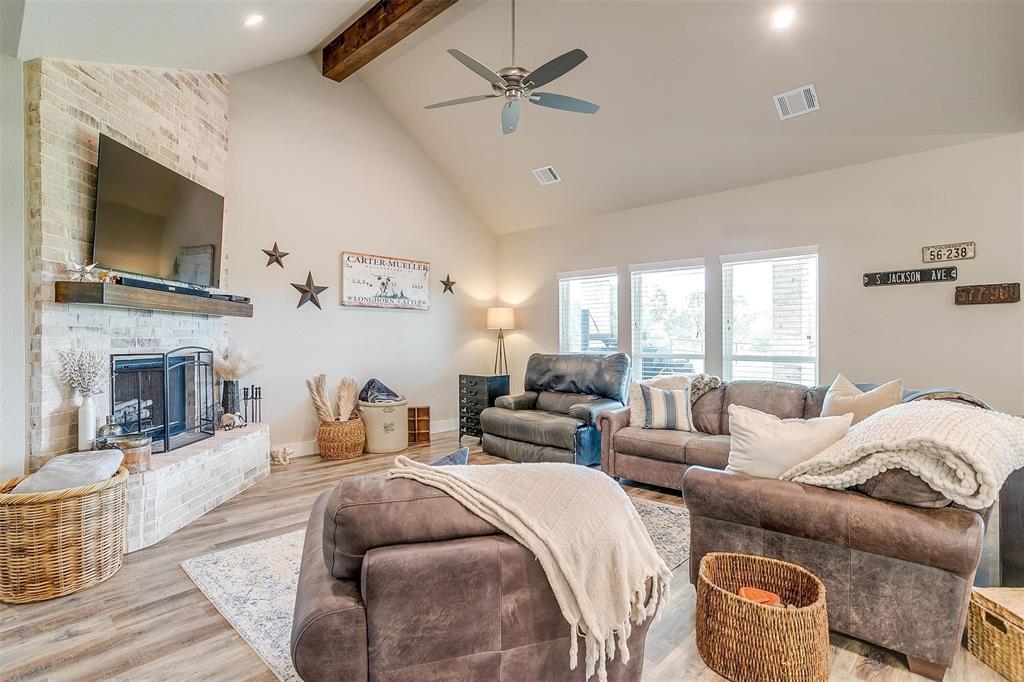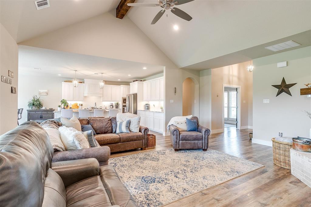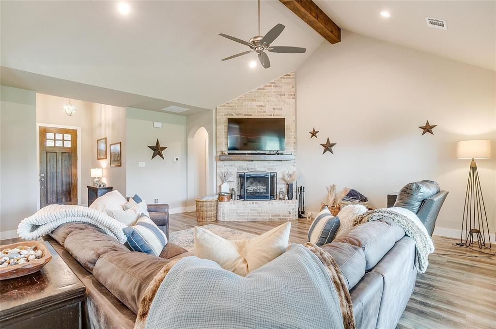 Welcome to your dream home, perfectly situated on a pristine 2-acre lot—ideal for soaking in the serenity of country living. At the front of the house there is a spacious flex room that’s perfect as a home office, playroom, or extra living area. There is beautiful wood-look flooring throughout—no carpet anywhere—offering both style and low-maintenance living. The inviting living room boasts soaring vaulted ceilings with striking exposed beams and a stunning stone fireplace that creates the perfect cozy focal point. The open-concept kitchen is a host’s dream, complete with a large center island, dedicated coffee bar, walk-in pantry, and generous cabinet space for all your storage needs. Tucked away for privacy, the primary suite offers a peaceful retreat. The spa-like ensuite bath includes dual vanities, a luxurious soaking tub, and a spacious walk-in closet. This home is loaded with thoughtful upgrades including a water softener and filtration system, in-ground propane tank, and custom blinds. Enjoy peaceful mornings and tranquil evenings on the covered back patio, where you can take in the quiet countryside. Don’t miss your chance to experience the best of country living in this move-in ready home!