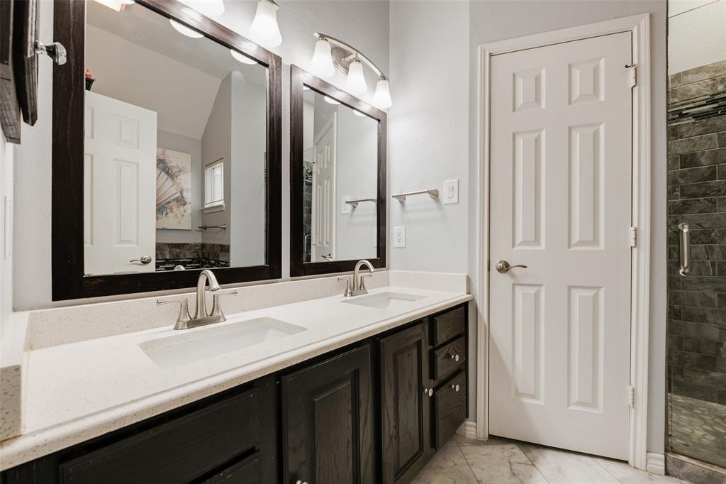 Step into a gorgeous home, superbly maintained with a fantastic open layout. A lovely corridor of greenery leads up to the side-facing entrance. Within, guests and loved ones are welcomed into an expansive living area, open to the kitchen, with lots of natural light and a cozy wood-burning fireplace. The kitchen features exquisite granite counters, full-height tile backsplashes, a two-basin stainless sink, and plenty of cabinet storage space. The primary bedroom is spacious under a vaulted ceiling and offers a fabulous en suite with a dual vanity, a frameless glass & tile shower with rainhead & wand sprayer, and a sumptuous oversized soaking tub. Out back, enjoy a private retreat with a tiled patio under a beautiful pergola and an artfully landscaped space surrounded by tall wood fencing. Easy access to I35E and close to spectacular Lewisville Lake with parks, campgrounds, marinas, and more. Nearby plentiful shopping, dining, and entertainment at The Shops at Highland Village as well as historic Old Town Lewisville with arts, live performances, an urban park, vintage shopping, and dining.