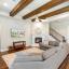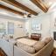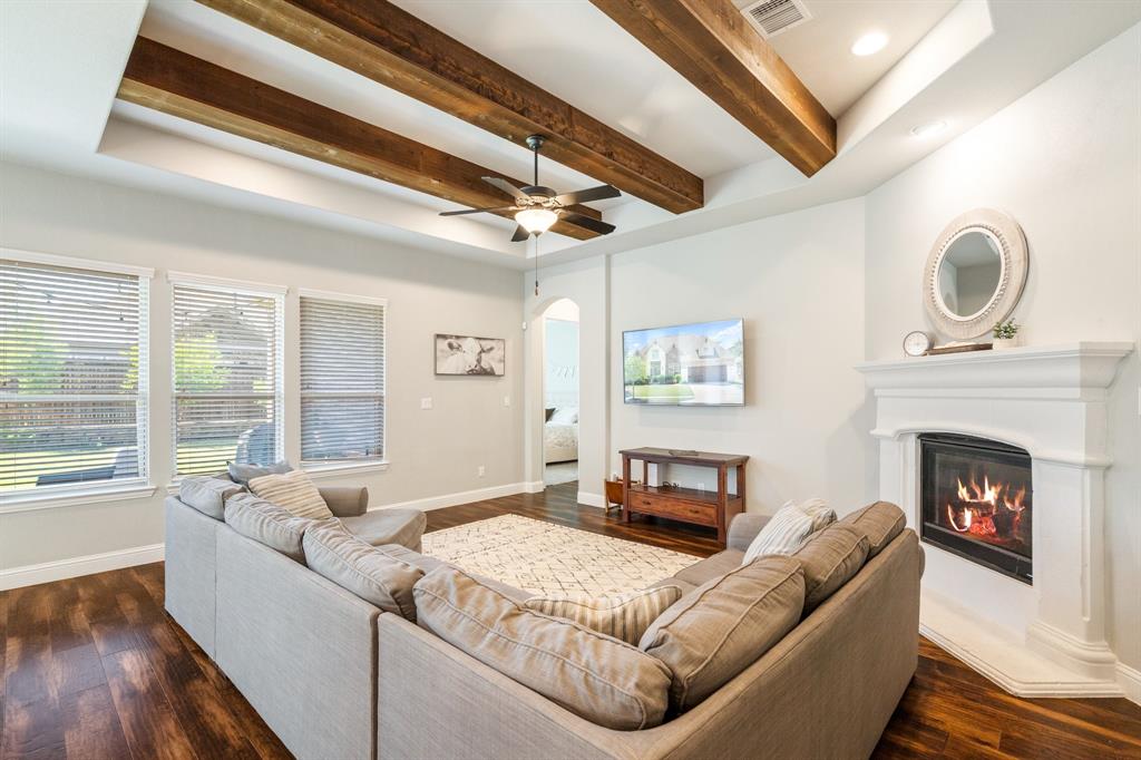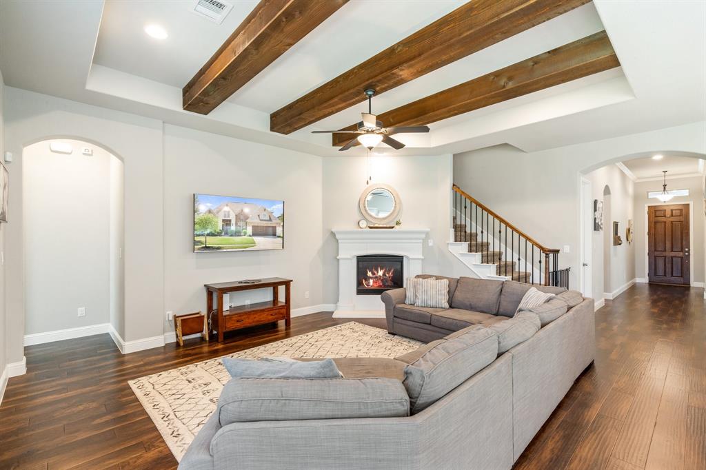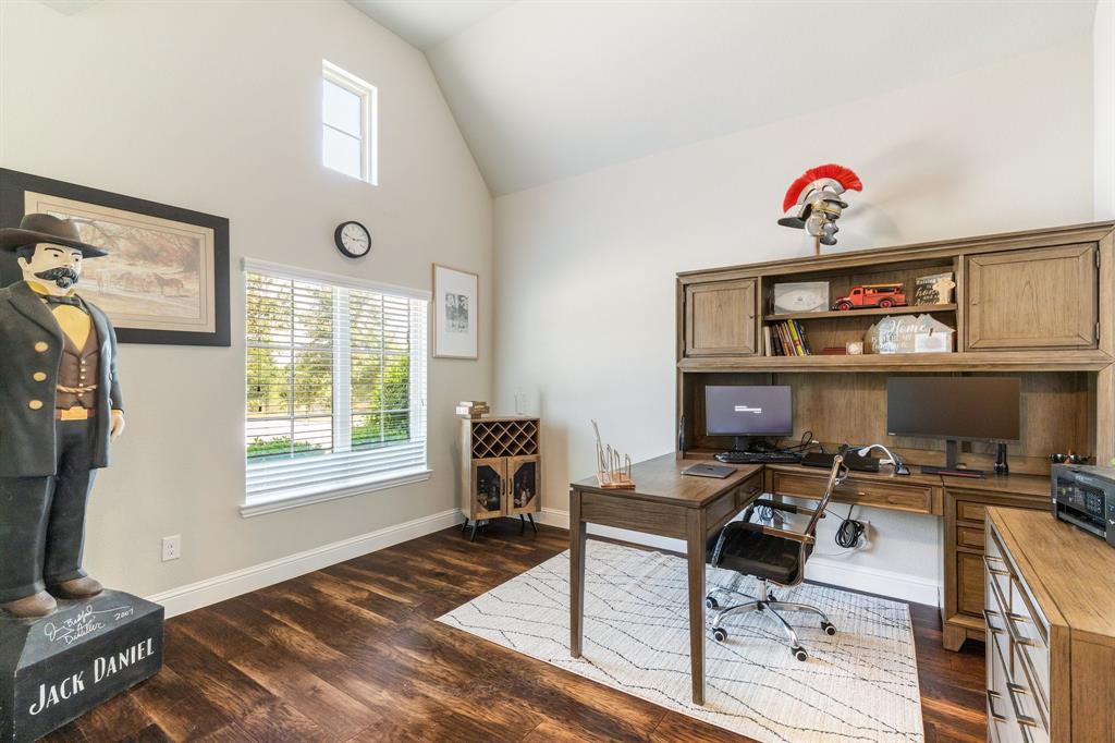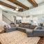 The main living area is defined by soaring ceilings with decorative beams, creating a striking focal point in the open-concept layout. The kitchen features double ovens, quartz countertops, a large island, and abundant storage, combining function and style. All bedrooms are located on the first floor, along with a dedicated office for added flexibility.