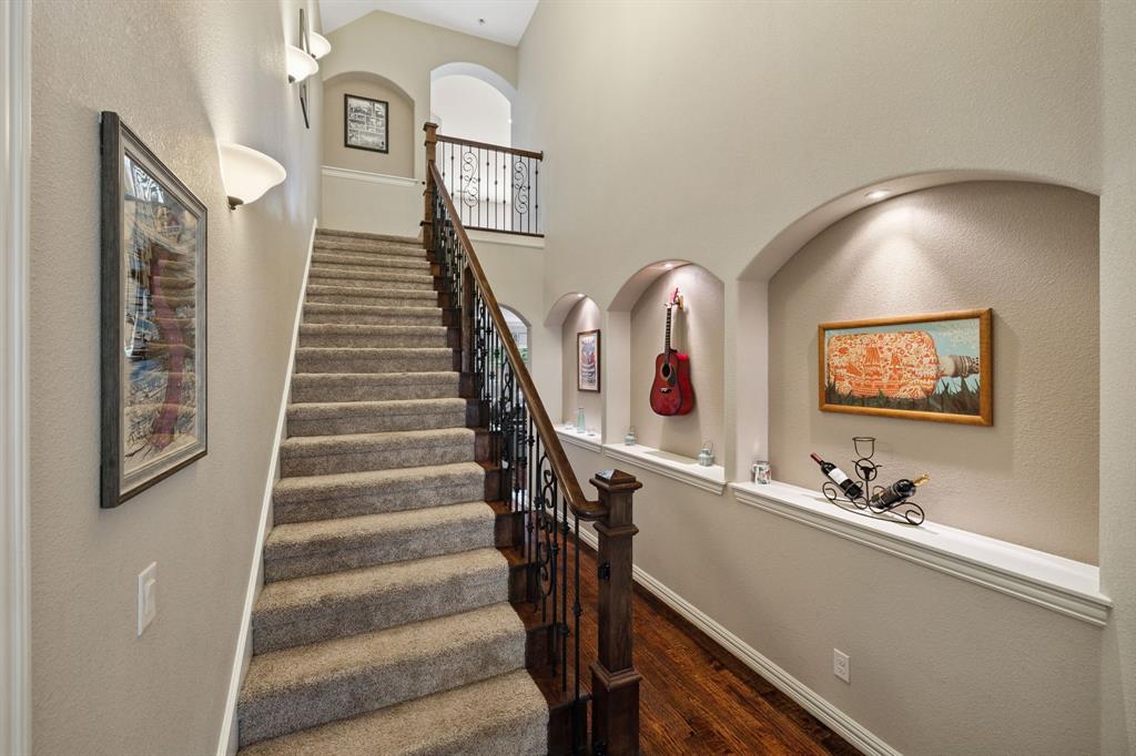 Just steps from the shores of Grapevine Lake, this exceptional Flower Mound home is a rare blend of luxury, comfort, and outdoor living. From the moment you walk in, you're greeted by rich hand-scraped hardwood floors, soaring ceilings, and an elegant wrought iron staircase that sets the tone for the rest of the home. Natural light pours through the expansive windows, highlighting the home’s thoughtful layout and high-end finishes.