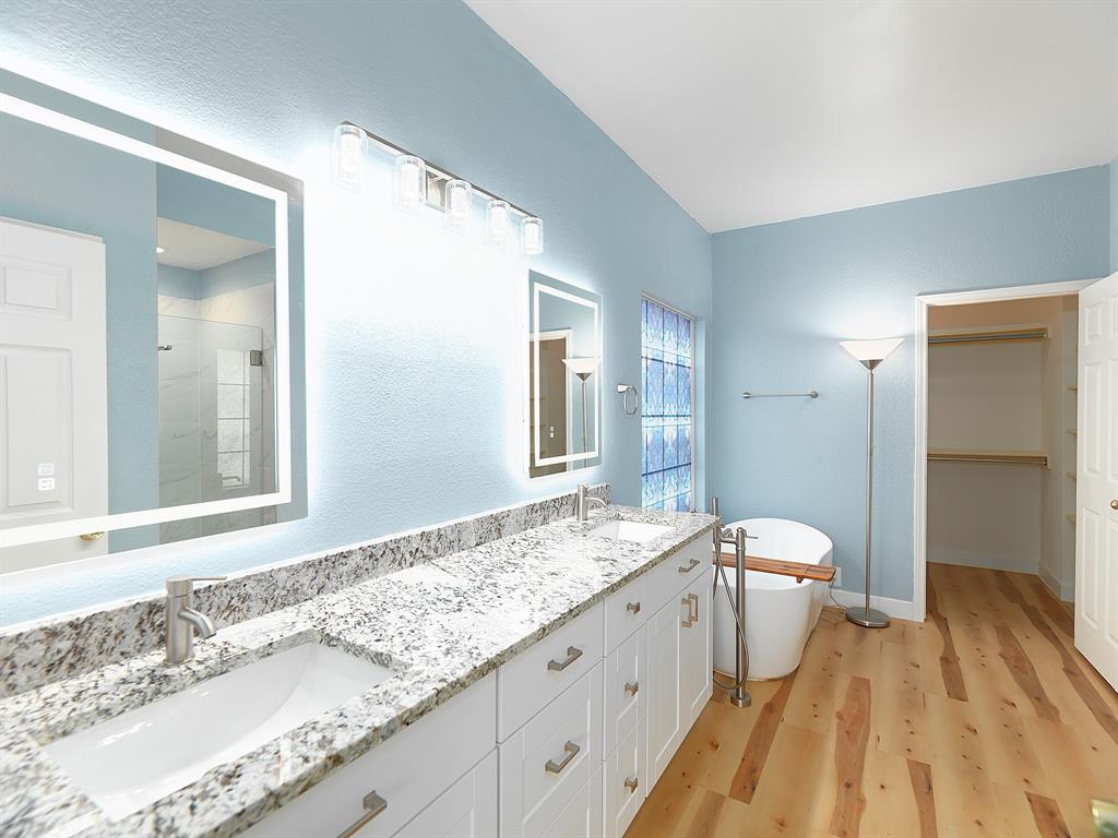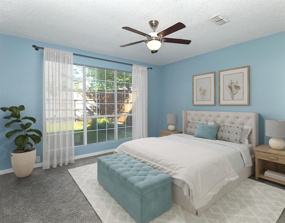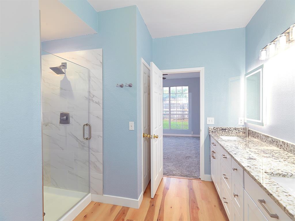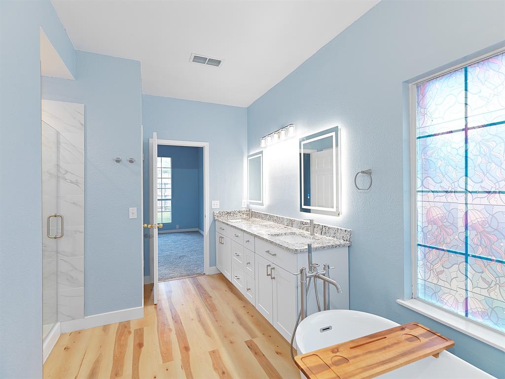 Welcome to this 4-bedroom, 2.5-bath home, a rare opportunity in the established Timber Creek neighborhood of Flower Mound. This is your chance to make it your dream home and add your unique personal style! Surrounded by mature trees, this home features a bright and inviting living room with floor-to-ceiling windows and new luxury vinyl plank flooring. The eat-in kitchen has granite counters and a gas stove, and the first-floor primary suite boasts a beautiful, newly updated, spa-like en suite bath with dual vanities, a soaking tub, and a separate shower. Upstairs offers three more bedrooms, a full bath, and a flex area that's perfect for a playroom, home office, or lounge space. The neighborhood has no HOA, giving you the freedom to create your dream backyard space. A new front yard landscape adds to the home's great curb appeal.