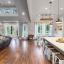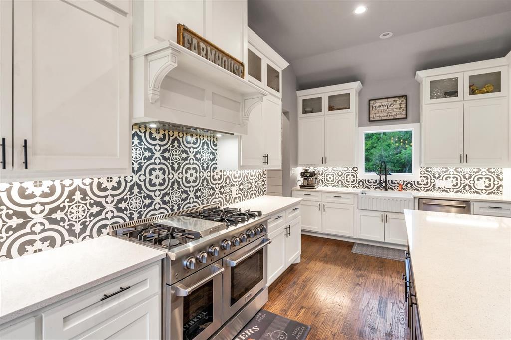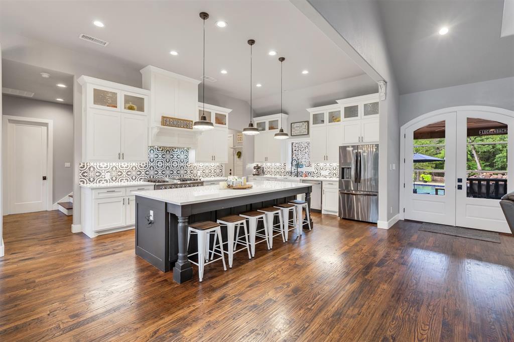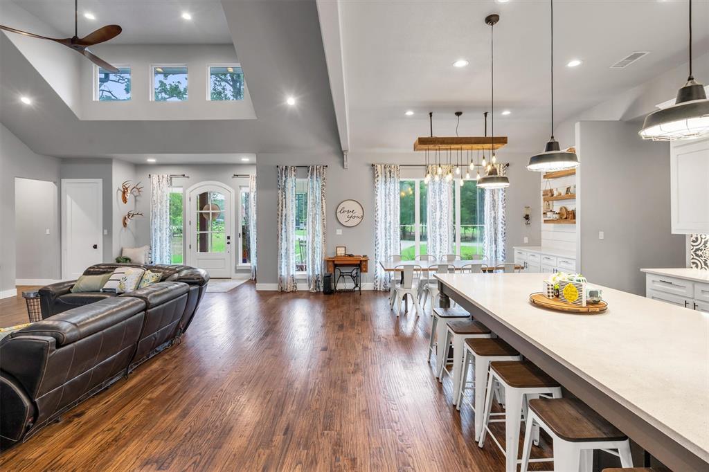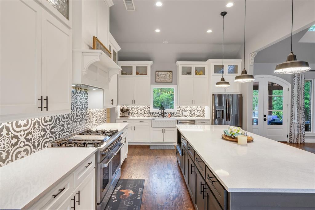 The heart of the home is the gourmet kitchen, complete with an oversized island and a chef’s dream stove with double ovens—perfect for cooking, entertaining, and gathering. The open floor plan with hardwood floors creates a warm and inviting atmosphere, while large windows bring in plenty of natural light and showcase the peaceful, wooded surroundings.