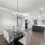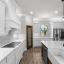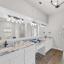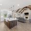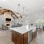 The kitchen is a showstopper with crisp white cabinetry, quartz countertops, a massive island with rich wood detailing, double ovens, and a walk-in pantry with a glass door. Open sightlines connect seamlessly to the dining area and living space, making this the true heart of the home.