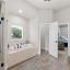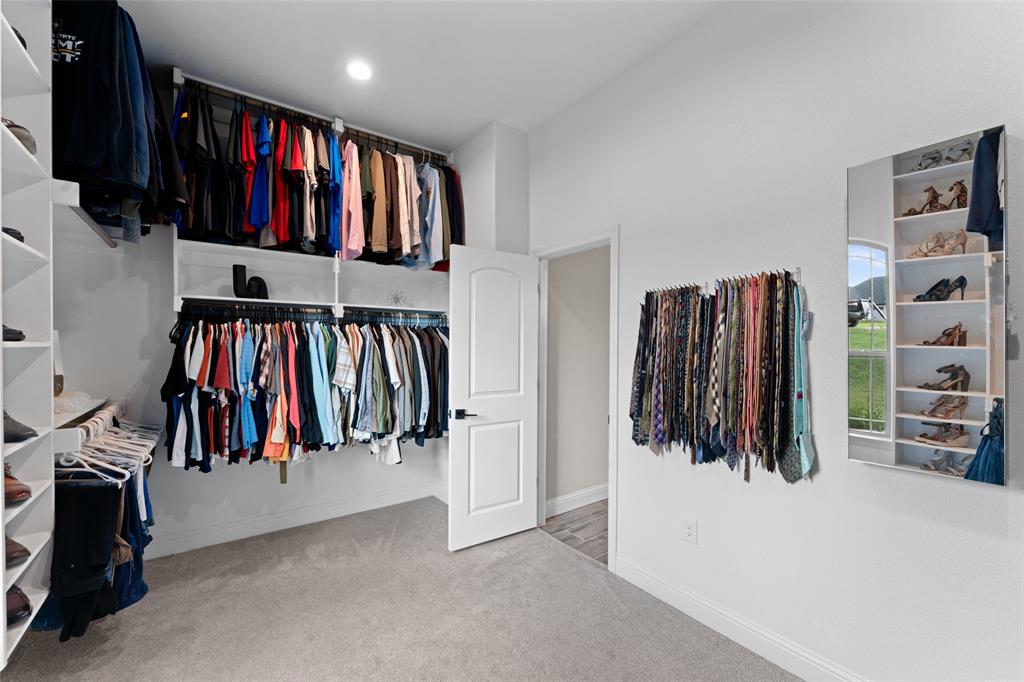 The primary suite is a retreat of its own, featuring a tray ceiling, spa-like bath with dual vanities, soaking tub, and walk-through shower, plus a custom walk-in closet with built-ins for ultimate organization. Secondary bedrooms are generously sized, and the laundry room with extra cabinetry and patterned tile adds both function and style.
