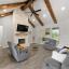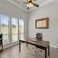 The foyer opens to a dedicated office framed by French doors, perfect for working from home. Just beyond, the living room stuns with vaulted ceilings, rustic wood beams, and a floor-to-ceiling stone fireplace. Oversized windows flood the home with natural light, offering peaceful views of the surrounding greenery.