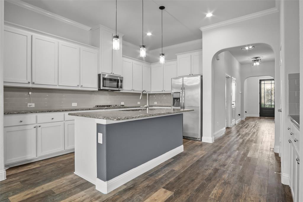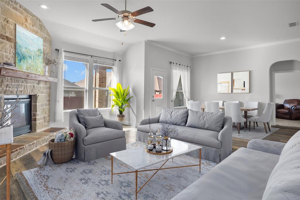 This spacious single-story home is designed for both comfort and style, featuring open-concept living with a cozy corner fireplace, dining area, and a gourmet kitchen with an island, granite countertops, tiled backsplash, stainless steel appliances, gas cooktop, and walk-in pantry.