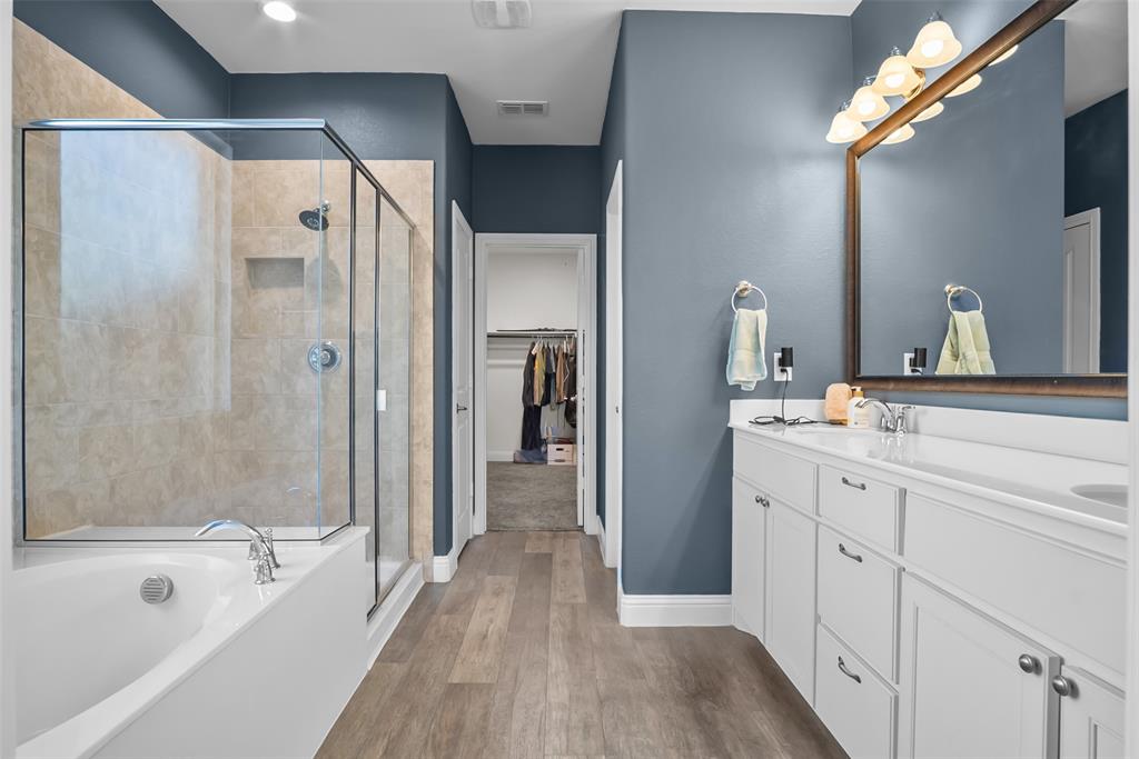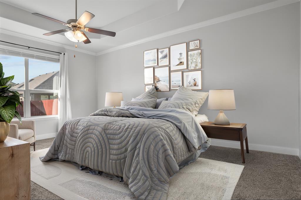 The primary suite is a true retreat with a dual sink vanity, oversized shower, and a large walk-in closet. The thoughtfully chosen designer package includes laminate wood throughout the home—carpet in bedrooms only!