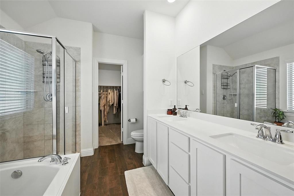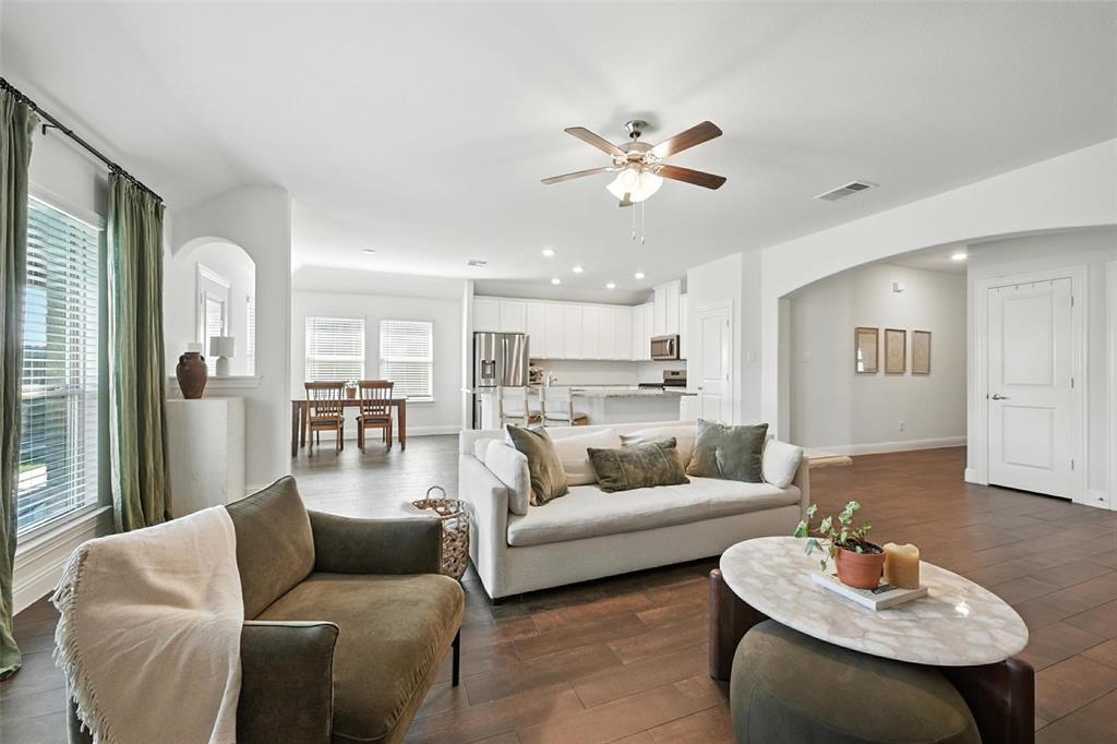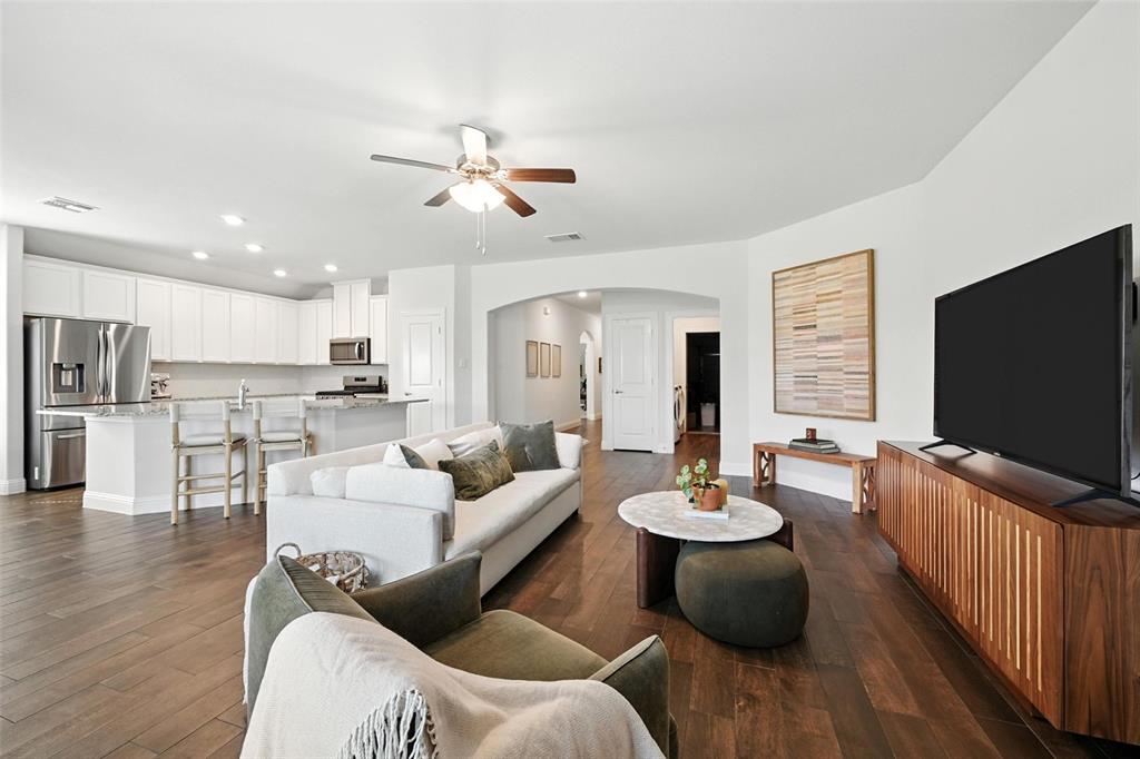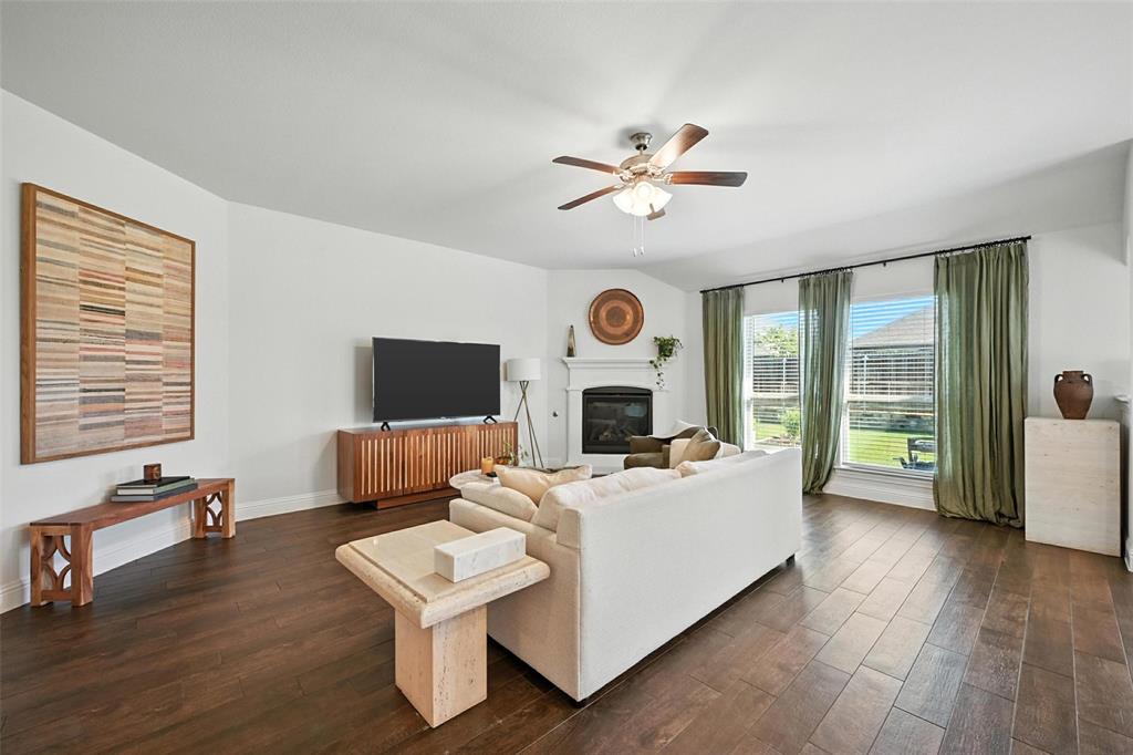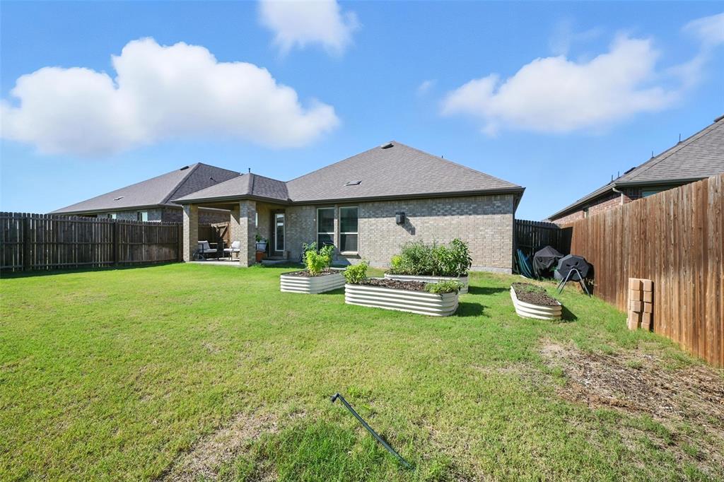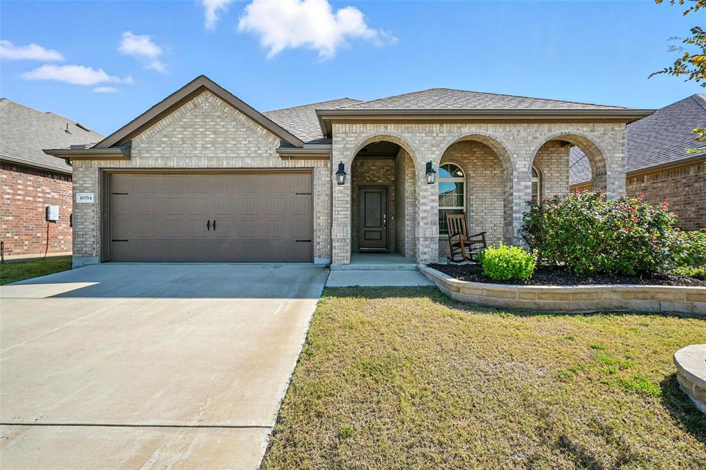 Welcome to this immaculate NORTH FACING 3 bedroom 2 bath, open floor plan with a wonderful front porch for those Texas sunset evenings.This single-Story home in the heart of this master planned community of Silverado and with in walking distance to the New Elementary! The heart of the home is a chef’s kitchen complete with granite countertops, stainless steel appliances, a spacious center island with eat in bar seating, a gas range, and an oversized walk-in pantry. The adjoining living room features a cozy gas fireplace and abundant natural light—perfect for both everyday relaxation and entertaining. The primary suite is a private retreat with large windows, a soaking tub, separate shower, dual vanities, and a walk-in closet. Two additional bedrooms and a second full bath provide ample space for family, guests, or home office needs. Upgraded front landscaping as well as epoxy garage for the added touch. Step outside backyard on your covered back patio to a automatic garden to grow your own vegetables or flower garden.