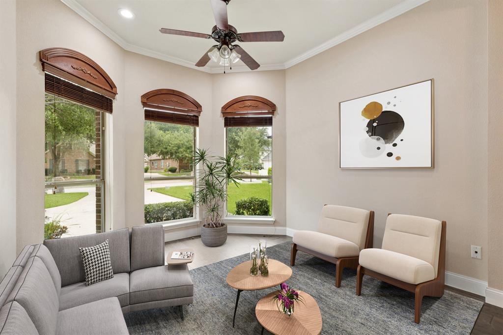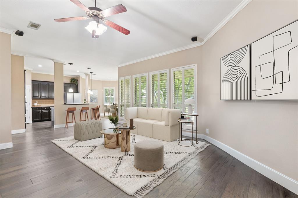 Beautifully situated on a quiet, gated street overlooking Iron Horse Golf Course, this stunning 3-bedroom, 3-bath home offers the perfect blend of space, comfort, and scenic surroundings. With golf course views from the primary suite, living room, and kitchen, every day feels like a retreat. Inside, the home boasts a bright, open layout designed for both relaxation and entertaining. The spacious eat-in kitchen features a breakfast bar, built-in appliances, ample cabinetry, and a sunny breakfast nook that flows seamlessly into the oversized living area. Formal living and dining rooms add versatility and elegance for hosting gatherings. The serene downstairs primary suite is a private escape with dual vanities, a jetted tub, separate shower, and a generous walk-in closet. A sweeping staircase leads to two large secondary bedrooms and a full bath, while the study offers the flexibility of a fourth bedroom. Enjoy even more space with the expansive backyard, beautifully landscaped and complete with a large covered porch, that provides the perfect setting for outdoor dining, relaxation, or entertaining while taking in the lush surroundings. Located in a desirable area, this home combines the tranquility of golf course living with easy access to shopping, dining, and major highways. Spacious inside and out, it delivers the lifestyle you’ve been searching for. Don’t miss this welcoming gem—schedule your showing today! 3D tour available online.